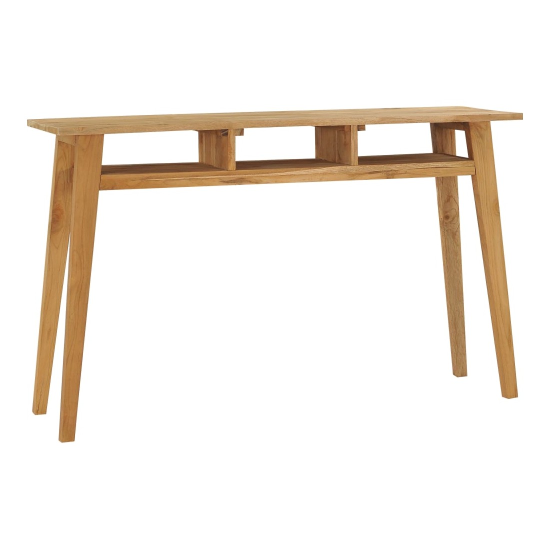 Cette table console de style colonial dégage un charme rustique et fait un excellent supplément à votre intérieur. Elle peut également être utilisée comme meuble console ou buffet. La table de couloir, de couleur naturelle, est fabriquée à partir de bois de teck massif avec une finition naturelle, ce qui la rend très durable et résistante à l'usure. Le dessus en bois dur robuste vous offre de l'espace pour mettre des paniers de fruits, des cadres photo ou d'autres objets décoratifs. Équipée de 3 étagères ouvertes, cette table en bois offre amplement d'espace pour placer des petits objets bien organisés et à portée de main. Remarque importante : les couleurs et les grains peuvent varier d'une pièce à l'autre, rendant chaque table unique ; la livraison est aléatoire.