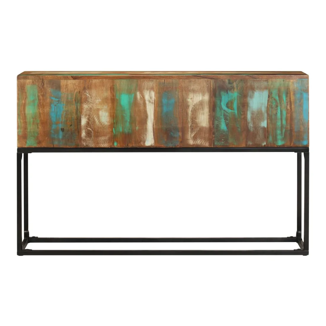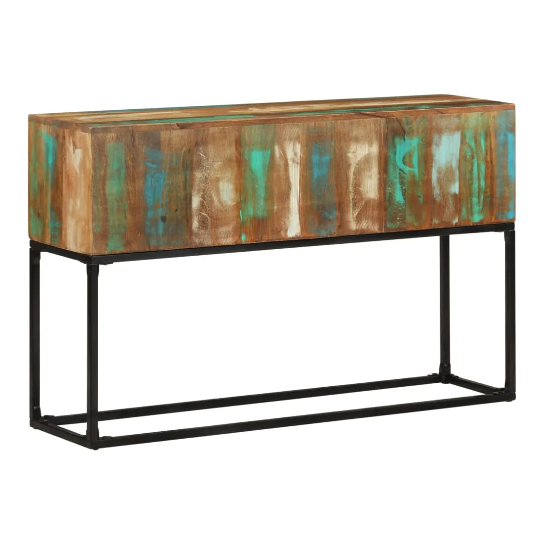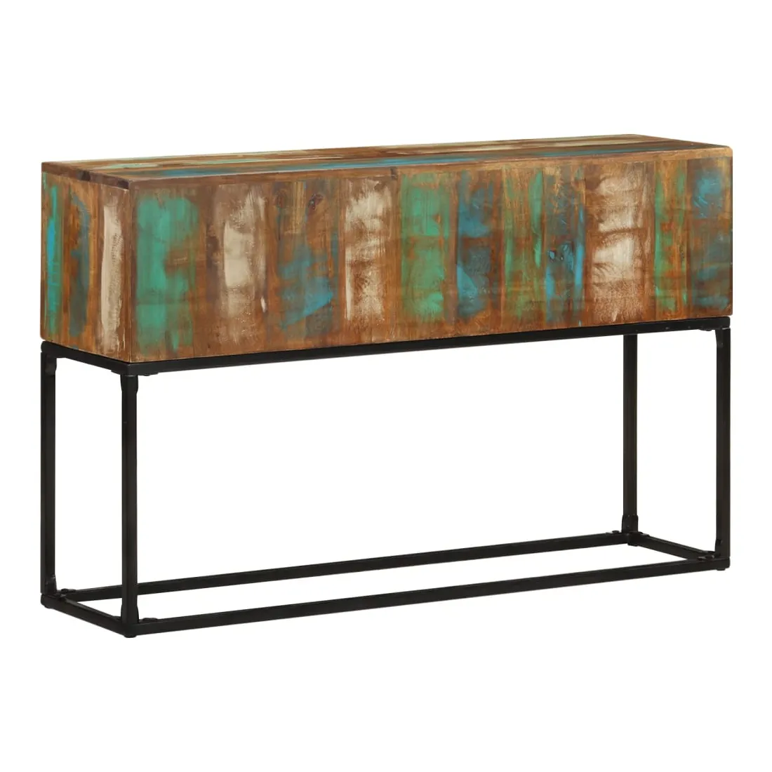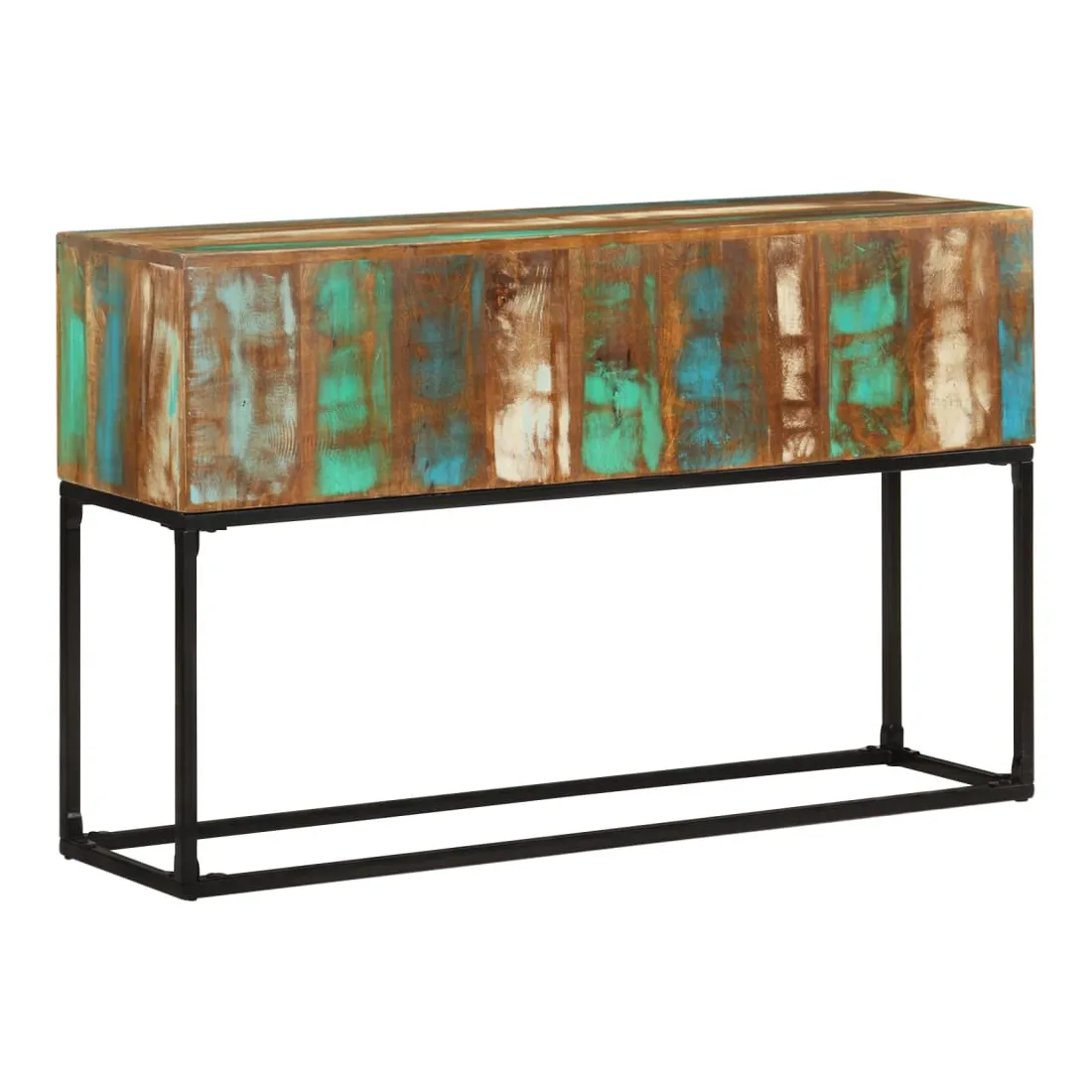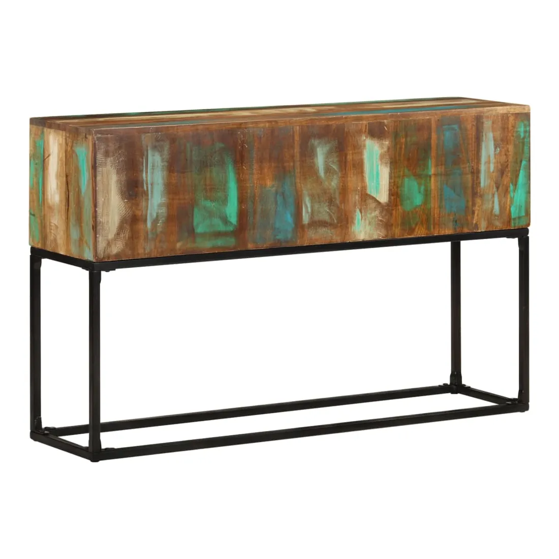 Introduisez un air de charme industriel à votre espace de vie avec notre élégante table console en bois ! Cette table d'entrée est fabriquée à la main à partir de bois de récupération massif, une combinaison de bois de récupération comprenant du teck, du bois de manguier, du pin, du hêtre, etc. Ces bois sont recyclés à partir d'anciens bâtiments tels que des usines, des hangars et des bateaux. Cela en fait une option écologique fantastique dans la fabrication de meubles. Comme chaque pièce est faite à la main, les couleurs varient avec de nombreuses nuances de bleu, de vert, de crème et parfois d'orange, de rouge et de rose révélées. Cela signifie même que chacun est unique ! De plus, ses pieds en fer enduit de poudre ajoutent à la stabilité de la table ainsi qu'à son charme industriel. Remarque importante : les couleurs varient d'une pièce à l'autre, rendant chacune de nos tables d'appoint unique. La livraison est aléatoire, ce qui garantit l'exclusivité et l'individualité de votre produit.