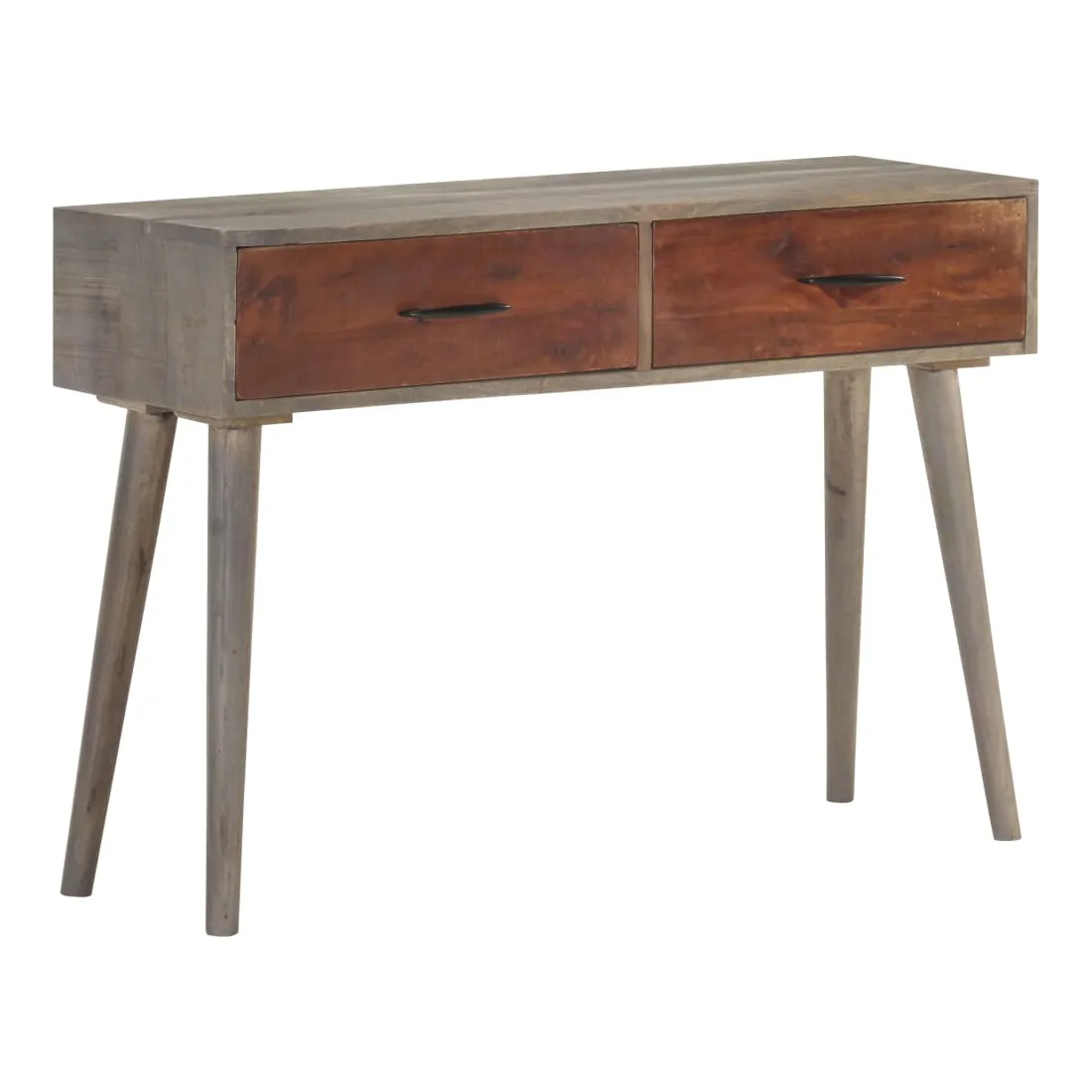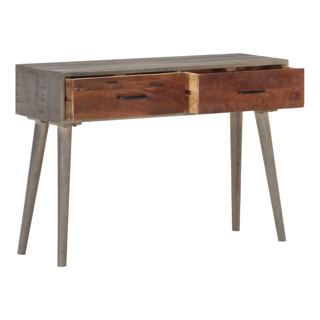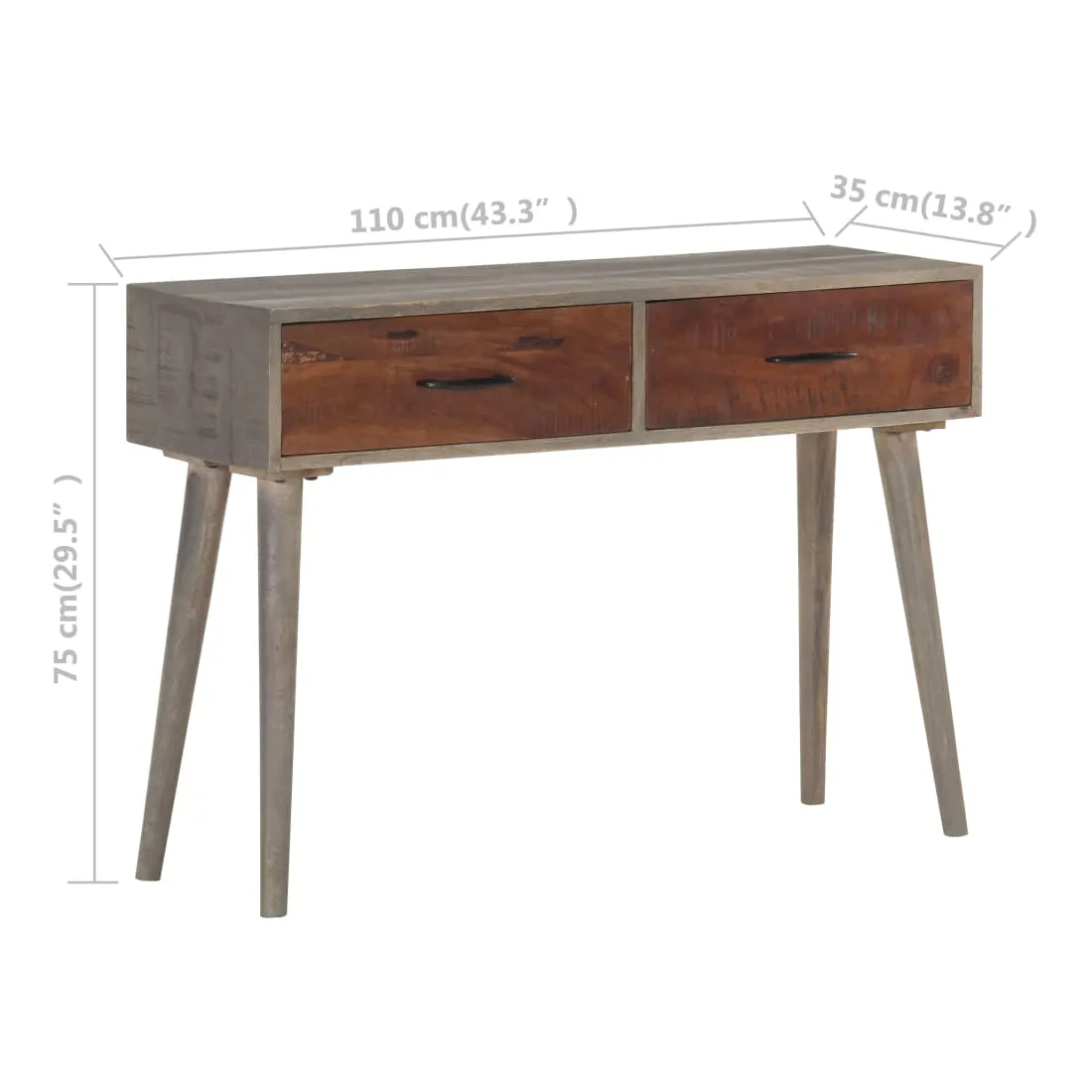 Cette table console en bois sera un complément pratique à votre salon, salle à manger, couloir, etc. Vous pouvez également la placer sous un miroir. La table d'entrée est en bois de manguier massif, un bois dur tropical. Il a la force de soutenir le poids et résiste également à l'usure du temps. De plus, le savoir-faire exquis et les beaux grains de bois rendent chaque pièce légèrement différente l'une de l'autre. Cette table d'appoint dispose de 2 tiroirs, offrant un espace de rangement suffisant pour les petits objets comme les clés, les blocs-notes, les stylos et autres bibelots. En outre, cela aide à garder votre pièce bien rangée. Le dessus de table robuste est idéal pour afficher des objets décoratifs, des cadres photo ou des plantes en pot. Remarque importante : Les couleurs varient d'une pièce à une autre, rendant chacune d'elle unique ; la livraison est aléatoire.