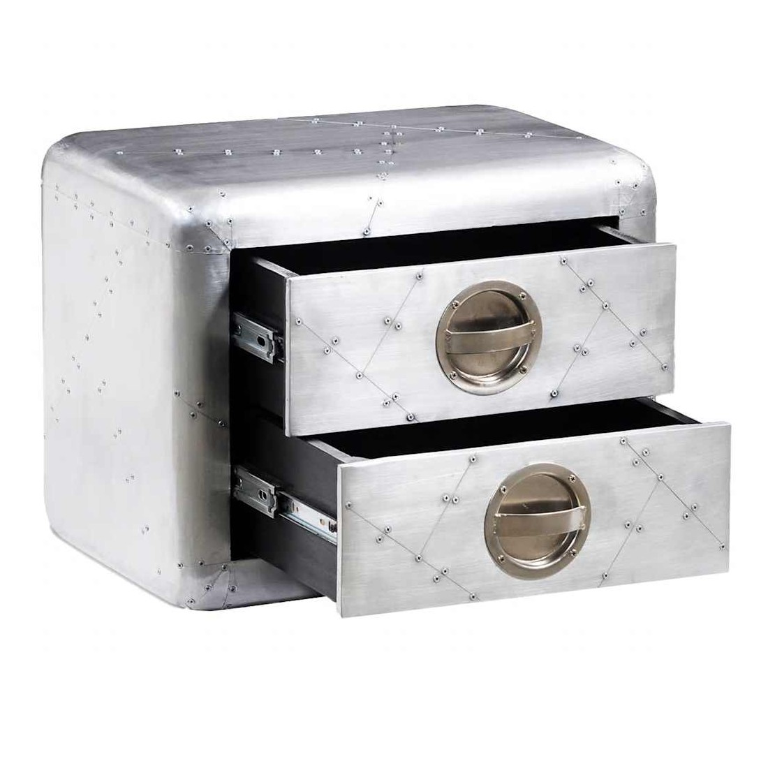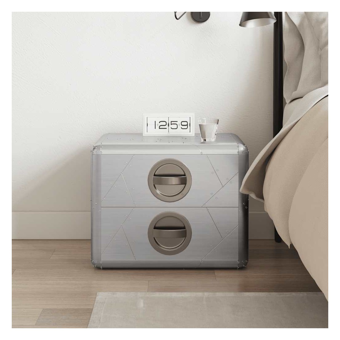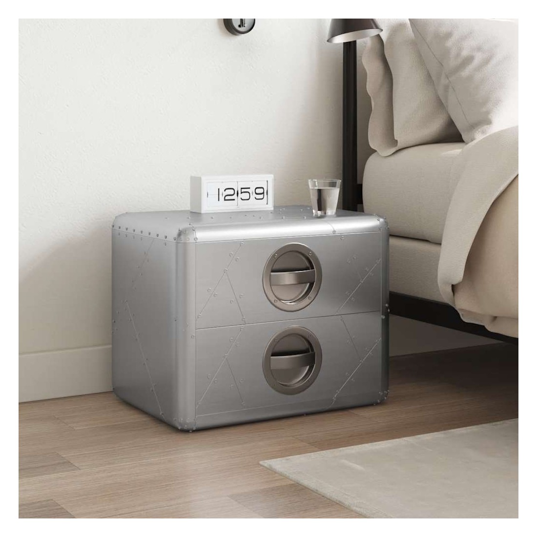 Cette table d'appoint de haute qualité peut être placée dans n'importe quelle pièce. Grâce au design élégant et compact, elle peut également être utilisée comme une table basse, une table de chevet, une table d'extrémité, etc. Cette table d'appoint a deux tiroirs pour les petits objets comme les clés, bloc-notes, stylos et autres bibelots. Le dessus de table peut être utilisé pour placer de la nourriture ou des boissons ou pour exposer des objets décoratifs comme des cadres photo, ou même des plantes en pot. Cette table d'appoint est en bois massif et sa surface est revêtue d'un patchwork de panneaux en aluminium poli, rehaussés de vis en acier exposées, ce qui la rend extrêmement durable. Les bords lisses et les poignées de tiroir rétro donnent à la table d'appoint un aspect unique.