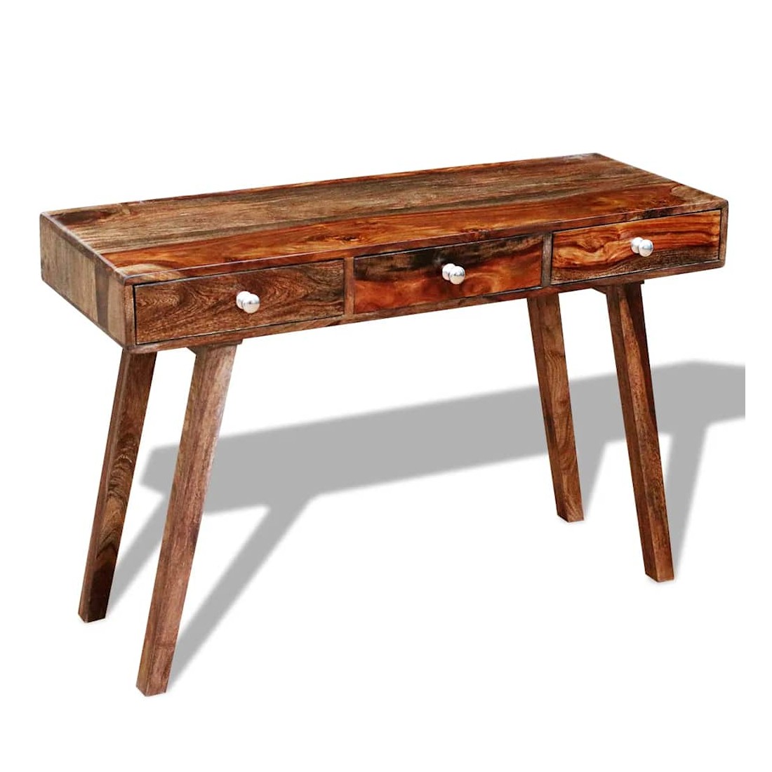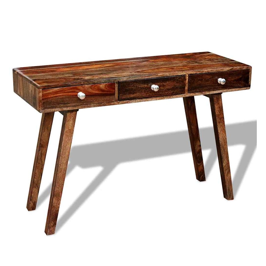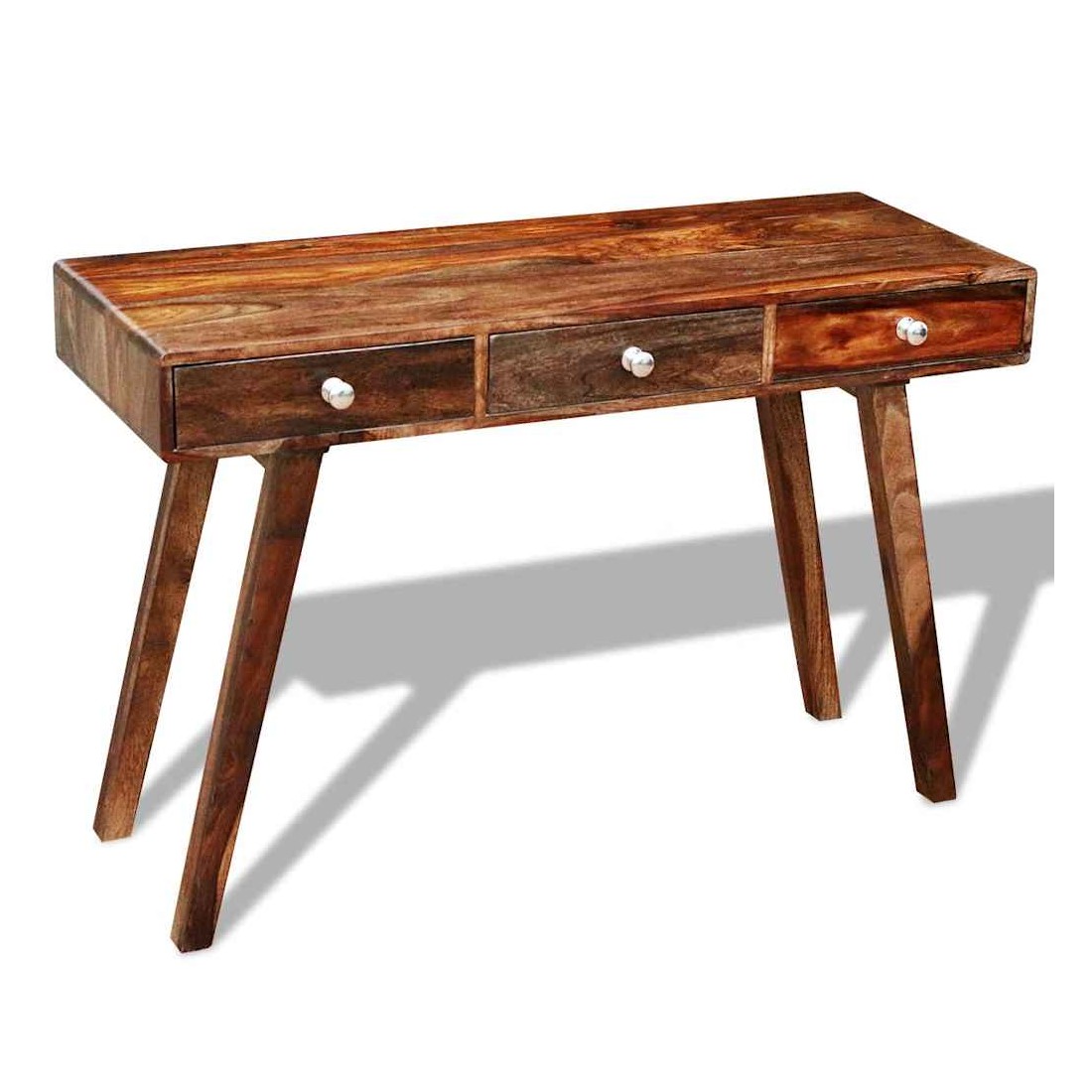 Ce buffet vintage en bois est à la fois élégant et pratique. Il peut également être utilisé comme table console ou armoire console. Le design élégant fera de ce buffet un point attrayant de n'importe quelle pièce. Ce buffet a un dessus vigoureux, sur lequel vous pouvez placer des articles décoratifs comme des paniers de fruits ou des vases. Ses 3 grands tiroirs vous offrent un espace de rangement supplémentaire pour vos ornements, cosmétiques et autres effets personnels. Cette table de chevet est faite de bois massif. Il est un bois dur tropical qui est bien connu pour ses grains riches et aussi connu sous le nom de palissandre ou de bois de rose. Elle est entièrement faite à la main et les beaux grains de bois rendent chaque pièce unique et légèrement différente l'une de l'autre. Les pieds en bois contribuent à la construction robuste. Remarque importante : les couleurs varient d'une pièce à l'autre, rendant chaque pièce unique. La livraison est aléatoire, garantissant l'exclusivité et l'individualité de votre produit.