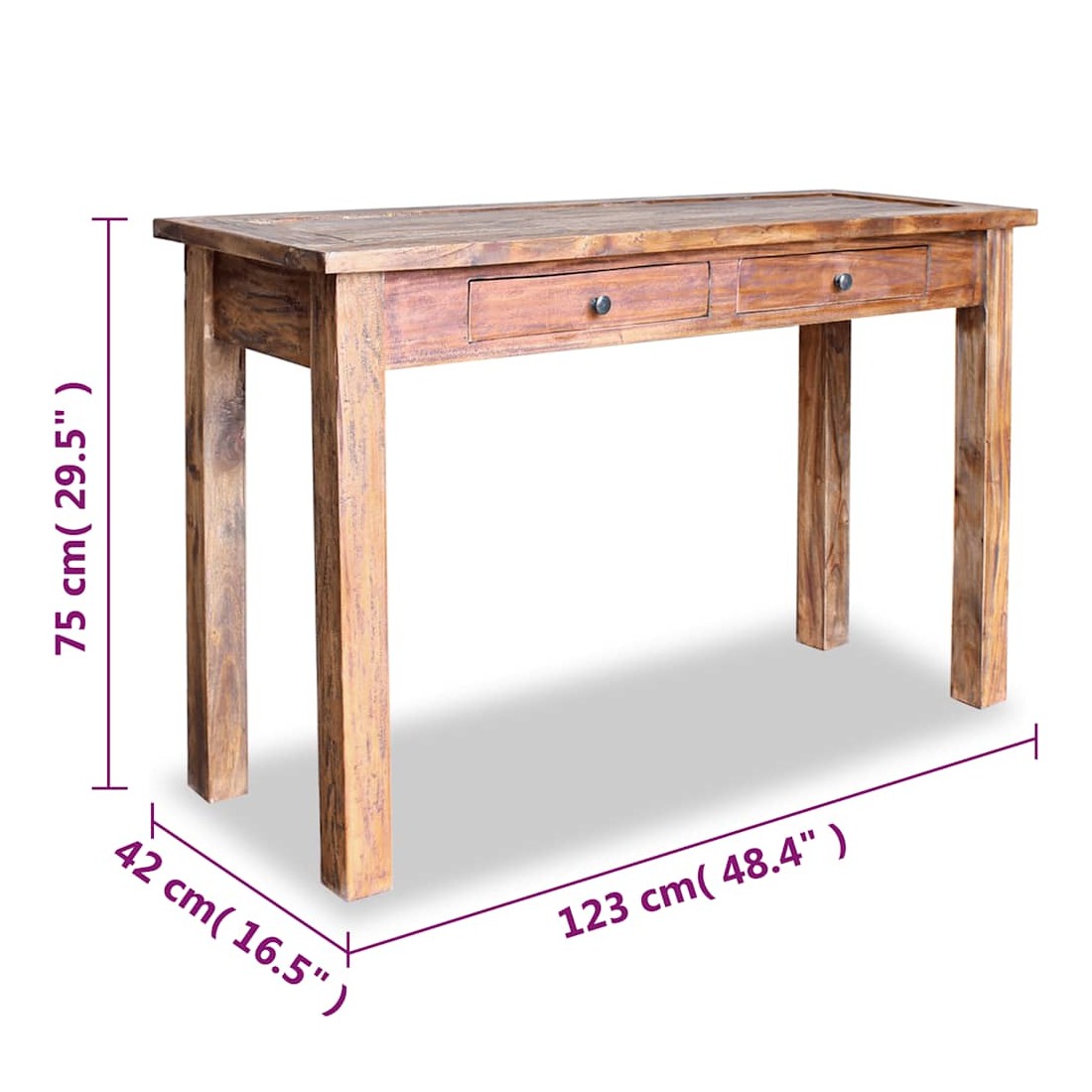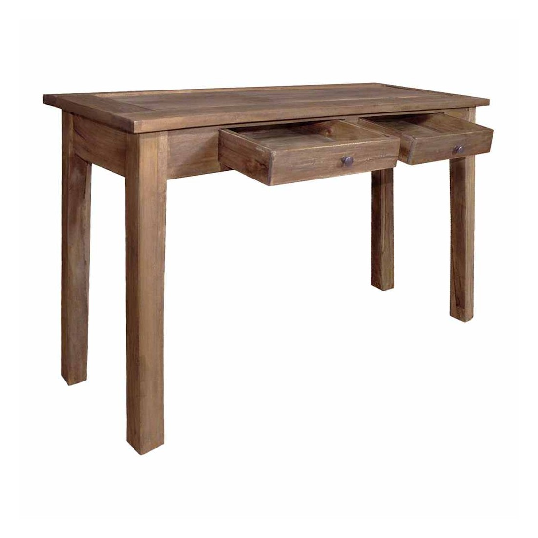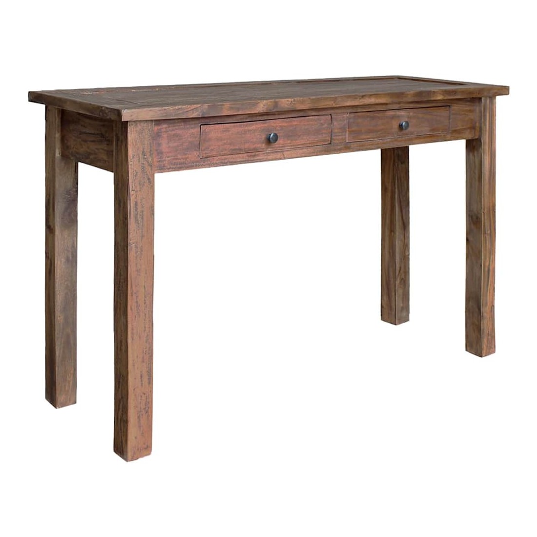 Cette table console sera un choix parfait si vous cherchez à ajouter une touche de charme rustique à votre décor. La table dispose de 2 tiroirs qui offrent un espace de rangement suffisant. Fabriquée en bois massif d'acajou, cette table console en bois massif est extrêmement durable et robuste. L'acajou est un bois dur tropical qui se distingue par sa beauté, sa durabilité et sa couleur. Un savoir-faire spécial a été utilisé pour donner à cet article un aspect vintage, chaleureux et authentique. Chaque pièce du mobilier est unique et légèrement différente de l'autre. Les signes d'usure donnent à chaque pièce un look unique et s'ajoutent à son style vintage spectaculaire. Comme elle est faite de bois récupéré, le produit peut présenter des imperfections qui reflètent sa valeur authentiq