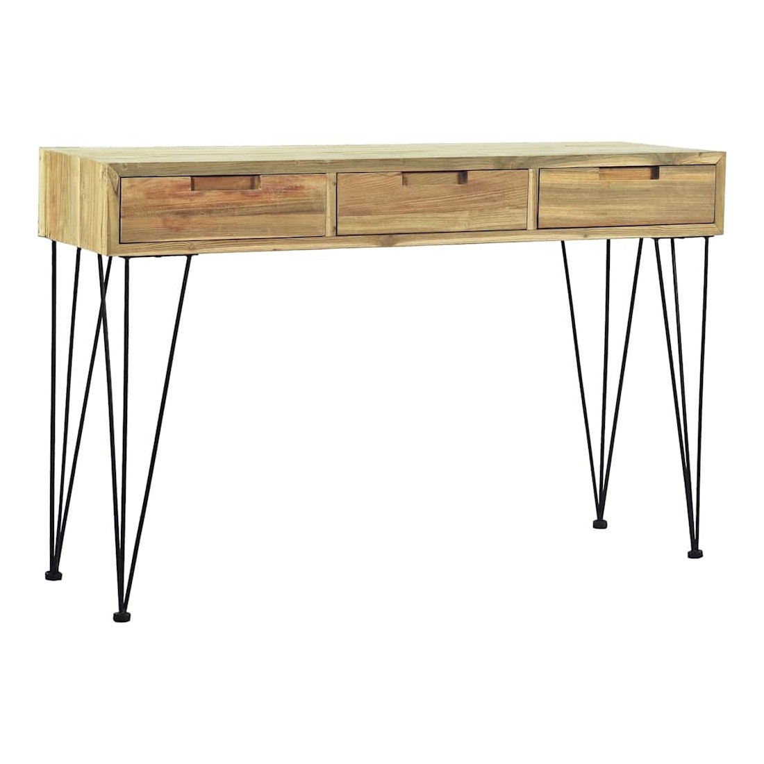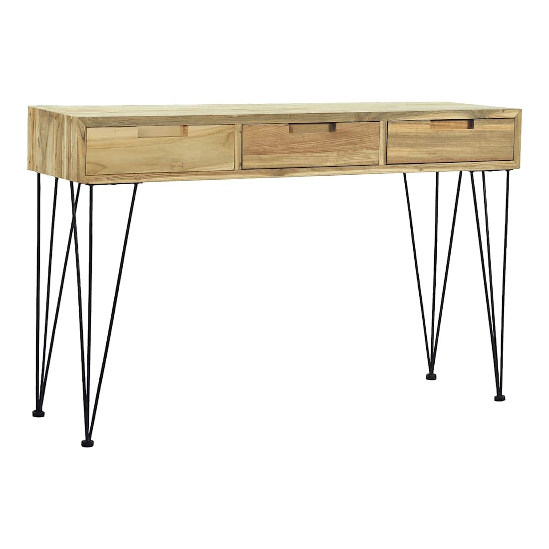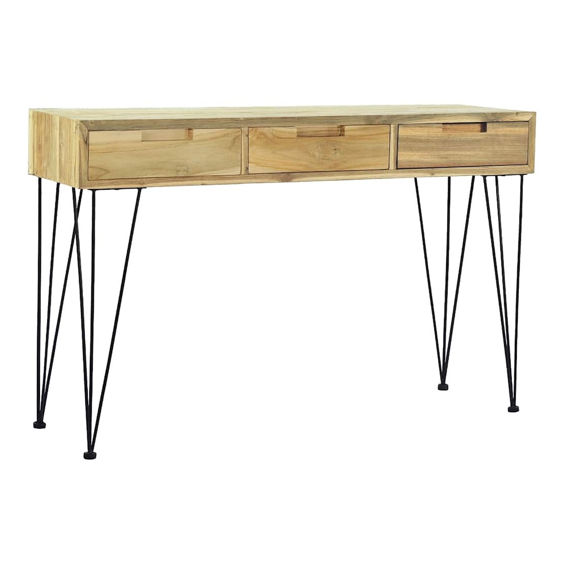 Cette table console de style colonial en teck massif recyclé ajoutera une touche de charme rustique à votre intérieur. Elle peut également être utilisée comme table d'appoint, bureau ou buffet. La table dispose d'un dessus de table en bois dur robuste, sur lequel vous pouvez placer des objets décoratifs comme des paniers de fruits ou des vases. Les 3 tiroirs offrent amplement d'espace pour garder toutes sortes de petits objets bien organisés et à portée de main. Cette table d'appoint robuste est soutenue par de solides pieds en fer forgé. L'assemblage est vraiment facile. Remarque importante : les couleurs et les grains varient d'une pièce à l'autre, rendant chacune de nos tables consoles unique. La livraison est aléatoire, ce qui garantit l'exclusivité et l'individualité de votre prod