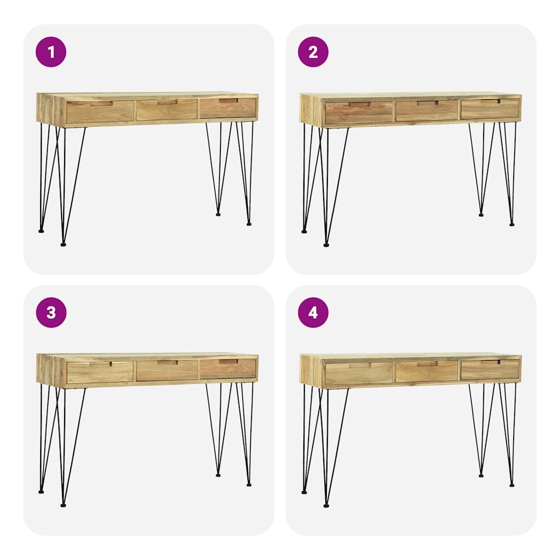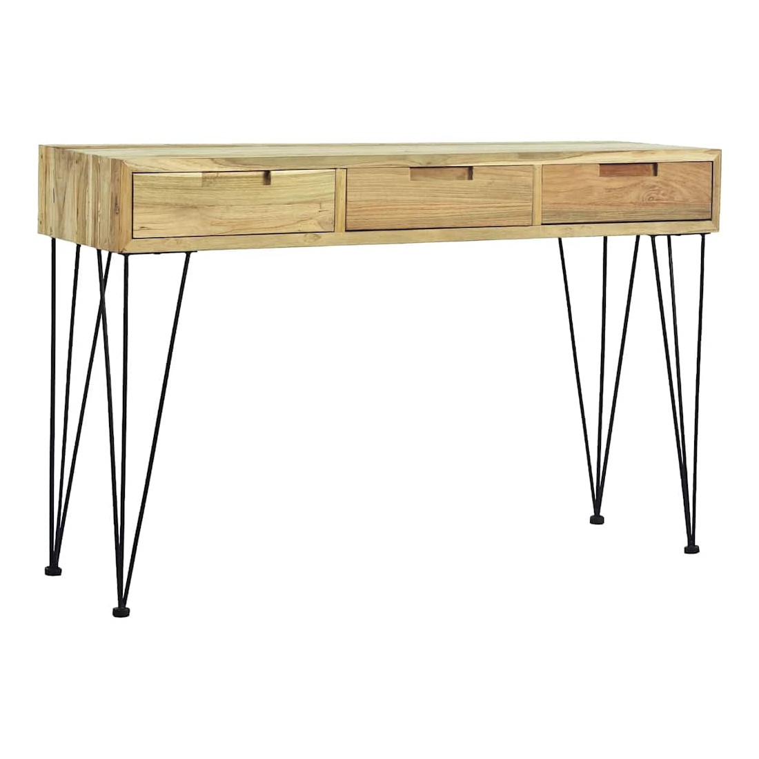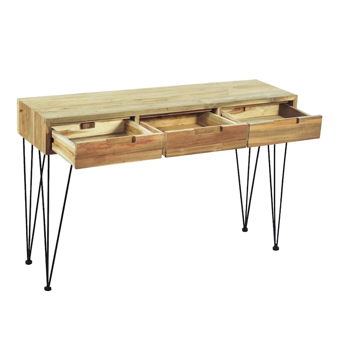 Cette table console de style colonial en teck massif recyclé ajoutera une touche de charme rustique à votre intérieur. Elle peut également être utilisée comme table d'appoint, bureau ou buffet. La table dispose d'un dessus de table en bois dur robuste, sur lequel vous pouvez placer des objets décoratifs comme des paniers de fruits ou des vases. Les 3 tiroirs offrent amplement d'espace pour garder toutes sortes de petits objets bien organisés et à portée de main. Cette table d'appoint robuste est soutenue par de solides pieds en fer forgé. L'assemblage est vraiment facile. Remarque importante : les couleurs et les grains varient d'une pièce à l'autre, rendant chacune de nos tables consoles unique. La livraison est aléatoire, ce qui garantit l'exclusivité et l'individualité de votre prod