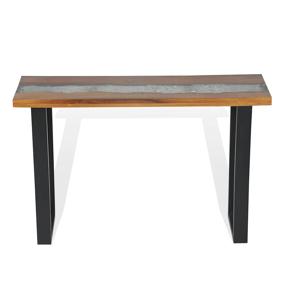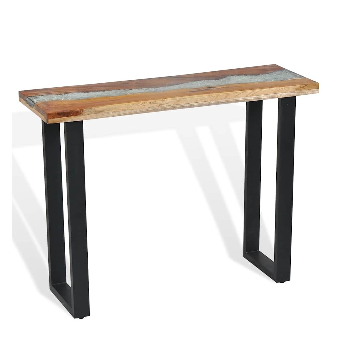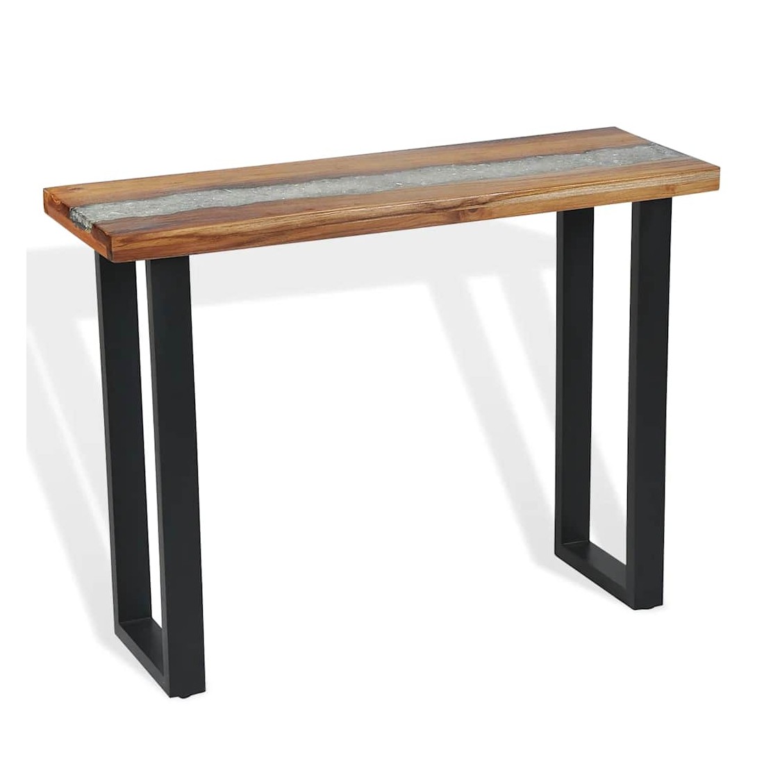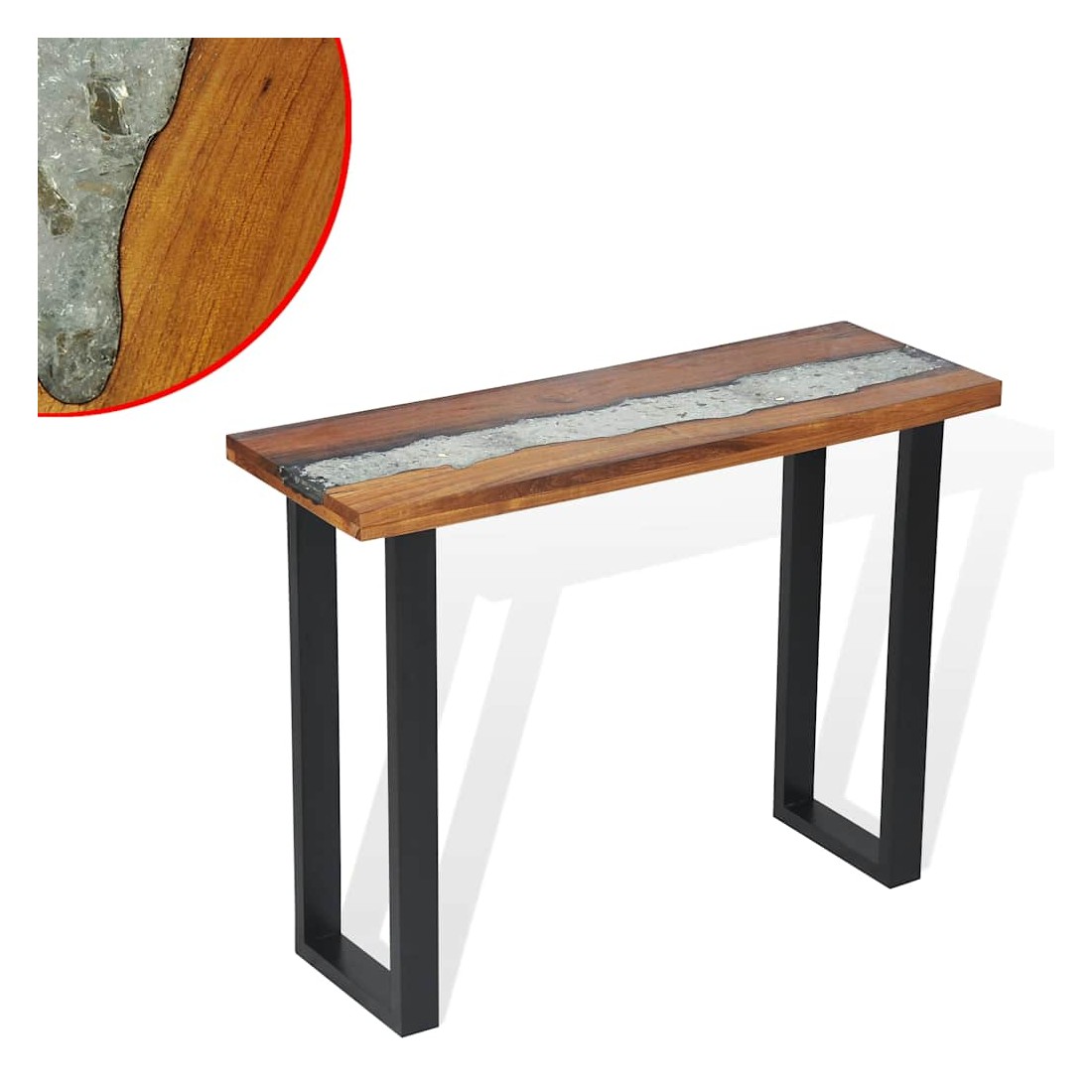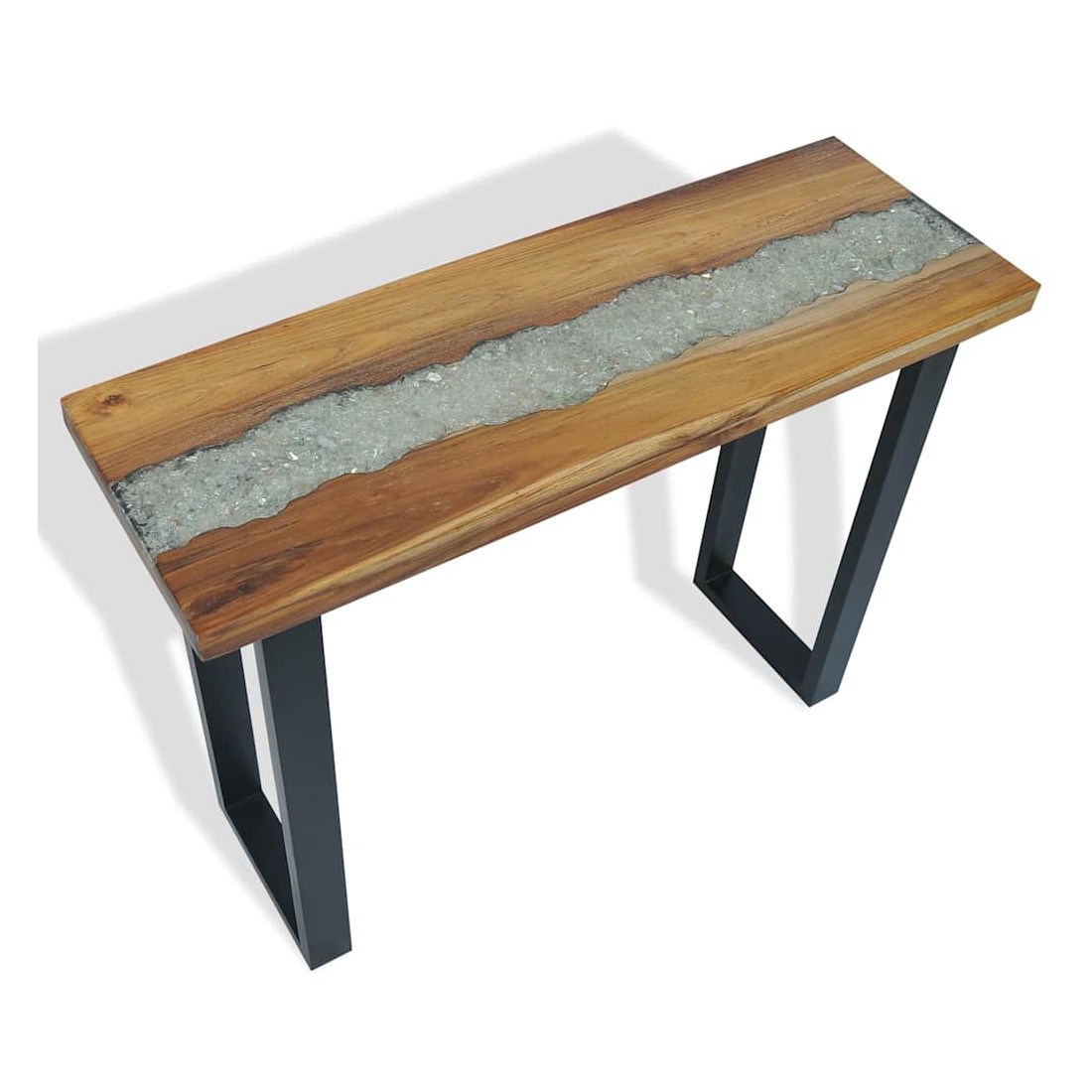 Cette table de console frappante a un design industriel cool qui en fera un ajout distinctif à votre salon. Le dessus de table est fait de teck solide et fournit une surface stable et sécurisée sur laquelle vous pouvez placer vos boissons, vases, paniers de fruits ou objets décoratifs. Il a été donné un incrustation décorative de verre et de résine qui ajoute à son aspect saisissant. Les pieds robustes en acajou rendent cette table basse très stable et durable. L'assemblage est facile. Remarque importante : La couleur et le grain du bois, ainsi que le motif de l'incrustation de résine, varient d'une pièce à l'autre, ce qui rend chacune de nos tables console unique ; la livraison est aléatoire.