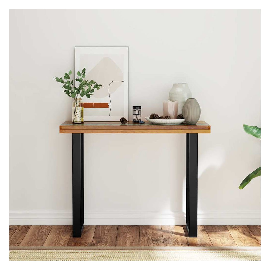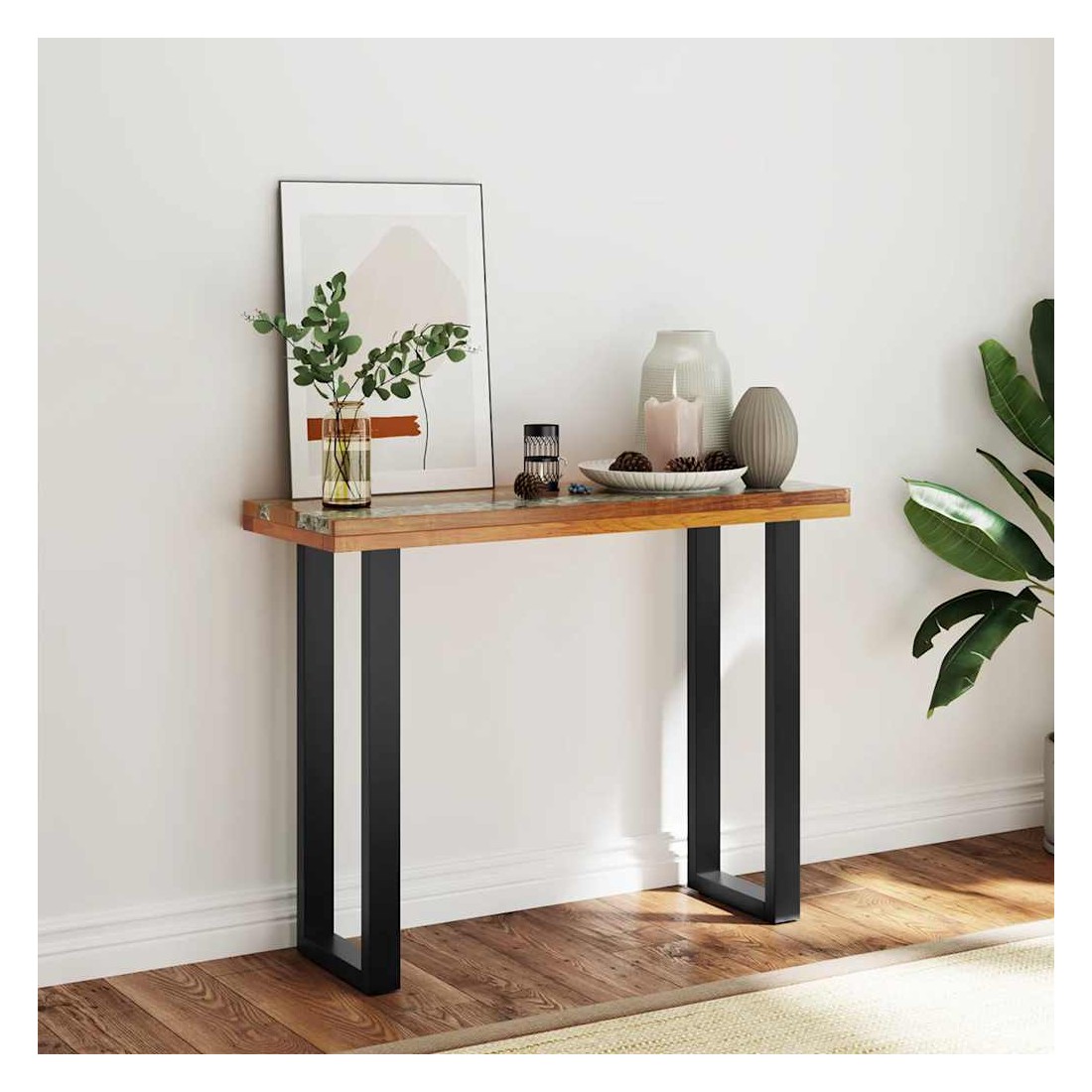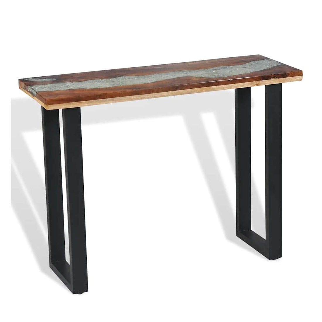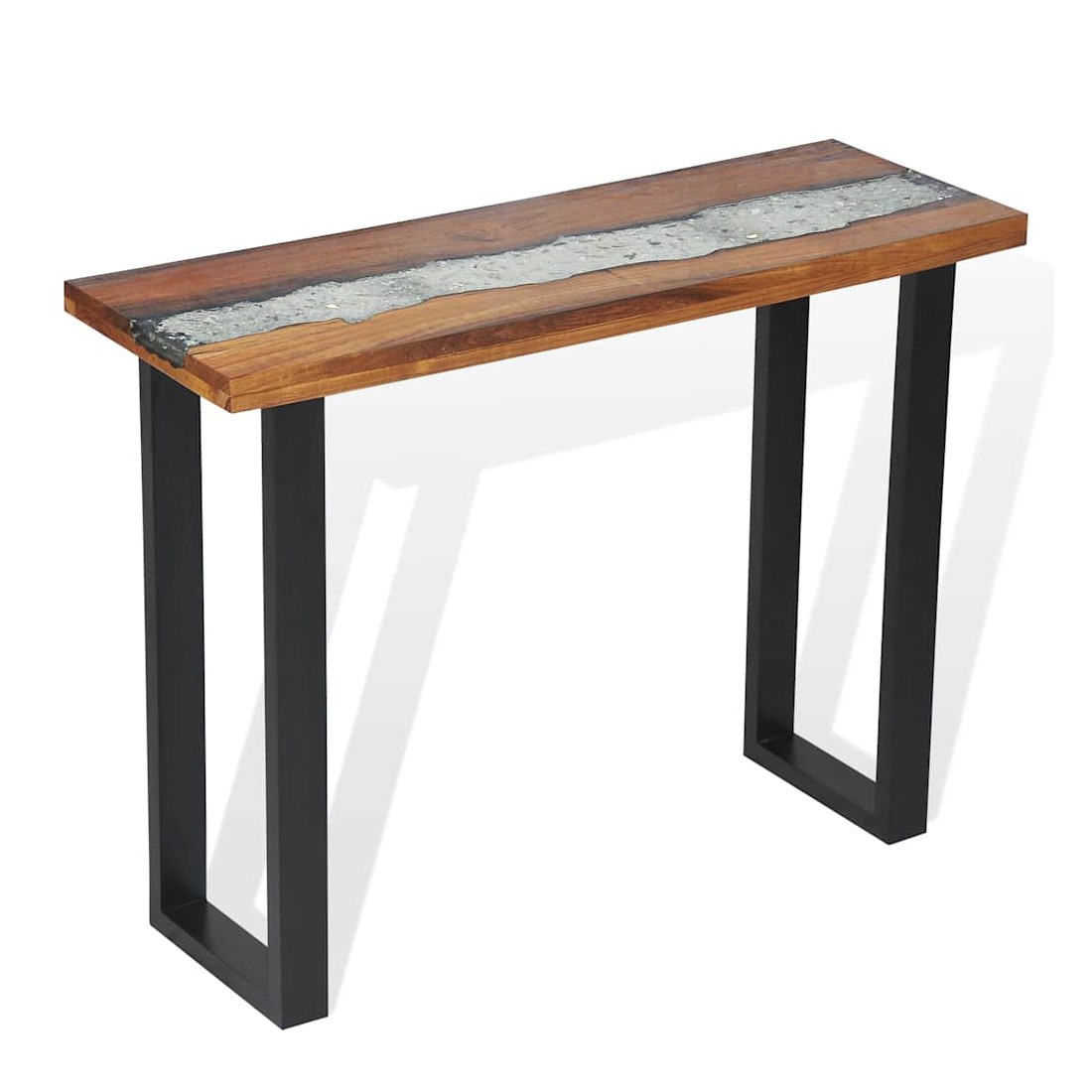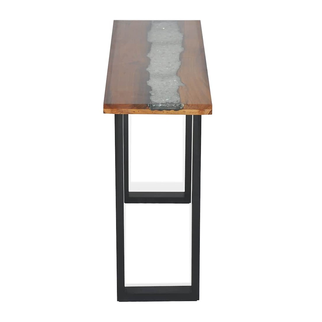 Cette table de console frappante a un design industriel cool qui en fera un ajout distinctif à votre salon. Le dessus de table est fait de teck solide et fournit une surface stable et sécurisée sur laquelle vous pouvez placer vos boissons, vases, paniers de fruits ou objets décoratifs. Il a été donné un incrustation décorative de verre et de résine qui ajoute à son aspect saisissant. Les pieds robustes en acajou rendent cette table basse très stable et durable. L'assemblage est facile. Remarque importante : La couleur et le grain du bois, ainsi que le motif de l'incrustation de résine, varient d'une pièce à l'autre, ce qui rend chacune de nos tables console unique ; la livraison est aléatoire.