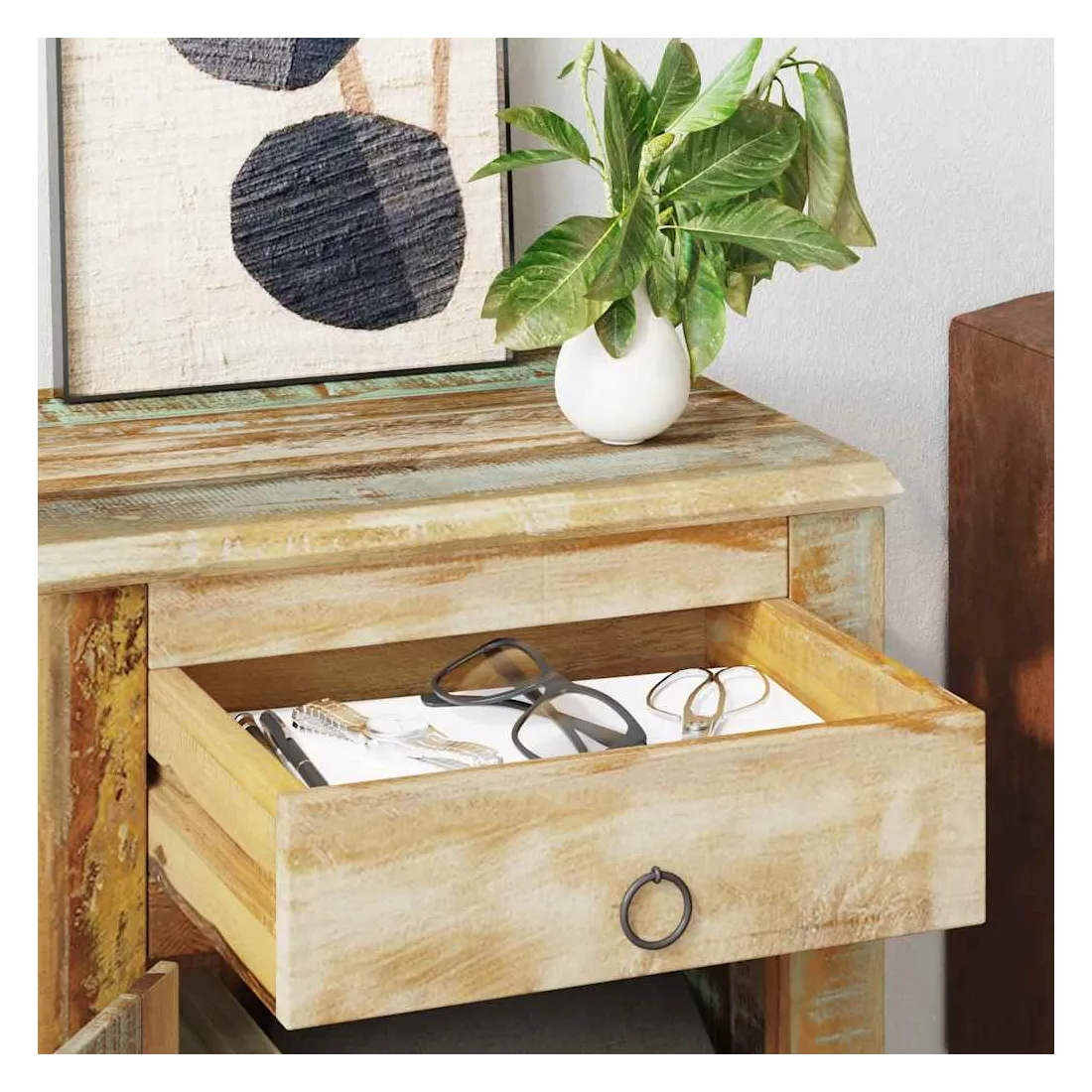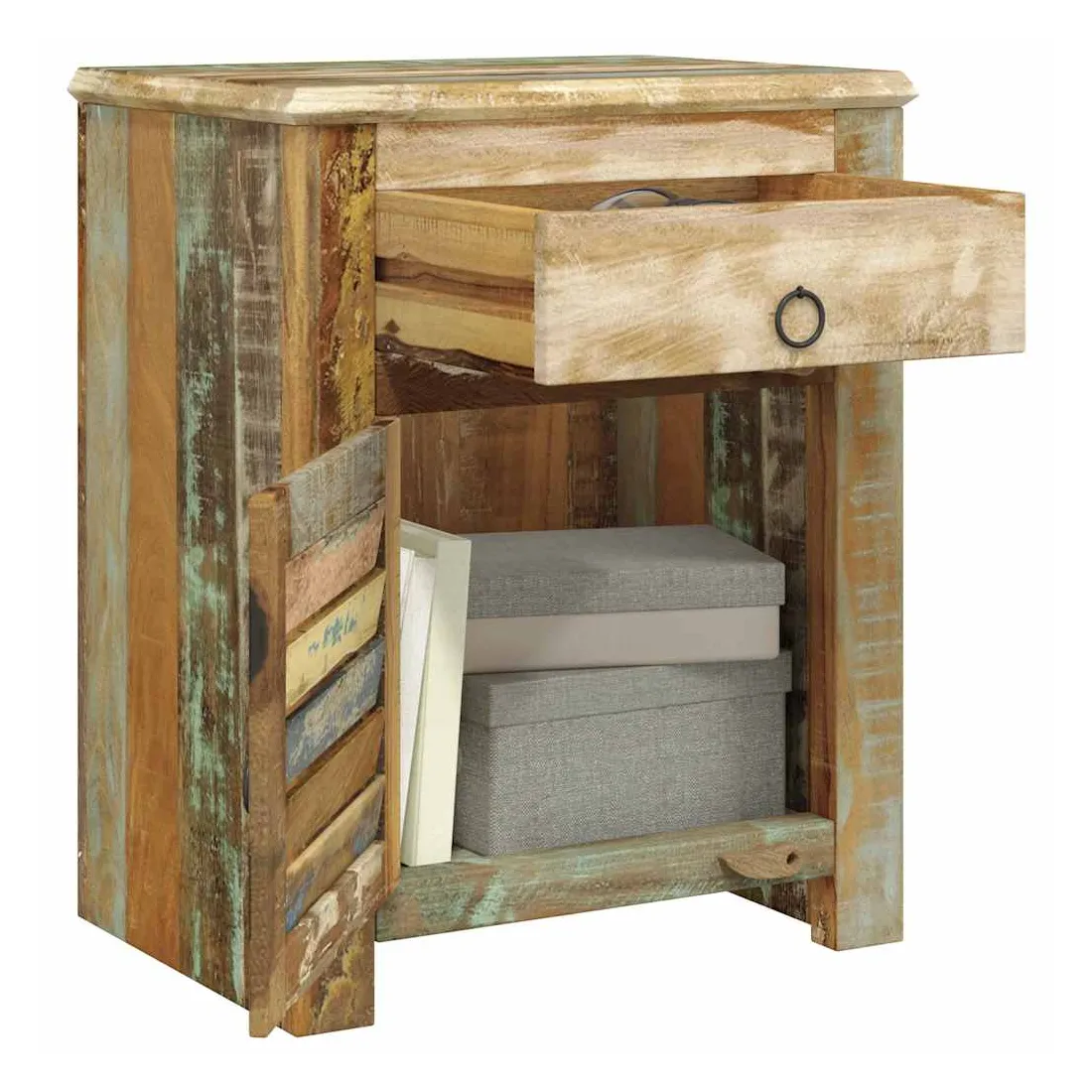 Cette table de coin en bois de style antique vous offre un certain espace de rangement et vous aide à maintenir vos articles en bon état. Vous pouvez également mettre une lampe de bureau ou des décorations sur la surface supérieure robuste.Cette table de coin de rangement est faite de bois de récupération, ce qui signifie que chaque meuble est unique et légèrement différent l'un de l'autre. Le mobilier fabriqué en bois de récupération a des caractéristiques de différents bois comme le bois de teck, l'acacia, le bois de manguier, le bois de saal etc. Le bois de récupération est solide, stable, durable et beau. Les trous de clous ou les grains à face claire apportent leur histoire avec eux et invitent une autre génération à les imprégner de leurs. Garder ce meuble à la maison montrera votre concept de conservation des ressources, de protection de l'environnement et de développement durable.L'artisanat fait à la main pur ajoute le style spectaculaire vintage à la table de coin et vous accueille avec un aspect exotique. Chaque processus de recombinaison, de polissage, de peinture et de cirage est minutieusement préparé. La table de coin sera certainement un supplément parfait à votre maison !Remarque importante : comme chaque pièce de la gamme est finie à la main en utilisant un mélange unique de bois de récupération, chaque table de coin est légèrement différente dans les couleurs. La livraison est aléatoire, ce qui garantit l'exclusivité et l'individualité de votre produit.