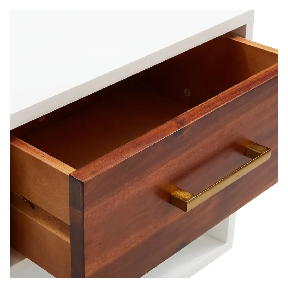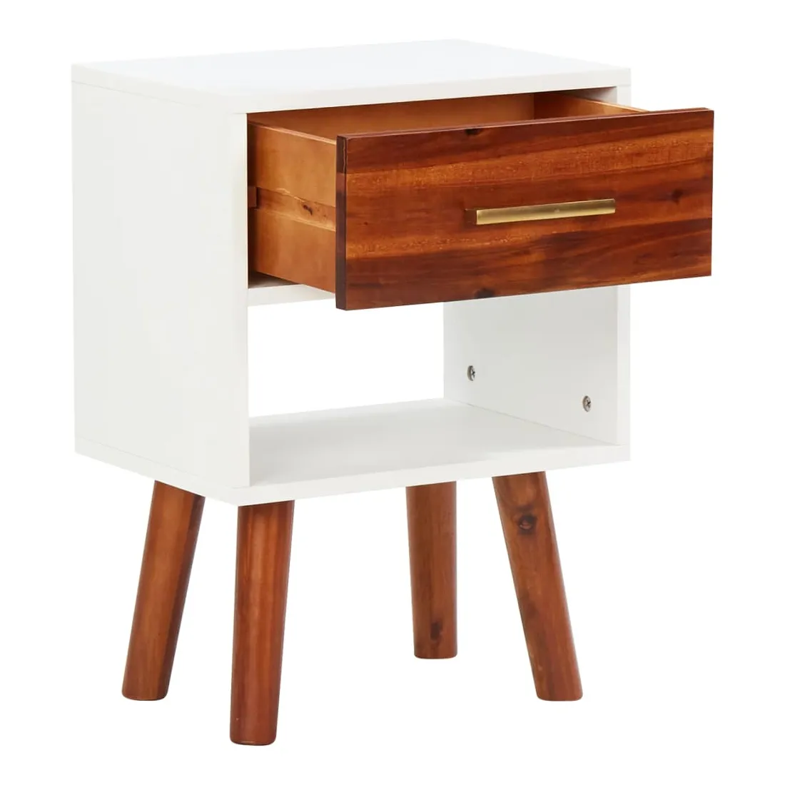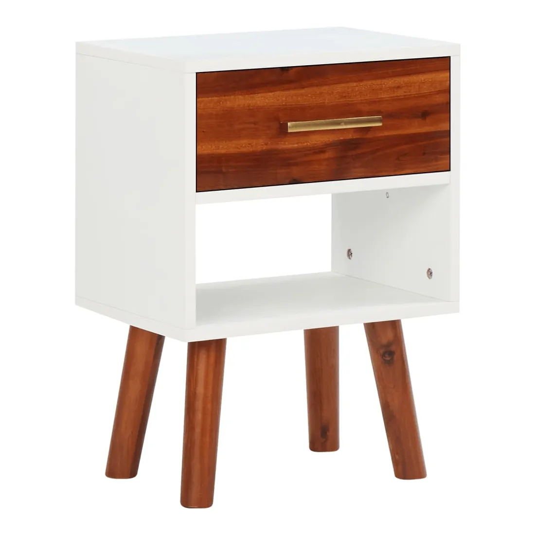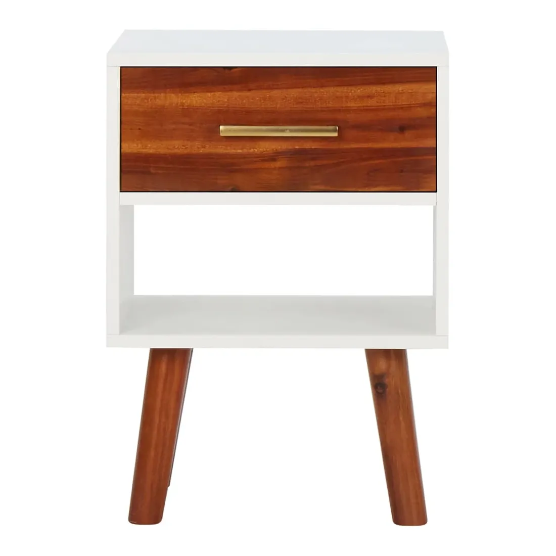 Notre table de chevet en bois de haute qualité, avec un design rétro sophistiqué, fera un excellent ajout à votre chambre à coucher, mais aussi une table d'appoint élégante pour votre salon ou votre couloir. Fabriquée habilement en bois d'acacia massif et en MDF de haute qualité, la table de nuit est très robuste et durable. Cette table d'appoint est équipée d'un tiroir et d'une étagère qui offrent suffisamment d'espace pour ranger les petits objets et les garder à portée de main. Le tiroir a une poignée en laiton qui ajoute au style rétro. La table de chevet peut également servir de table de chevet ou de support de téléphone. L'assemblage est facile.