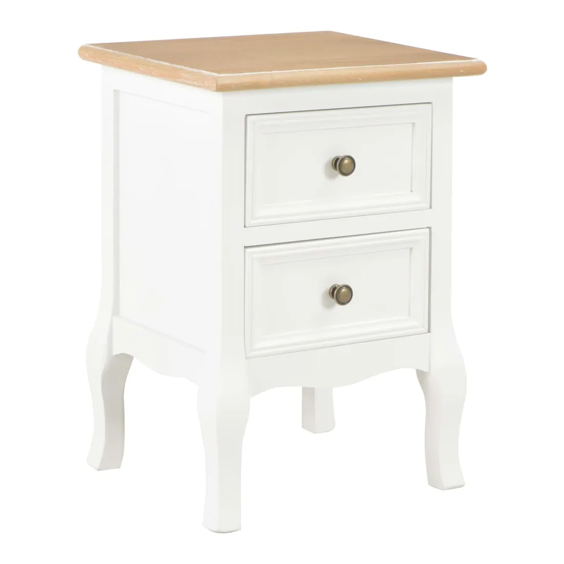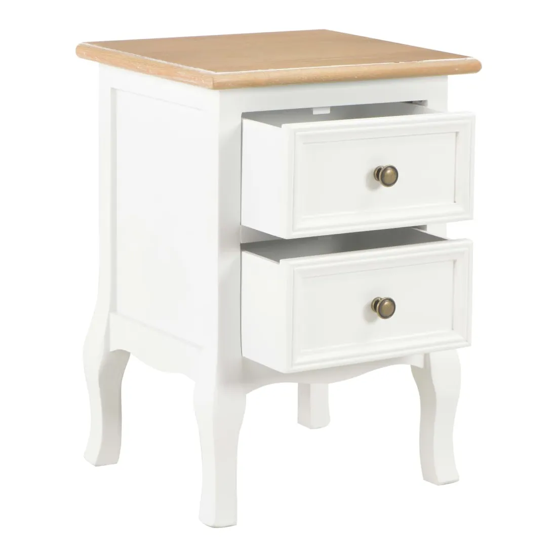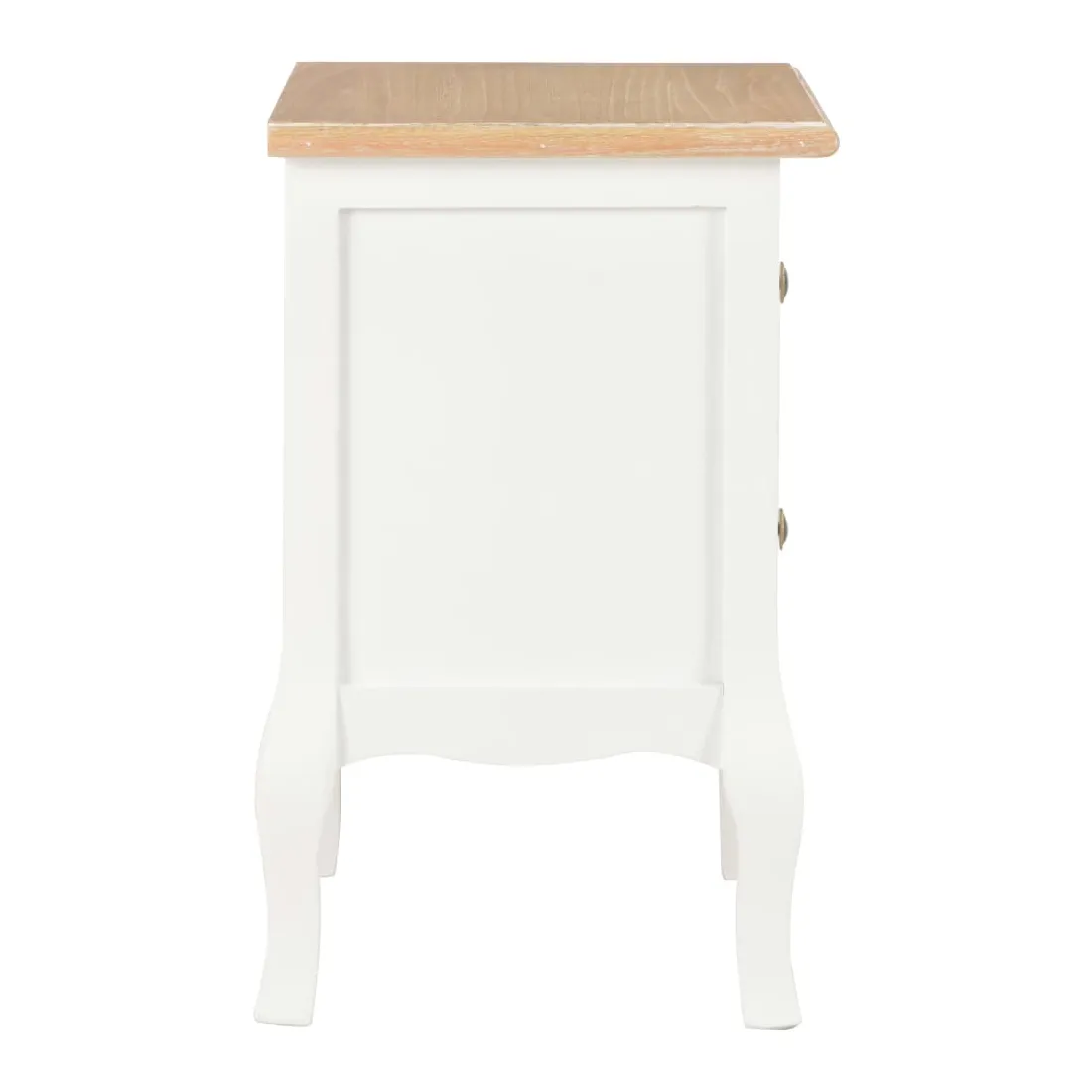 Ajoutez une touche d'élégance à votre décoration intérieure avec notre table de chevet en style français ! Elle peut également être utilisée comme support de téléphone à côté de votre canapé. Le meuble compact dispose de 2 tiroirs fonctionnant sans à-coups, offrant un grand espace pour garder vos petits objets rangés et à portée de main. Fabriquée en bois massif et en MDF, la table de chevet est extrêmement durable et facile à nettoyer. La livraison comprend 2 tables de chevet.