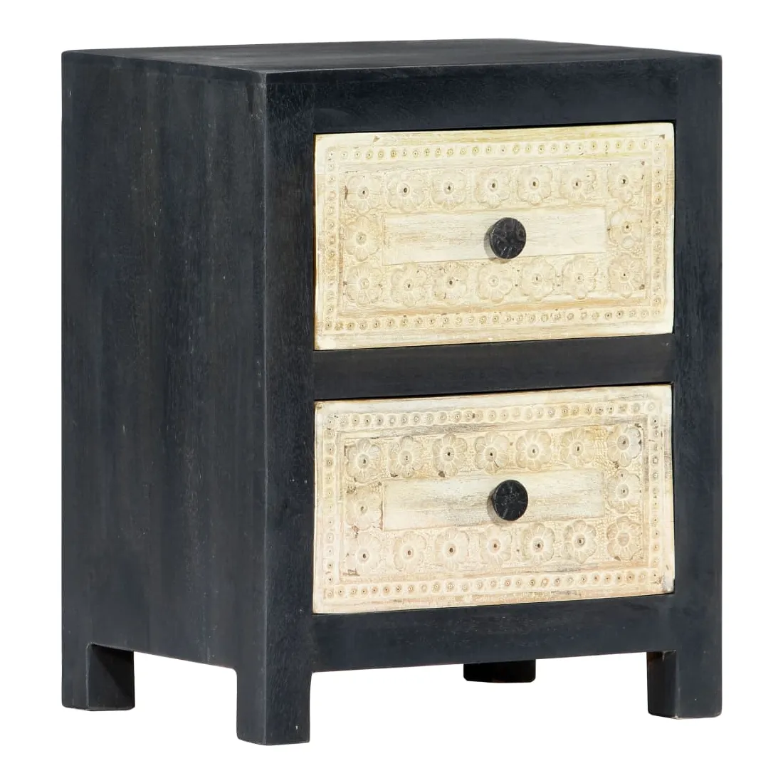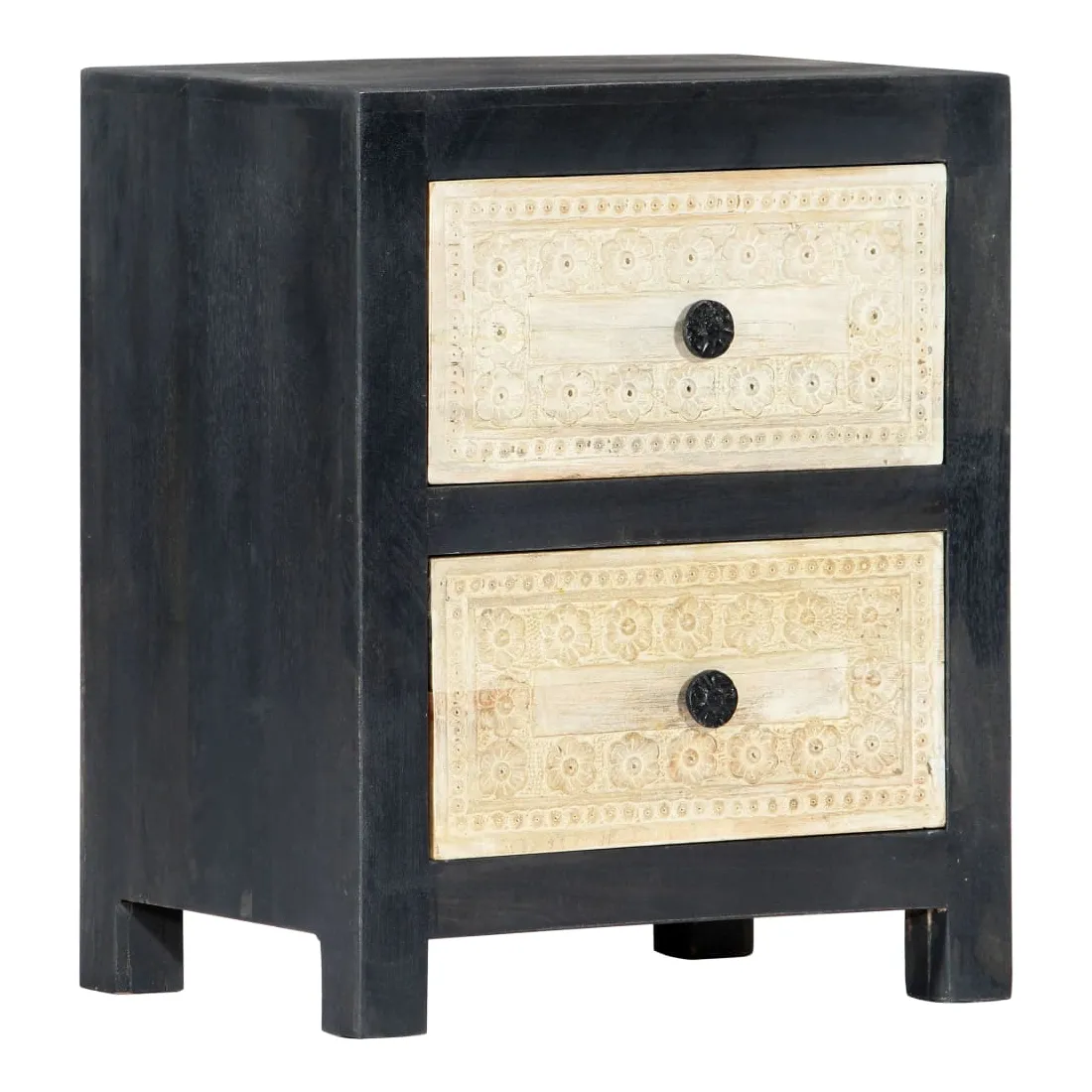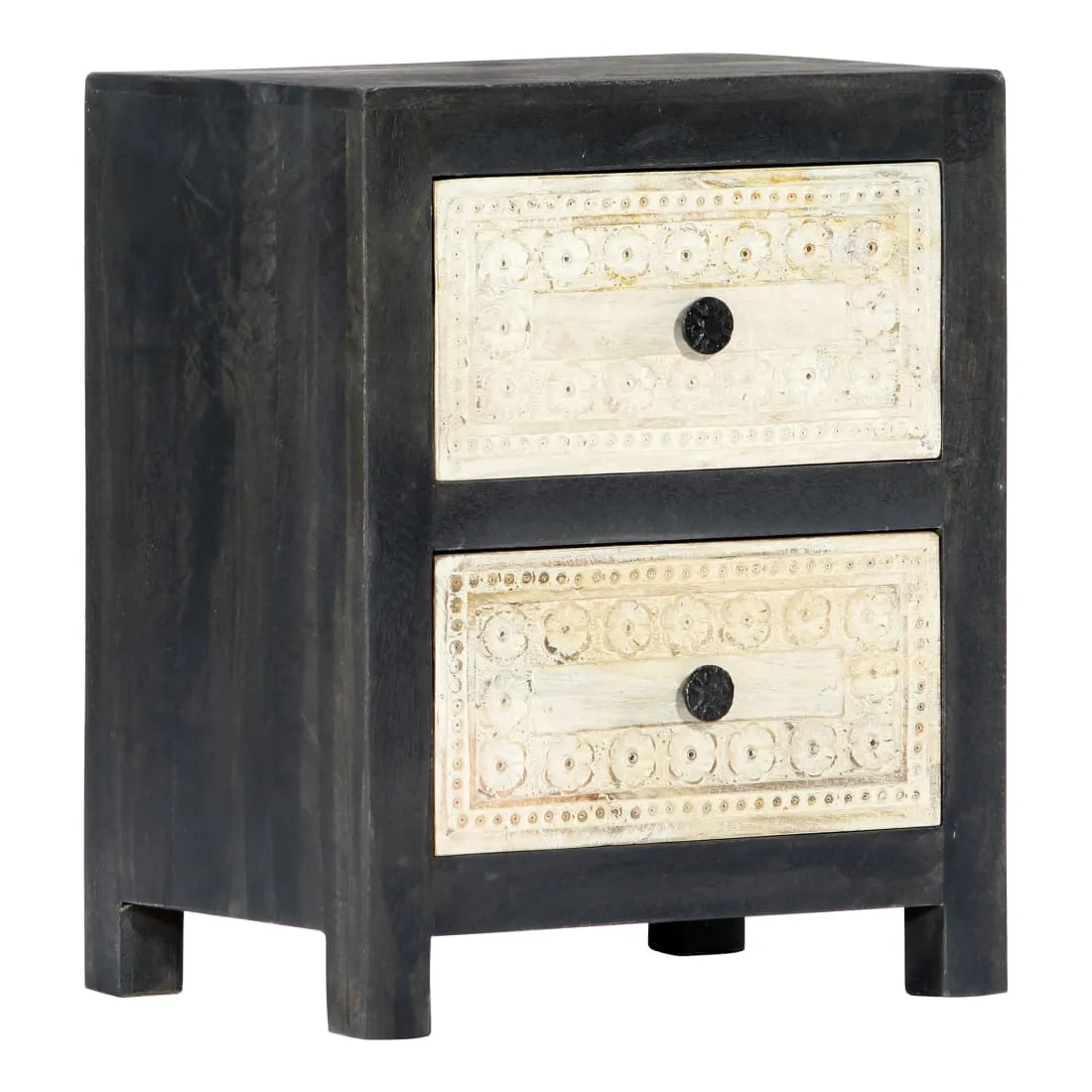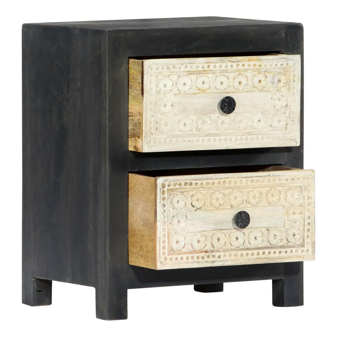 Apportez le luxe d'un motif sculpté à la main à votre intérieur avec notre élégante table de chevet ! Fabriquée en bois massif de manguier, la table de chevet a reçu une belle finition par polissage, peinture et laquage, ce qui lui donne un aspect raffiné. Les deux tiroirs à motif sculpté à la main ajoutent à la beauté de la table de chevet tout en offrant suffisamment d'espace de rangement pour ranger vos petits objets et les garder à portée de main. De plus, l'armoire à tiroirs est facile à assembler et à nettoyer avec un chiffon humide. Redécorez votre intérieur avec notre élégante table de chevet !