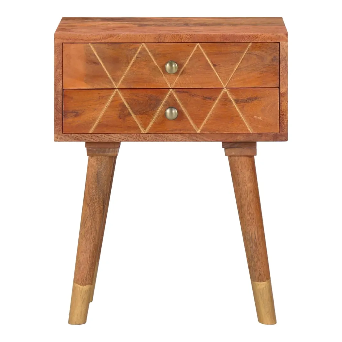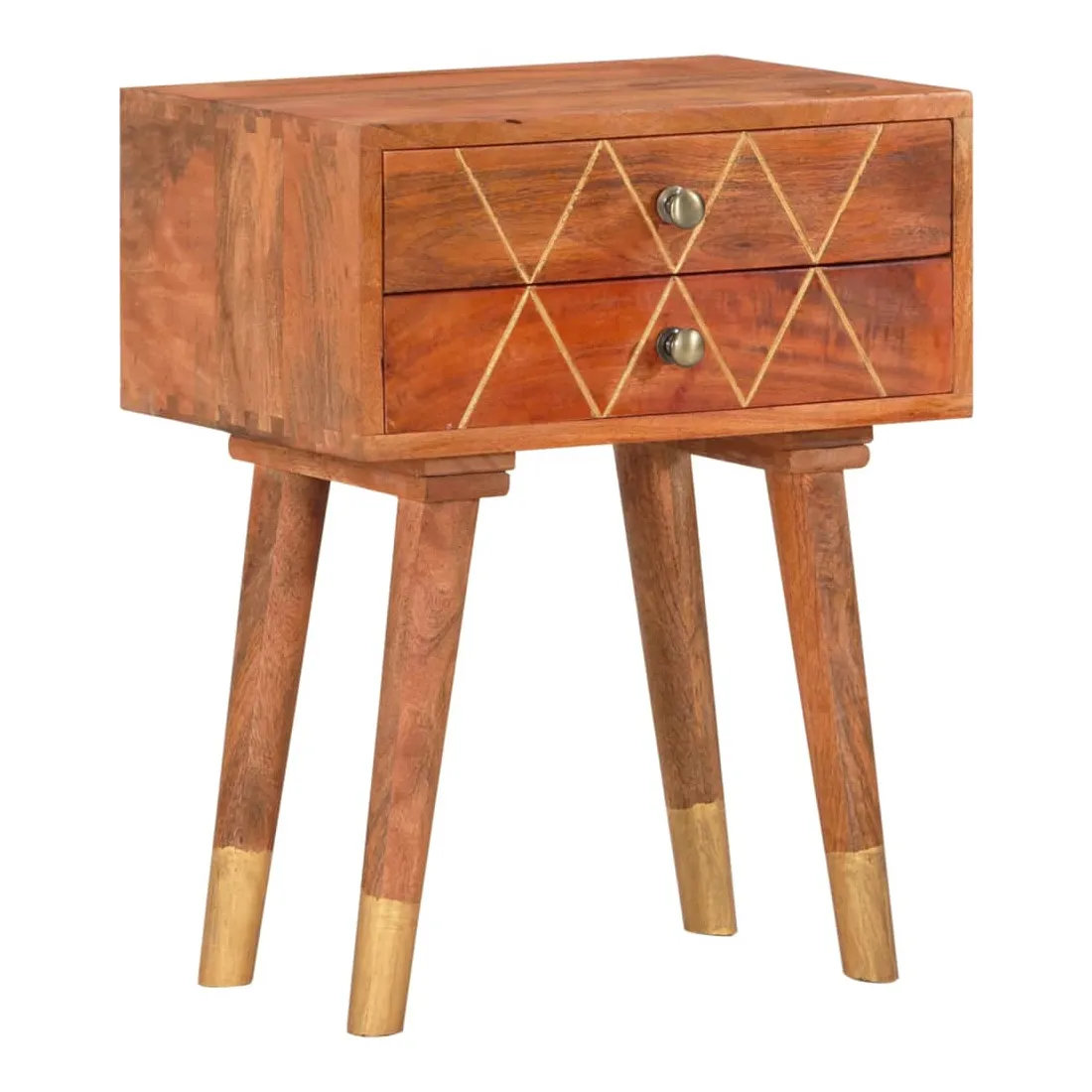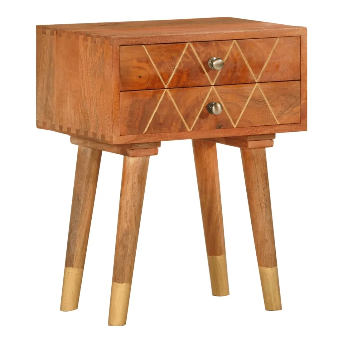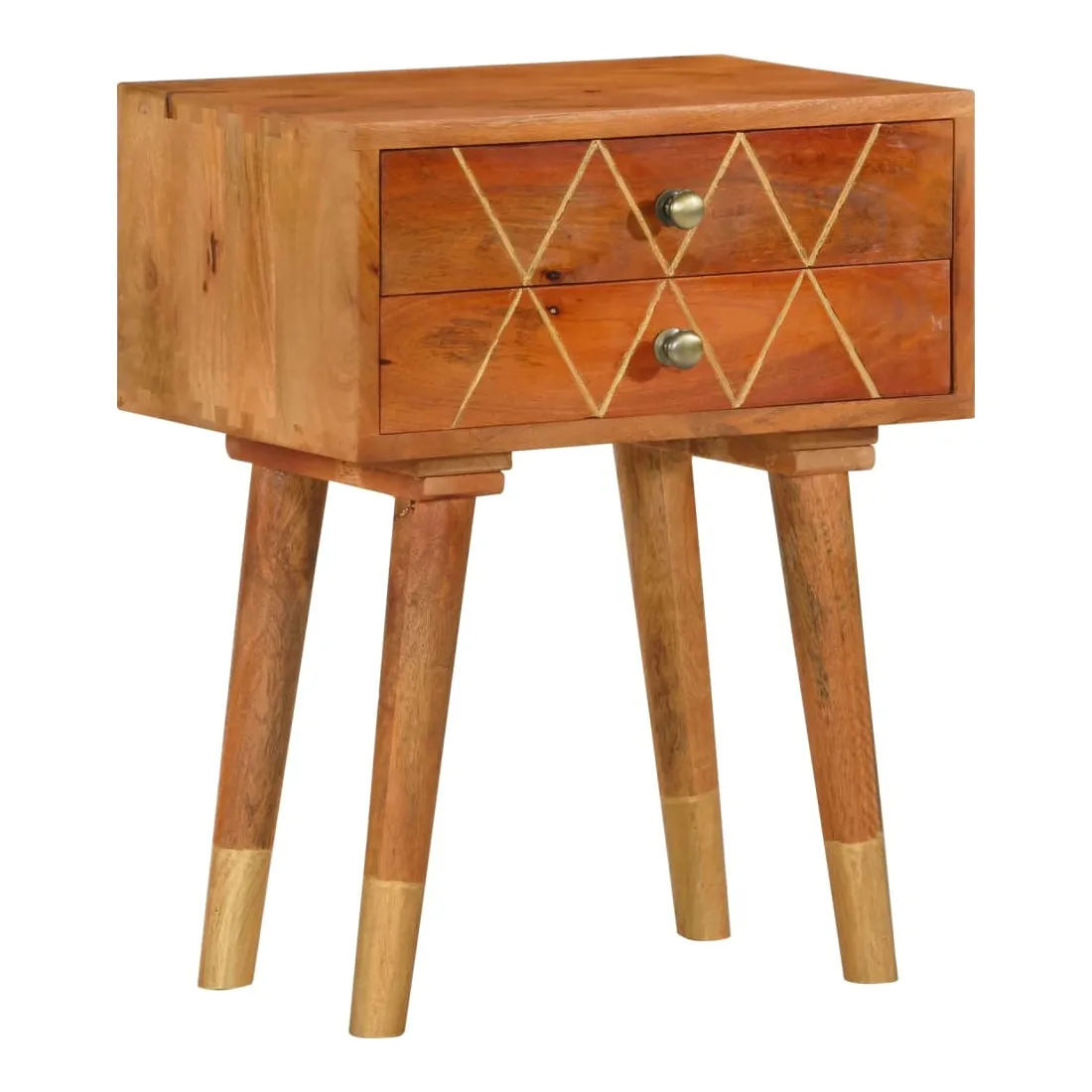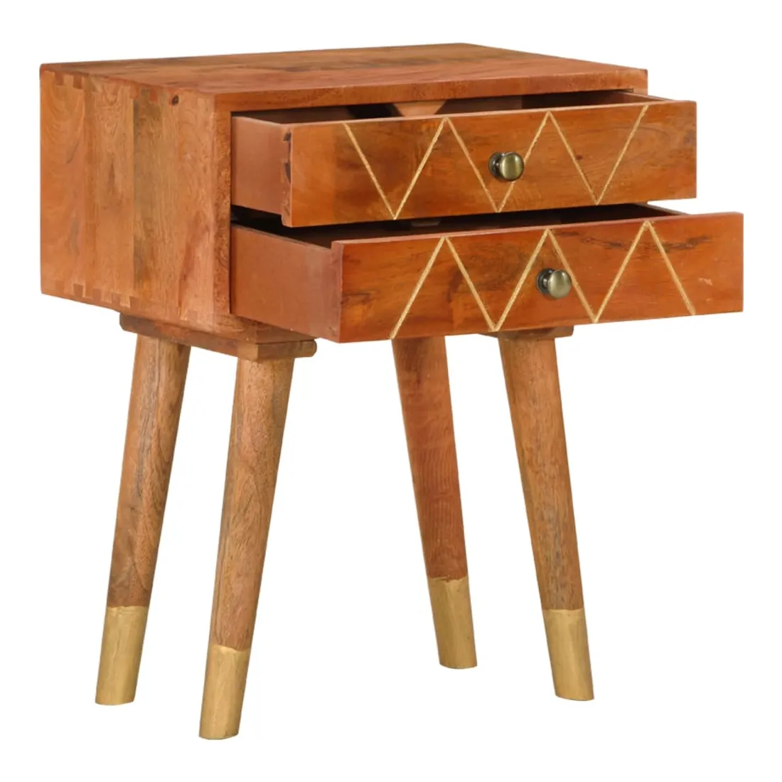 Donnez un air de charme rustique à votre intérieur avec notre élégante table de chevet ! Elle sera un supplément intemporel à votre espace de vie. Fabriquée en bois de manguier massif, la table de chevet a reçu une belle finition par polissage et laquage, ce qui lui confère un look raffiné. Le bois de manguier est un bois dur dense et robuste qui présente des belles stries et des contours bruns ou dorés à sa surface. De plus, les 2 tiroirs offrent un espace de rangement pour garder les petits objets organisés et à portée de main. Note importante : Le savoir-faire exquis et les magnifiques grains de bois massif de manguier rendent chaque meuble unique et légèrement différent du suivant. La livraison est aléatoire, assurant ainsi l'exclusivité et l'individualité de votre produit. C'est facile à assembler.