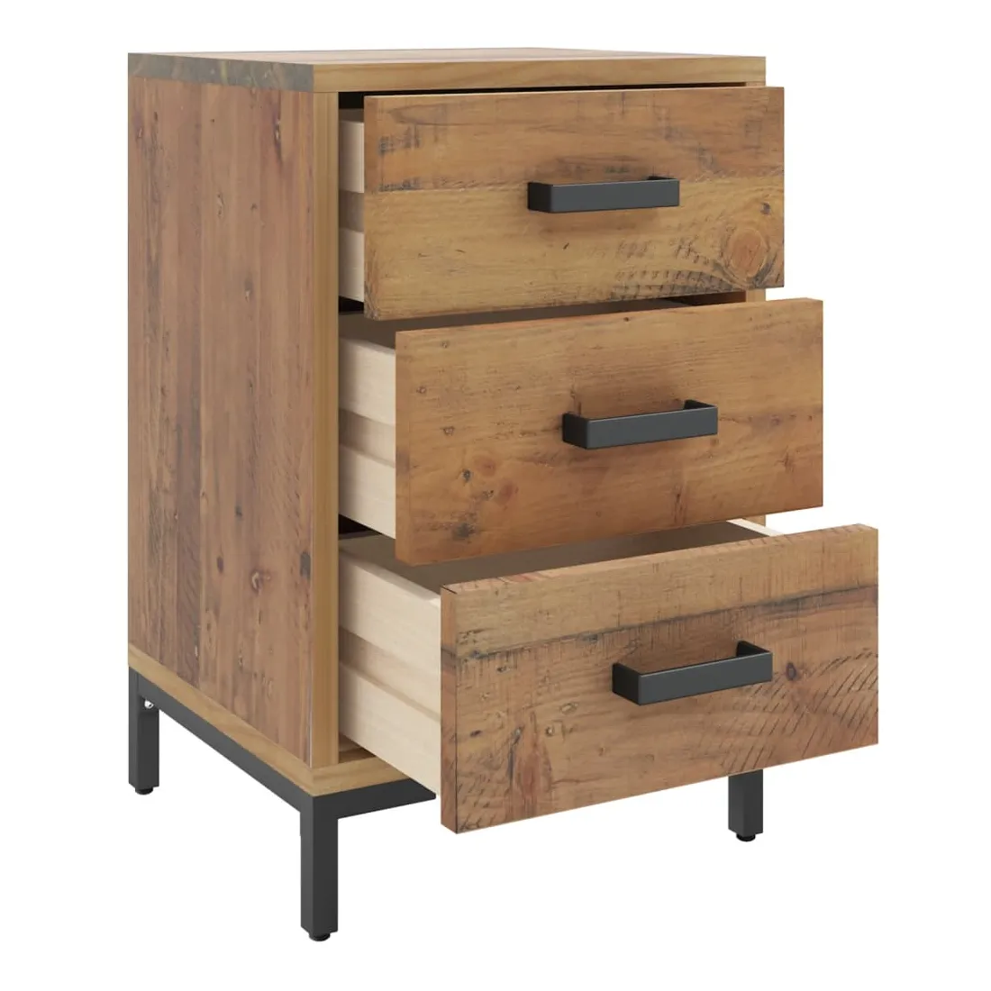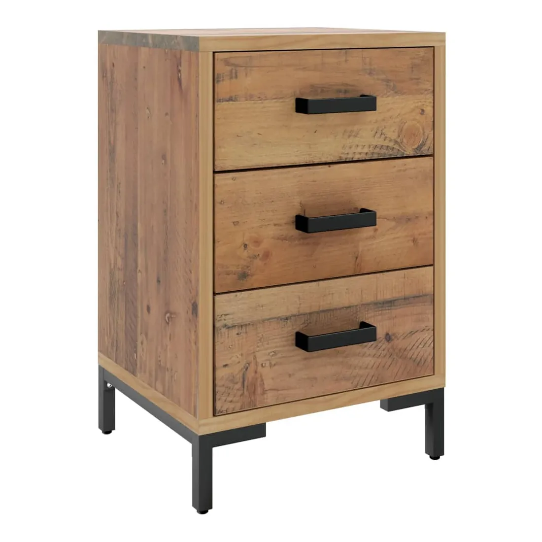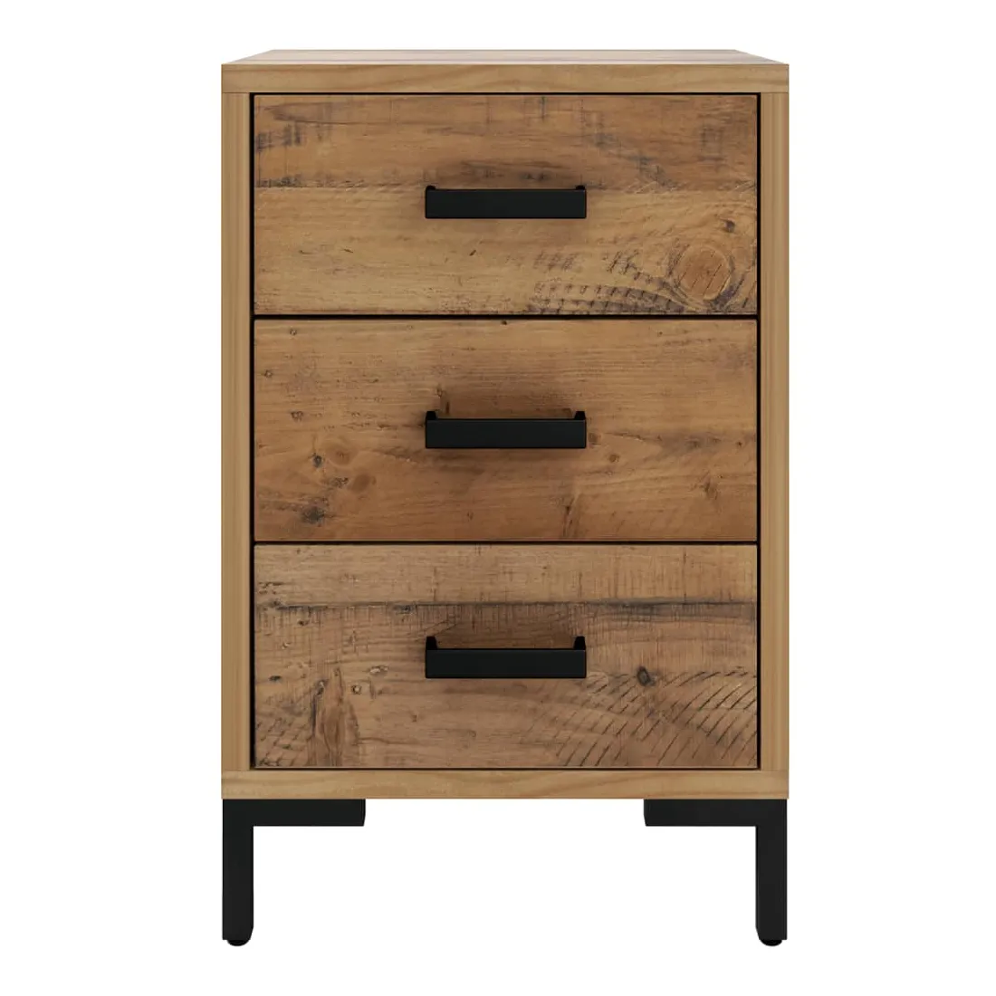 Ajoutez une touche vintage à votre pièce avec la table de chevet ! Elle est un supplément pratique et décoratif à votre maison. Matériau durable : le bois de pin massif est un matériau naturel magnifique. Le bois de pin a un grain droit et les nœuds donnent au matériau son aspect caractéristique et rustique.Grand espace de rangement : l'armoire latérale est conçue avec 3 tiroirs pour garder les choses organisées et à portée de main.Dessus robuste : l'armoire latérale est dotée d'un dessus robuste, idéal pour placer vos tasses, livres et autres objets décoratifs.Pieds en métal : les pieds en métal de ce meuble de chambre à coucher assurent la solidité et la stabilité. Remarque :Chaque produit est livré avec un manuel de montage dans la boîte pour un montage facile.Afin d'éviter qu'il ne bascule, ce produit doit être utilisé avec le dispositif de fixation murale fourni.