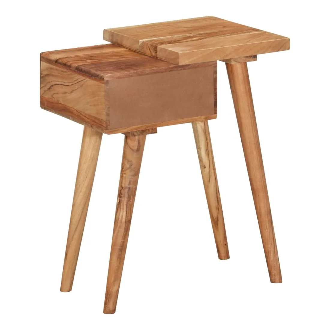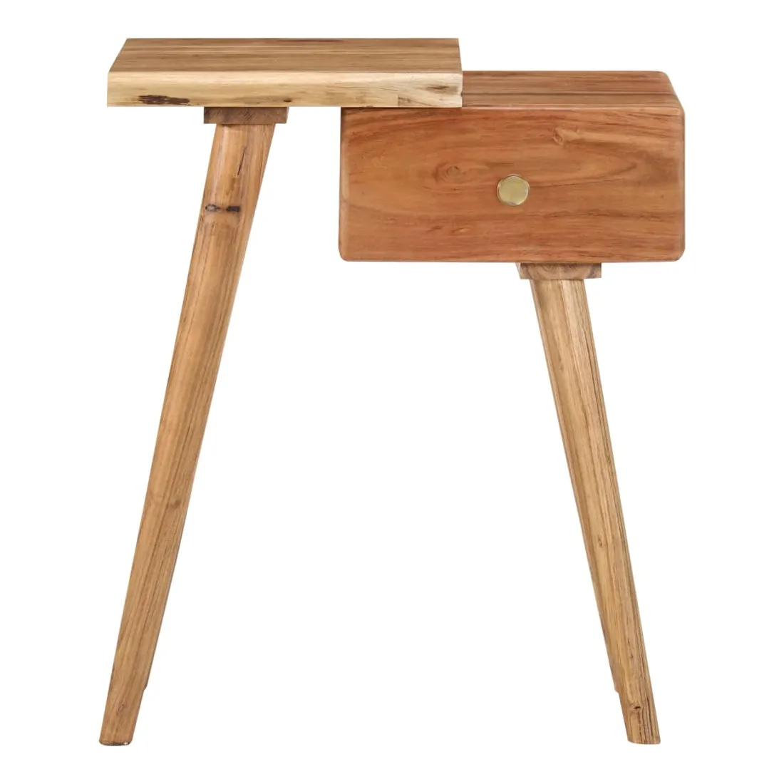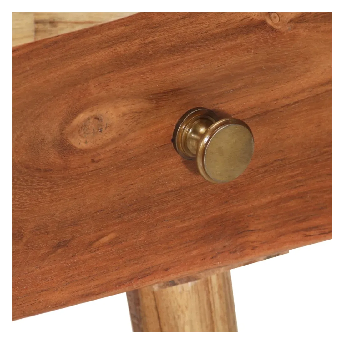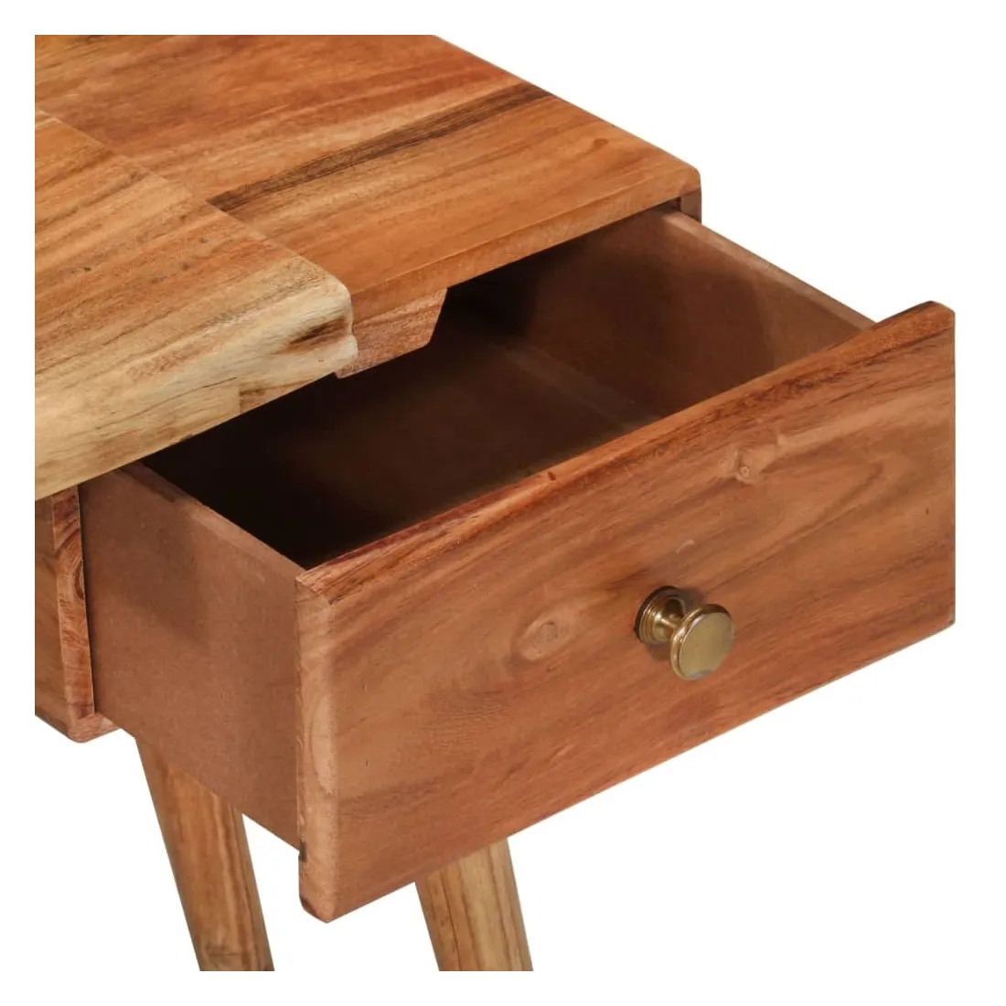 Notre table de chevet rétro à bord assorti ajoutera une touche intemporelle à la décoration de votre chambre à coucher ! Fabriquée en bois d'acacia massif, cette table est durable et stable et ajoutera une touche de charme rustique à votre intérieur. La table présente un design unique avec son dessus et son tiroir superposé, qui souligne son style naturel et vintage. Le tiroir offre un espace de rangement pour garder vos divers petits objets bien organisés. Chaque étape du processus de fabrication est réalisée avec le plus grand soin, que ce soit le polissage et le laquage. L'assemblage est facile. Remarque importante : les couleurs et les grains peuvent varier d'une pièce à l'autre, ce qui rend chaque pièce unique et légèrement différente l'une de l'autre ; la livraison est aléatoire, ce qui garantit l'exclusivité et l'individualité de votre produit.