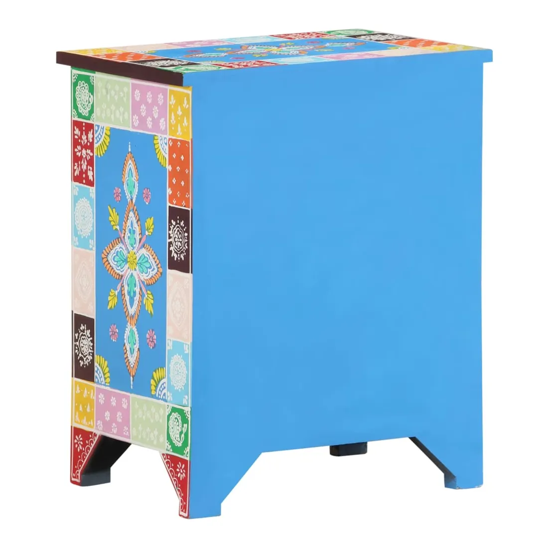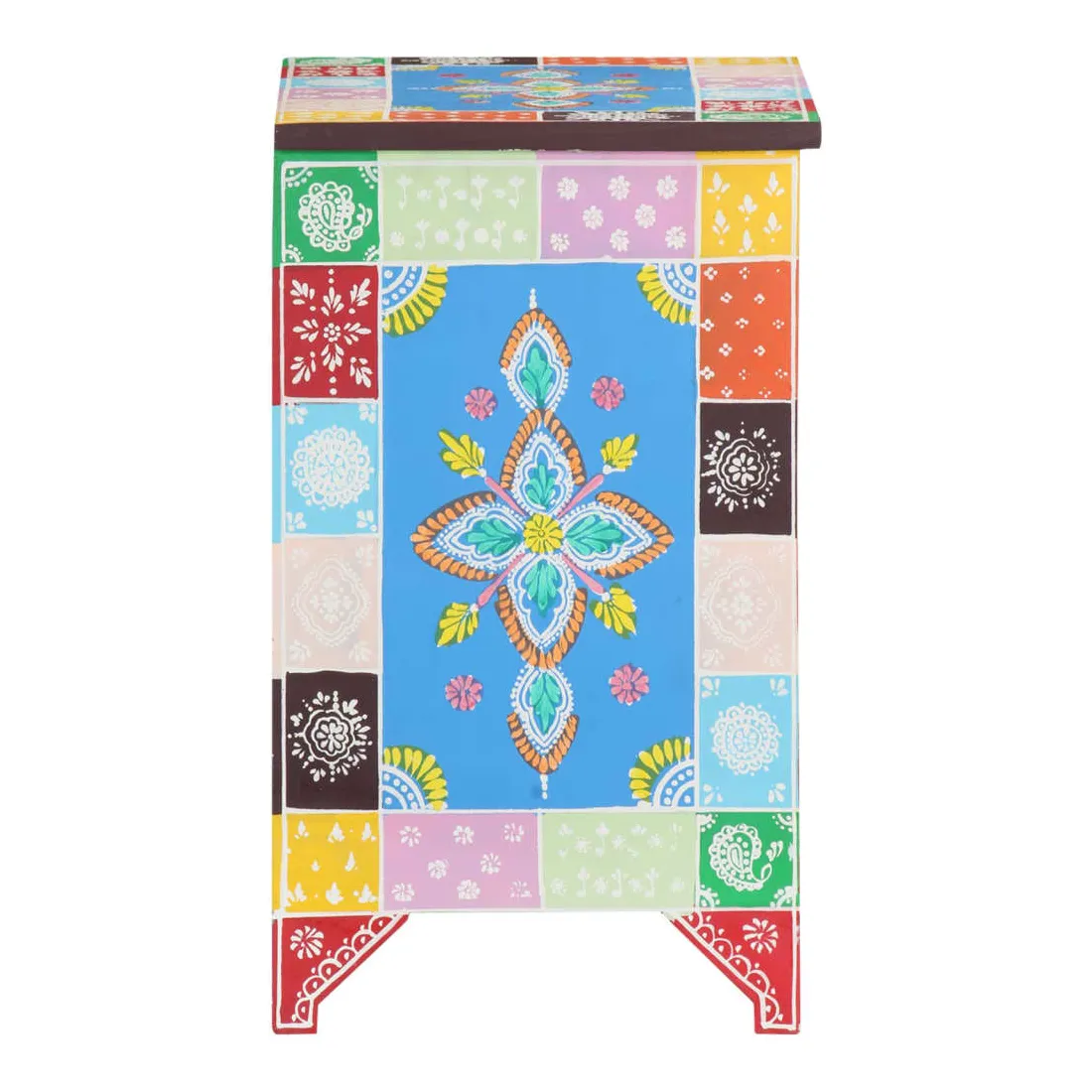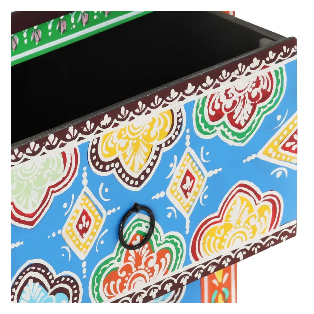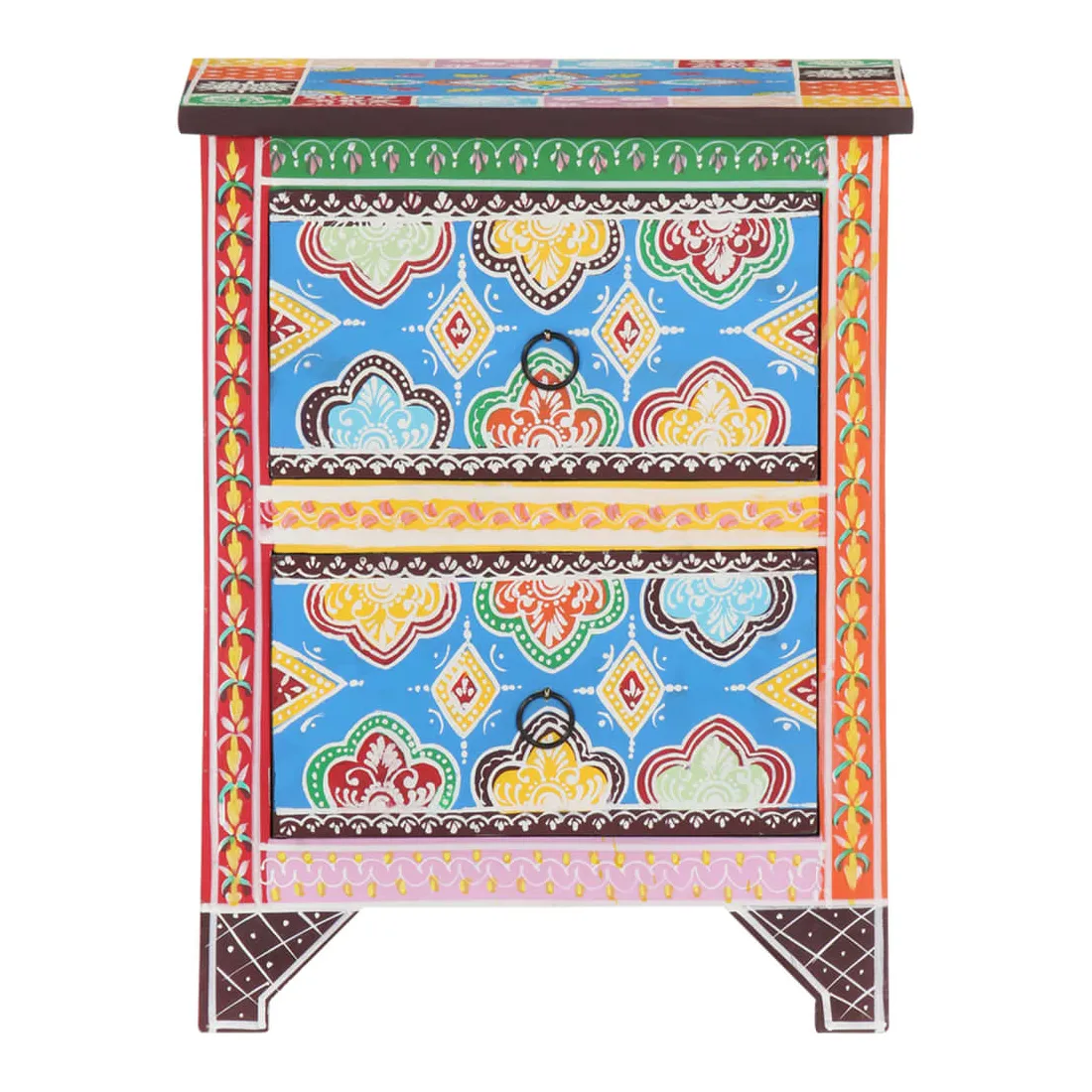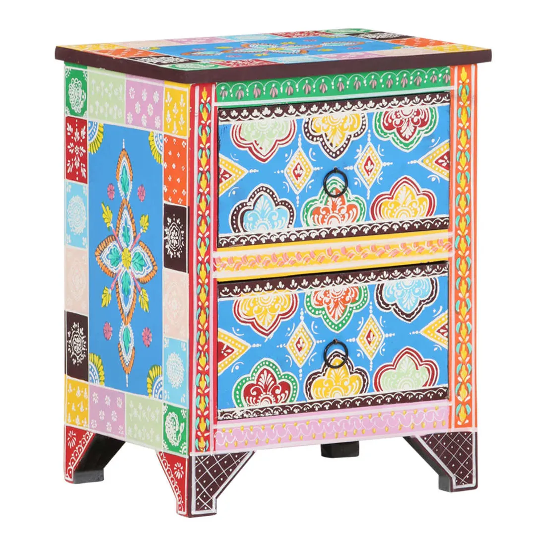 Cette table de chevet peinte à la main ajoute une touche de couleur et constitue un supplément accrocheur à votre intérieur actuel. Cette table de chevet est faite de bois de manguier massif, un bois dur tropical. Il a la force de soutenir le poids et de résister à l'usure du temps. De plus, le savoir-faire exquis et les beaux grains de bois rendent chaque pièce légèrement différente l'une de l'autre. L'armoire latérale en bois a un dessus robuste, sur lequel vous pouvez placer une lampe de chevet, un réveil ou tout ce dont vous pourriez avoir besoin près de votre lit. Les 2 tiroirs offrent suffisamment d'espace pour garder toutes sortes de petits objets organisés et à portée de main. Les riches détails décoratifs peints à la main en font une belle décoration pour votre intérieur. Remarque importante : les couleurs varient d'une pièce à l'autre, rendant chaque pièce unique. La livraison est aléatoire, garantissant l'exclusivité et l'individualité de votre produit.