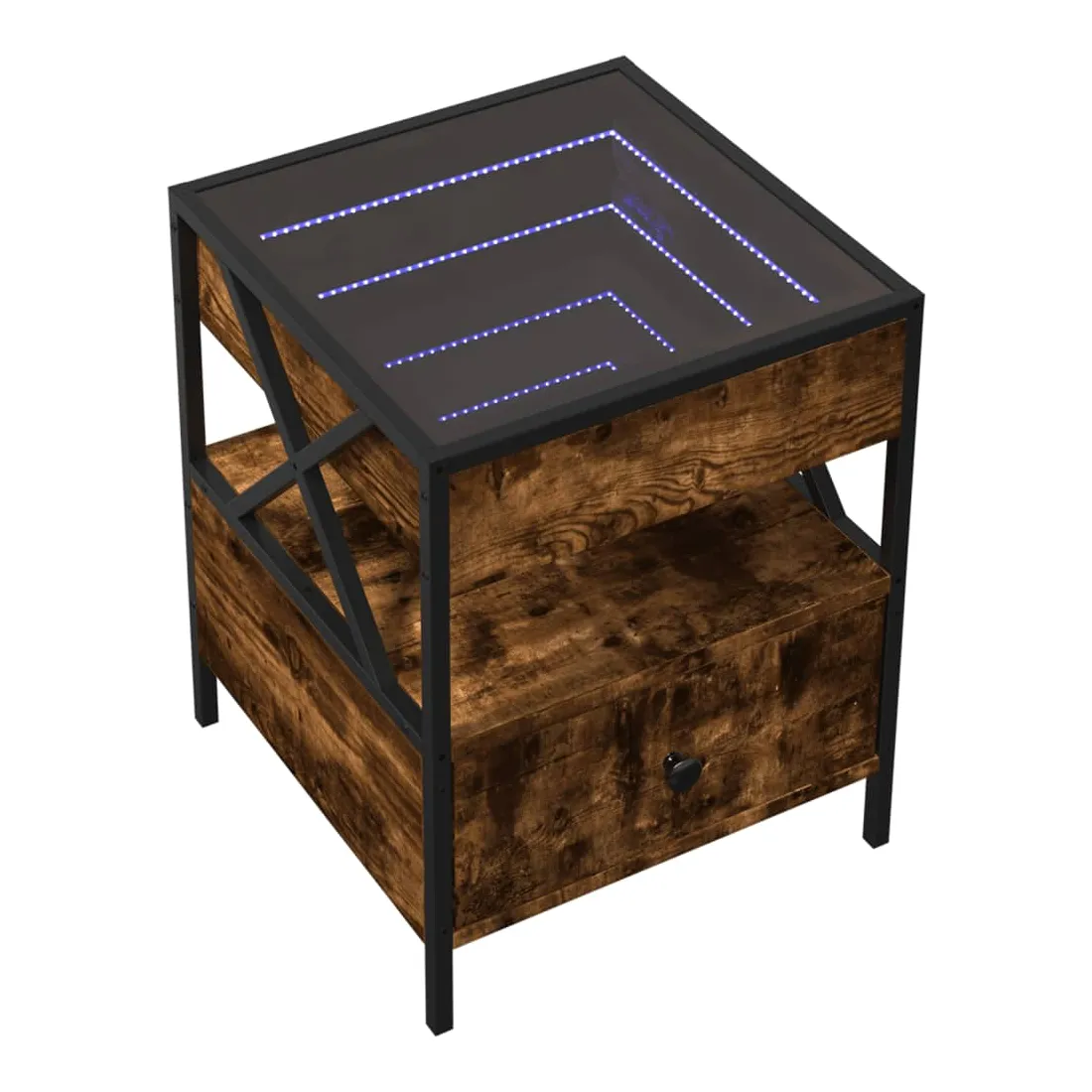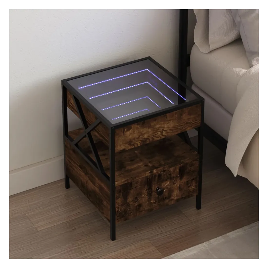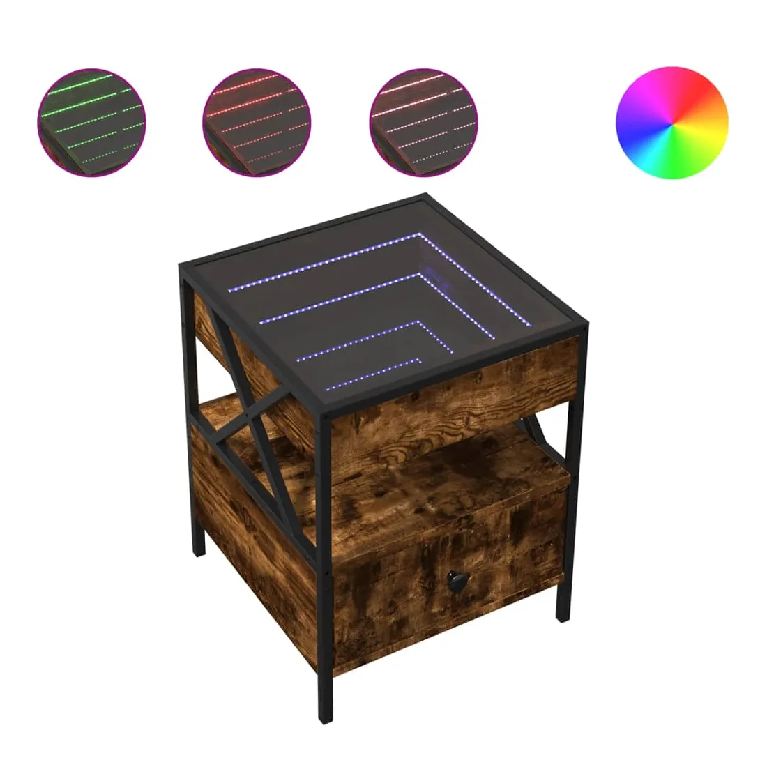 Cette table de chevet avec un miroir à LED infini constitue un ajout intemporel à votre décoration intérieure. Matériau stable et durable : le bois d'ingénierie est un matériau durable et stable dont la surface lisse résiste à l'humidité, à la déformation et au fendillement, ce qui en fait un choix fiable pour une grande variété de projets. Structure robuste : le cadre en métal de la table ajoute un style industriel à votre intérieur tout en garantissant robustesse, stabilité et longévité. Lampes LED RVB pour une ambiance agréable : cette table est dotée de lampes LED qui peuvent être facilement réglées pour créer un spectacle lumineux personnalisé. Vous pouvez personnaliser les modes, les couleurs et la luminosité pour améliorer l'ambiance de votre espace intérieur.Dessus de table stable et robuste : le dessus de table robuste est idéal pour placer vos objets décoratifs ou tout autre objet nécessaire à portée de main. Bon à savoir : Ce produit est doté d'un connecteur USB qui nécessite une source d'alimentation USB de 5V certifiée (non incluse).
