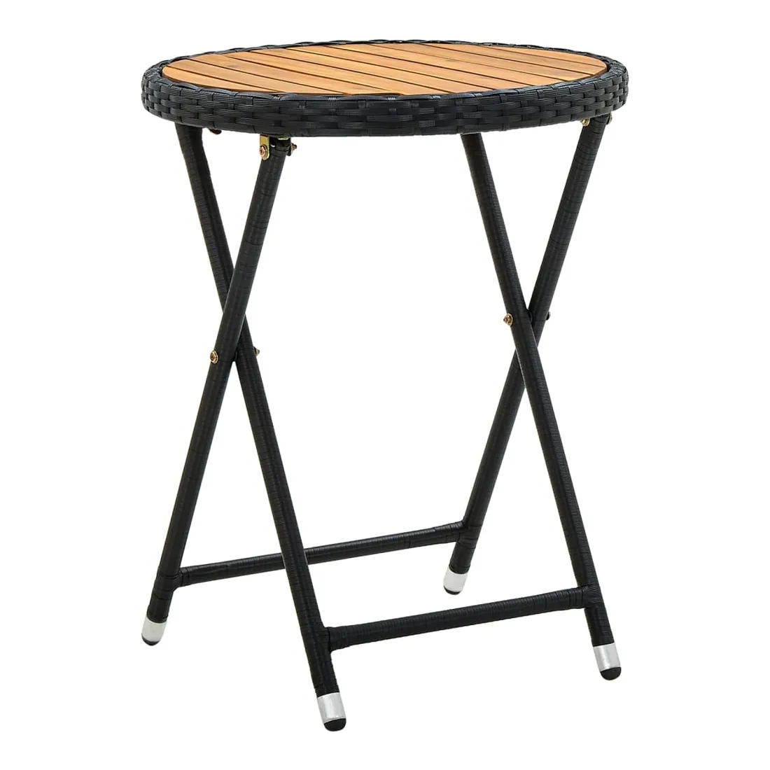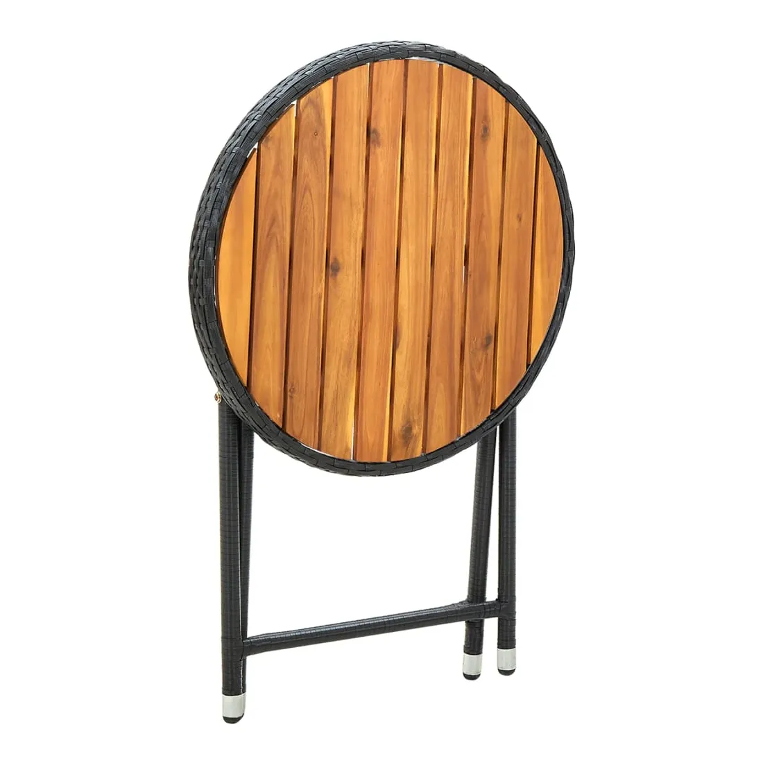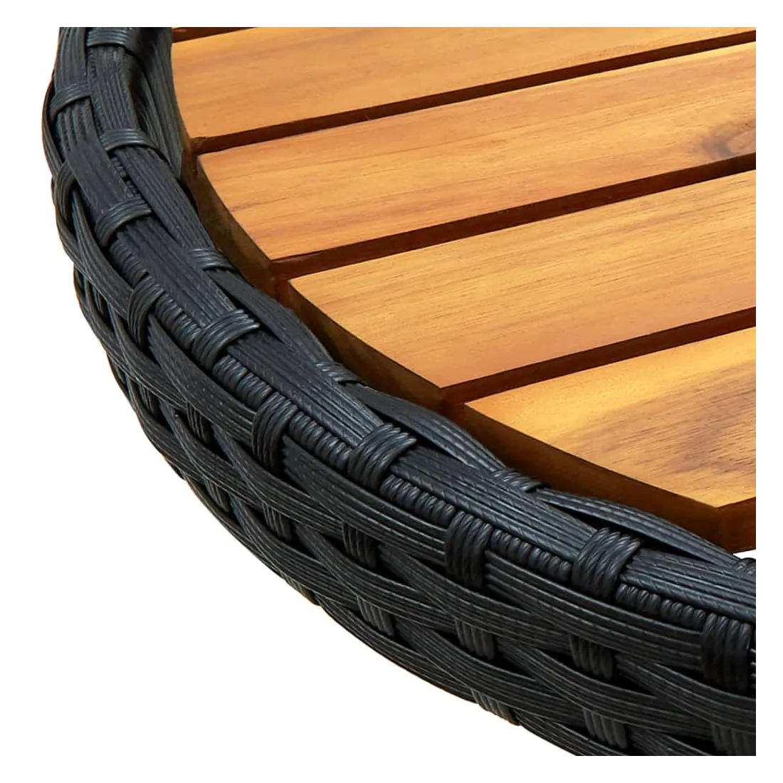 Profitez d'une merveilleuse heure du thé autour de cette table à thé rustique. Elle apporte une touche vraiment conviviale et accrocheuse à votre jardin et terrasse. Dotée d'un cadre en acier enduit de poudre recouvert de résine tressée résistante aux intempéries avec protection UV, cette table garantit des années d'utilisation à l'extérieur. Fabriqué en bois d'acacia massif avec support fort, le dessus de table est durable et robuste. Lorsqu'elle n'est pas utilisée, la table d'extérieur peut être facilement repliée pour économiser de l'espace. Remarque : afin de prolonger la durée de vie de vos meubles d'extérieur, nous vous recommandons de les nettoyer régulièrement et de ne pas les laisser à l'extérieur sans protection inutilement.Nettoyage : utiliser une solution savonneuse douceStockage : si possible, stockez dans un endroit frais et sec à l'intérieur. Si le produit est stocké à l'extérieur, protégez-le avec une housse imperméable. Essuyez et séchez l'excès d'eau ou de neige des surfaces planes après la pluie ou une chute de neige. Permettez une circulation d'air suffisante afin d'éviter les dommages liés à l'humidité.