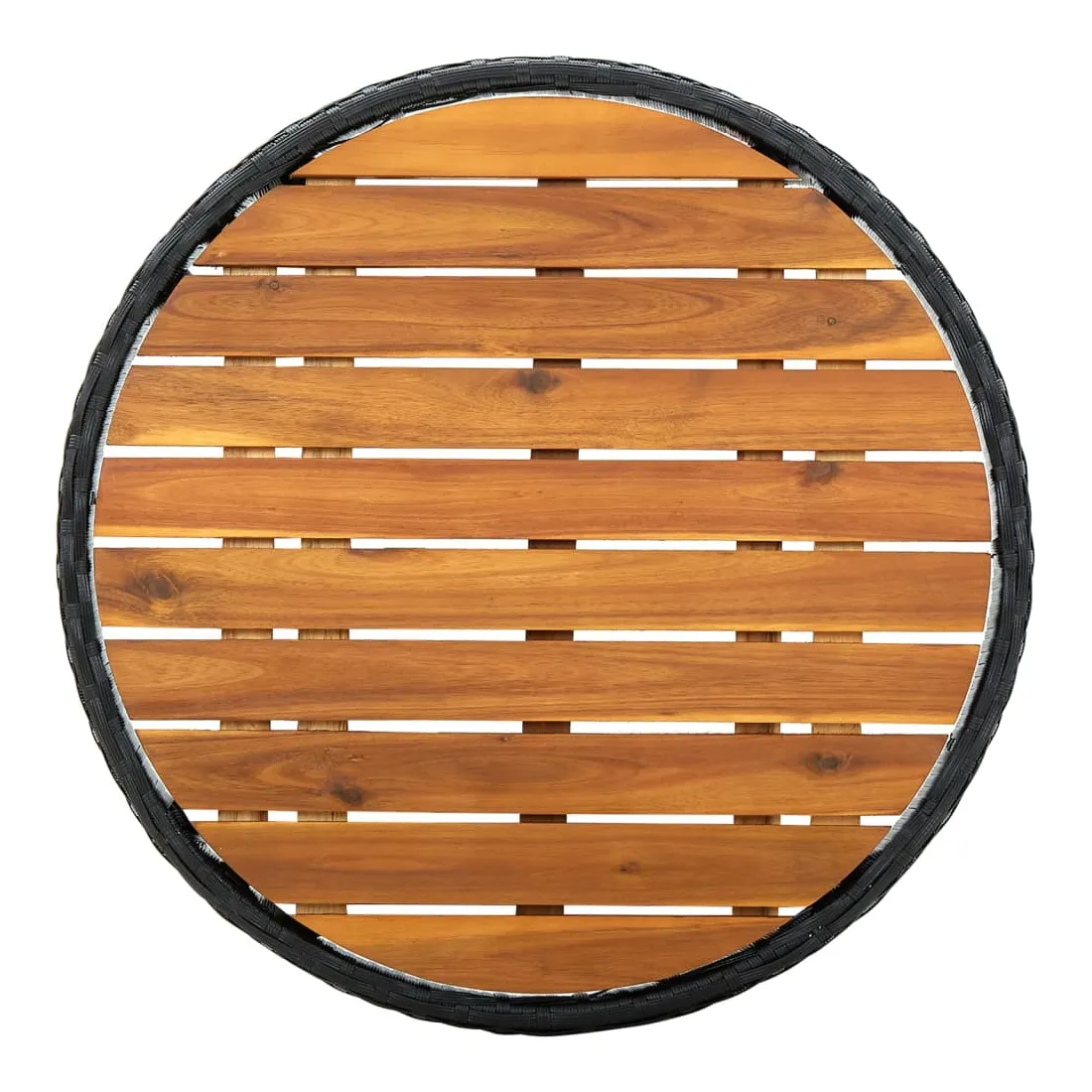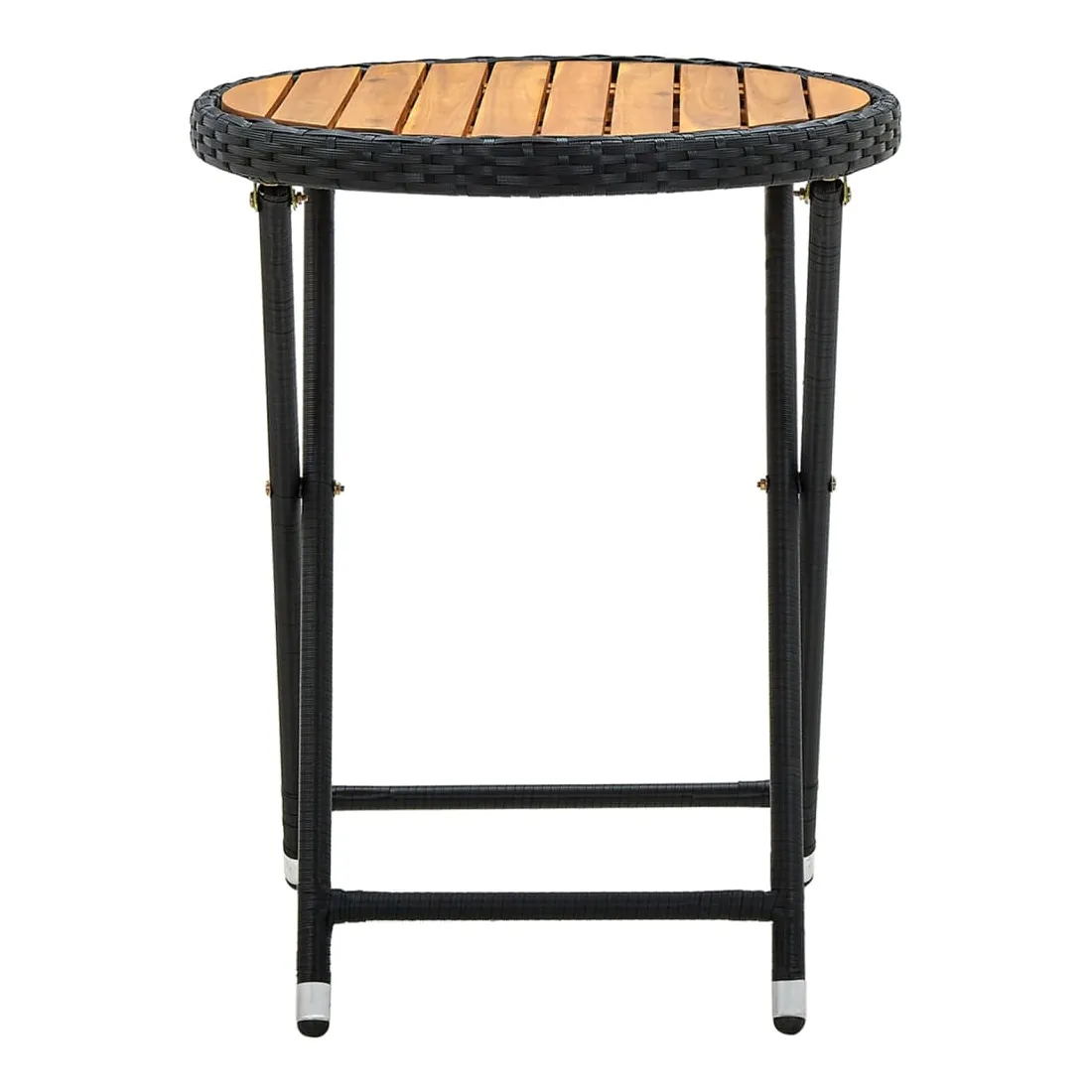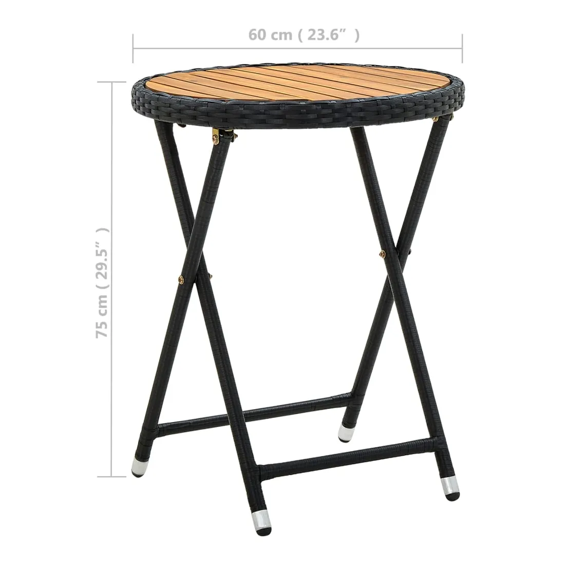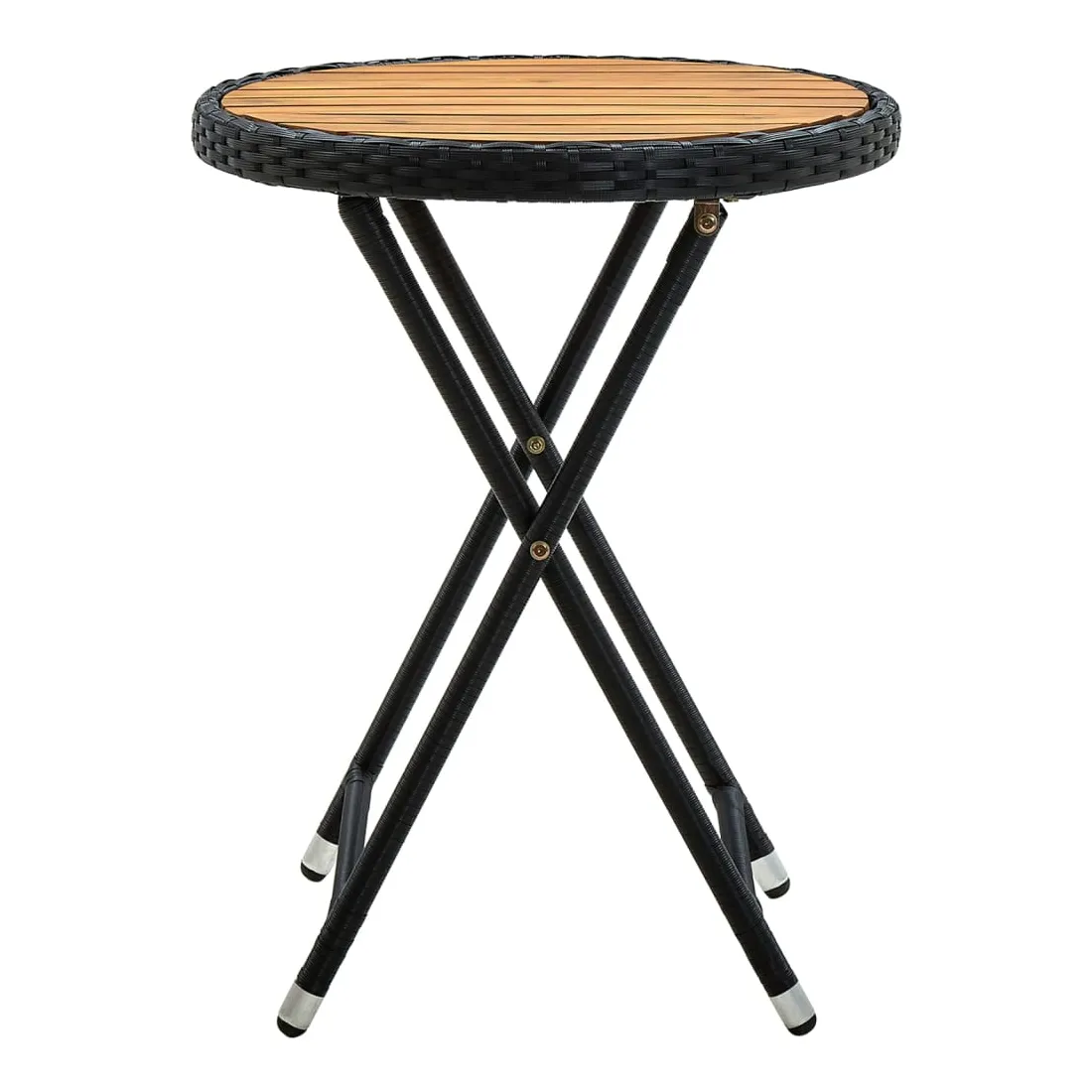 Profitez d'une merveilleuse heure du thé autour de cette table à thé rustique. Elle apporte une touche vraiment conviviale et accrocheuse à votre jardin et terrasse. Dotée d'un cadre en acier enduit de poudre recouvert de résine tressée résistante aux intempéries avec protection UV, cette table garantit des années d'utilisation à l'extérieur. Fabriqué en bois d'acacia massif avec support fort, le dessus de table est durable et robuste. Lorsqu'elle n'est pas utilisée, la table d'extérieur peut être facilement repliée pour économiser de l'espace. Remarque : afin de prolonger la durée de vie de vos meubles d'extérieur, nous vous recommandons de les nettoyer régulièrement et de ne pas les laisser à l'extérieur sans protection inutilement.Nettoyage : utiliser une solution savonneuse douceStockage : si possible, stockez dans un endroit frais et sec à l'intérieur. Si le produit est stocké à l'extérieur, protégez-le avec une housse imperméable. Essuyez et séchez l'excès d'eau ou de neige des surfaces planes après la pluie ou une chute de neige. Permettez une circulation d'air suffisante afin d'éviter les dommages liés à l'humidité.