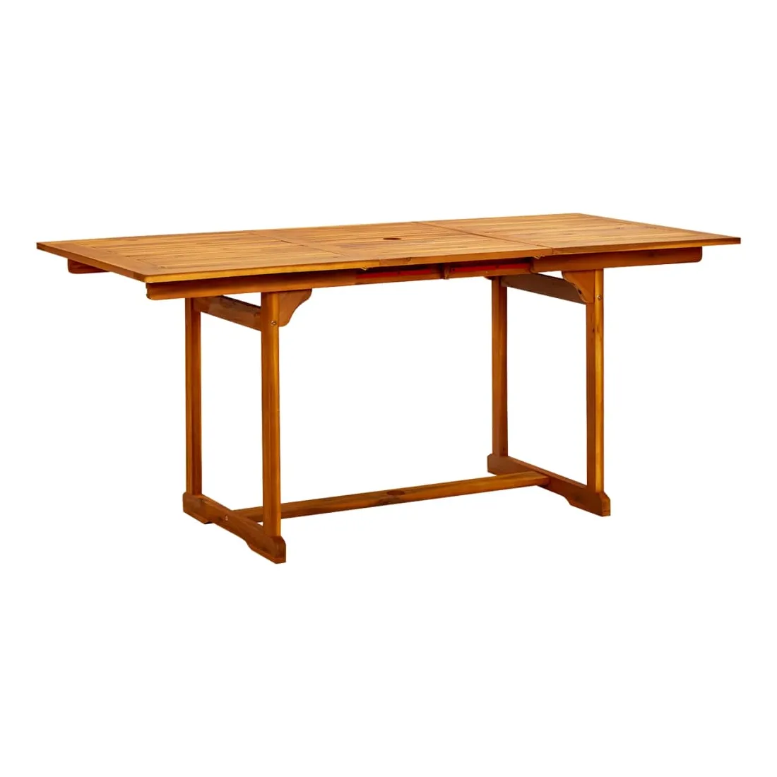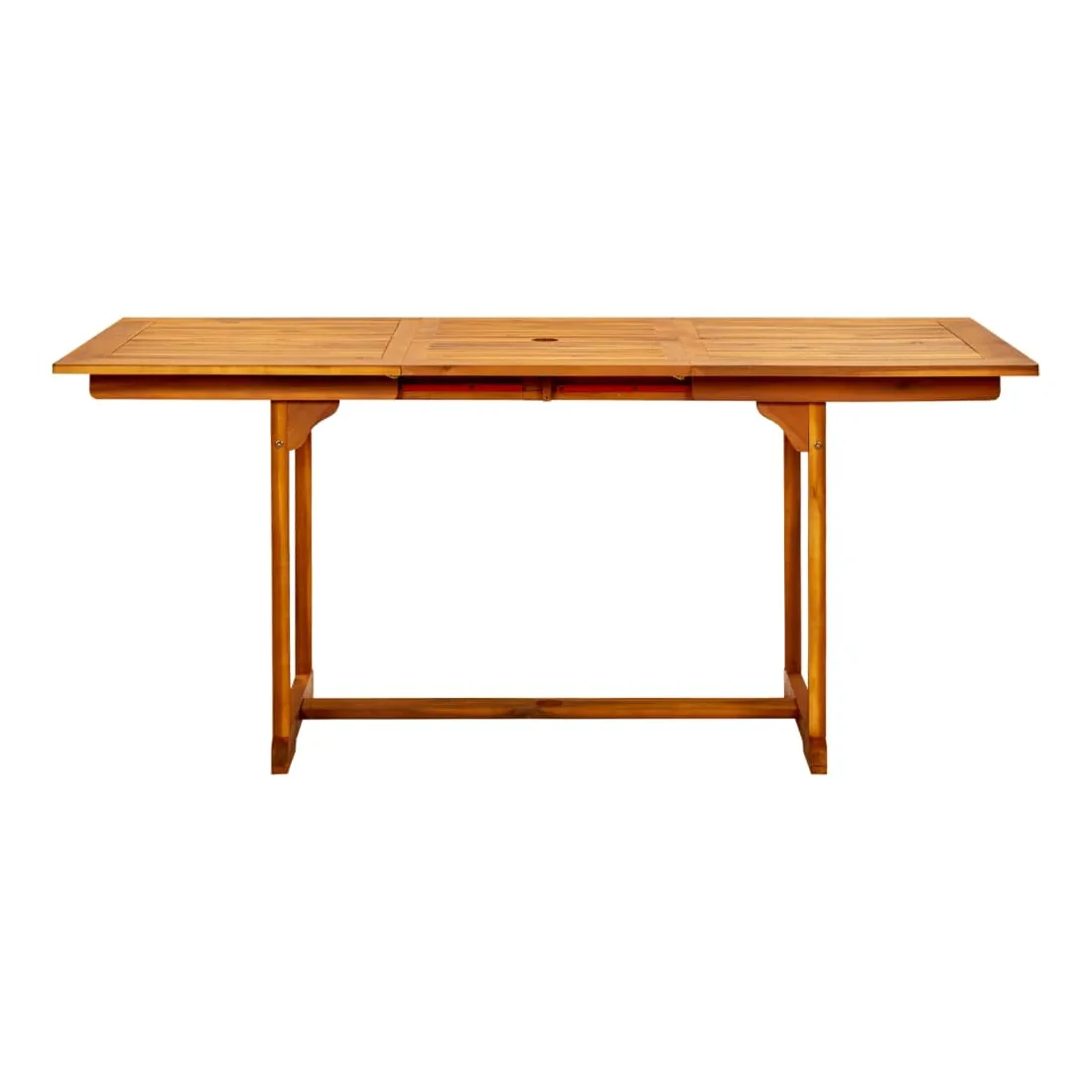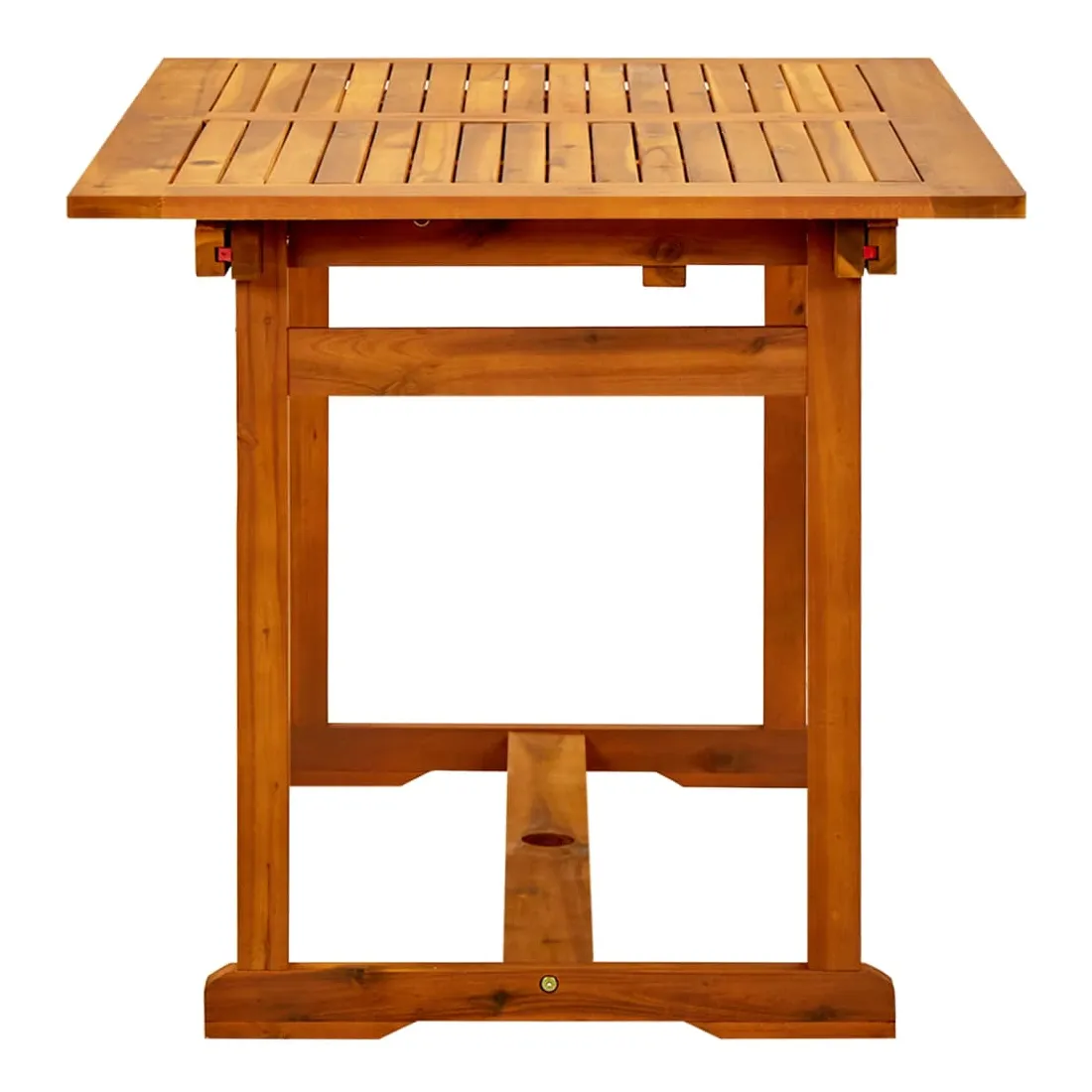Cette table à dîner en bois ajoute une touche de charme rustique à votre jardin, terrasse ou patio ! Matériau durable : le bois d'acacia massif est un matériau naturel magnifique. Le bois d'acacia un bois dur tropical, qui est dense, robuste et durable.Dessus de table extensible : grâce à sa conception spéciale, cette table de jardin peut être étendue lorsque de l'espace supplémentaire est nécessaire.Facile à nettoyer : la surface à finition à l'huile rend cette table facile à nettoyer avec un chiffon humide. Bon à savoir :Pour que vos meubles d'extérieur restent beaux, nous vous recommandons de les protéger avec une housse imperméable.