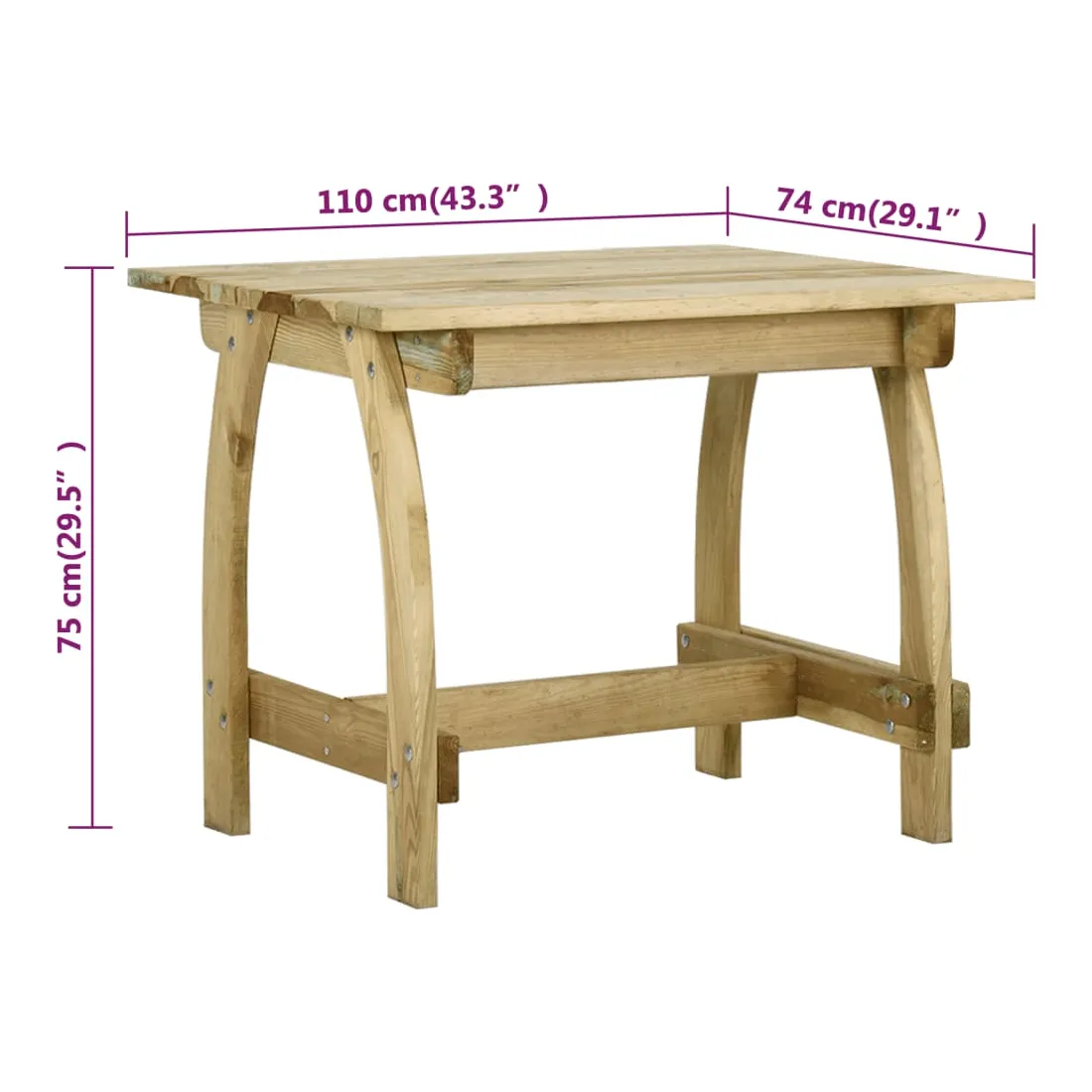 Avec un design élégant mais pratique, cette table de jardin en bois sublimera votre espace de vie extérieur ! Fabriqué en bois de pin imprégné de vert, cette table d'extérieur en bois est très solide, durable et résistant à la corrosion. Cette table de patio est un choix idéal pour les moments de détente dans un jardin de maison de campagne romantique ou près d'un étang de jardin idyllique pour dîner en famille et entre amis. Veuillez noter que le bois est un produit naturel et peut présenter des imperfections. Remarque : afin de prolonger la durée de vie des meubles d'extérieur, nous vous recommandons de les protéger avec une housse imperméable.