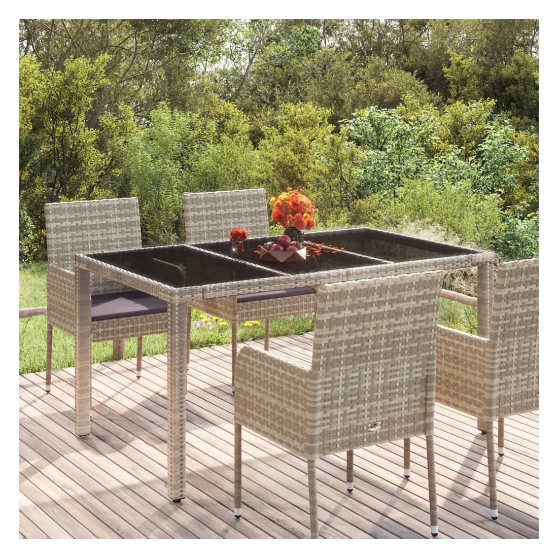 Cette table de jardin avec dessus en verre, conçue avec des lignes épurées et simples, est un excellent choix pour votre jardin, terrasse et tout autre espace extérieur. Matériau haut de gamme : la résine tressée est un matériau de résistance exceptionnelle et durable dans différentes conditions météorologiques.Cadre stable : le cadre en acier enduit de poudre assure la robustesse et la stabilité.Dessus de table pratique : le dessus de table en verre trempé est parfait pour placer ou afficher vos divers objets essentiels. De plus, il est facile à nettoyer et à entretenir.Design résistant à l'eau : fabriqué en matériau résistant à l'eau, ce produit peut résister à l'humidité et au temps pluvieux. Il peut également être facilement nettoyé avec un chiffon humide en cas de besoin. Remarque :Chaque produit est livré avec un manuel de montage dans la boîte pour un montage facile.Afin de prolonger la durée de vie de votre mobilier d'extérieur, nous vous recommandons de le protéger avec une housse imperméable.
