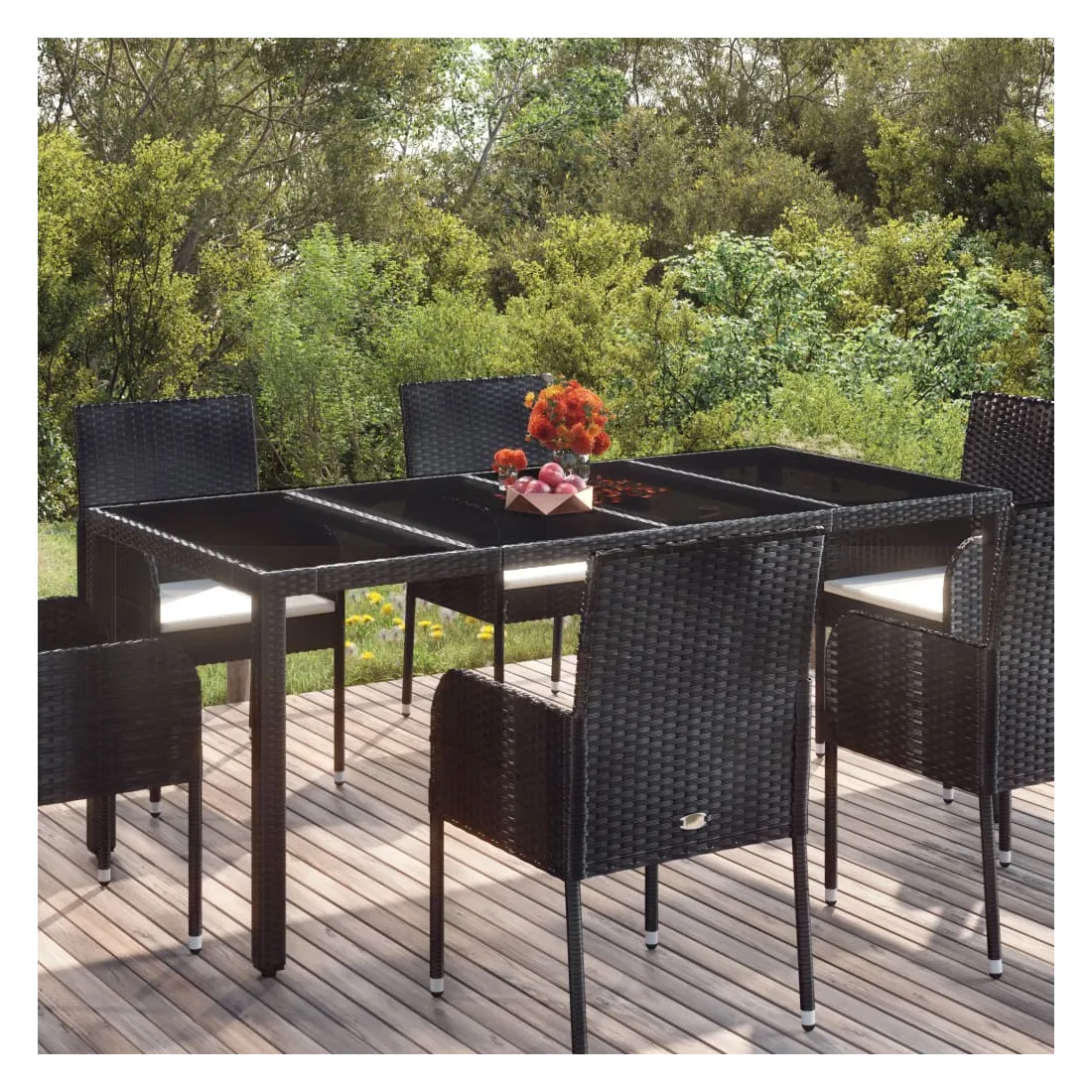 Cette table de jardin avec dessus en verre, conçue avec des lignes épurées et simples, est un excellent choix pour votre jardin, terrasse et tout autre espace extérieur. Matériau haut de gamme : la résine tressée est un matériau de résistance exceptionnelle et durable dans différentes conditions météorologiques.Cadre stable : le cadre en acier enduit de poudre assure la robustesse et la stabilité.Dessus de table pratique : le dessus de table en verre trempé est parfait pour placer ou afficher vos divers objets essentiels. De plus, il est facile à nettoyer et à entretenir.Design résistant à l'eau : fabriqué en matériau résistant à l'eau, ce produit peut résister à l'humidité et au temps pluvieux. Il peut également être facilement nettoyé avec un chiffon humide en cas de besoin. Bon à savoir :Afin de prolonger la durée de vie de votre mobilier d'extérieur, nous vous recommandons de le protéger avec une housse imperméable.