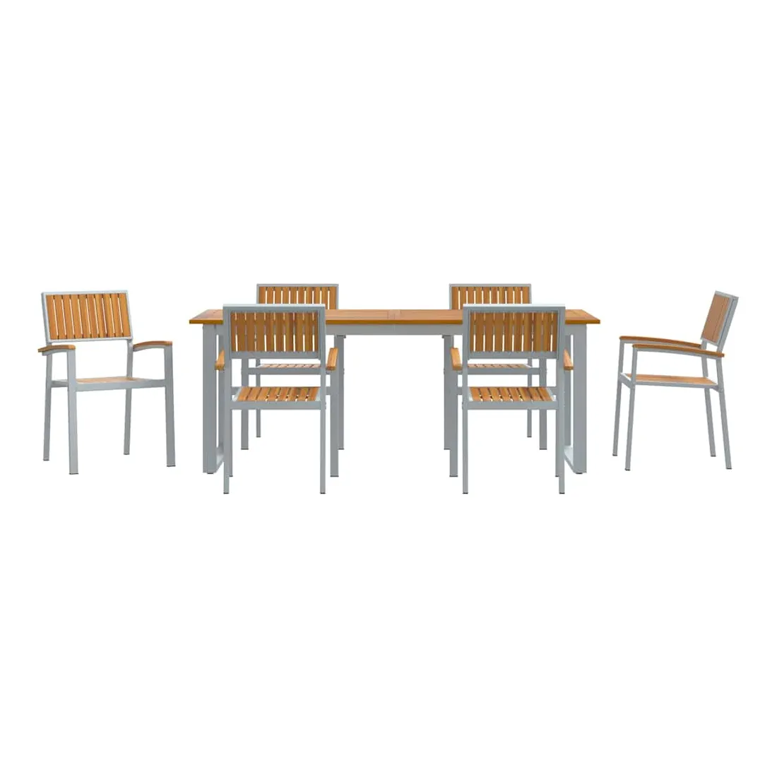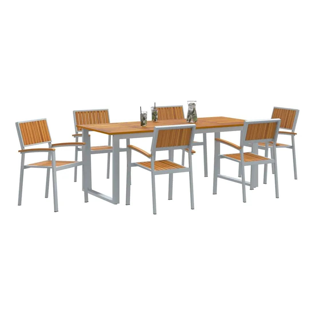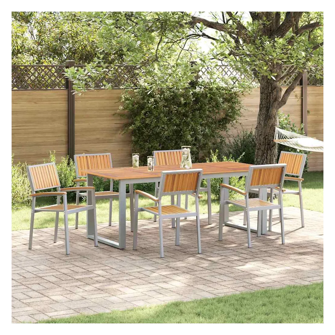 Cet ensemble moderne de salle à manger de jardin est fait pour les espaces extérieurs actuels, offrant une solution à la fois stylée et pratique pour vos repas en plein air. Avec ses lignes épurées et sa simplicité, il se fond facilement dans presque tous les cadres extérieurs, vous permettant de profiter de bons repas et de moments entre amis. La finition en bois d'acacia et la forme géométrique ajoutent un côté naturel et chic qui embellit votre ambiance extérieure. Matériaux de qualité : Cet ensemble est fait de bois d'acacia massif, connu pour sa belle texture et son côté naturel. Le cadre en acier robuste assure une résistance aux intempéries, garantissant durabilité et allure sous le soleil comme sous la pluie, idéal pour les repas en extérieur toute l'année. Composants inclus : Comprend des accoudoirs et dossiers en bois d'acacia solide, plus une grande table rectangulaire. Le bois d'acacia apporte confort et longévité, parfait pour partager des repas en famille et des soirées en extérieur. Style et fonction : Le design moderne avec ses lignes épurées et peu de fioritures donne une impression accueillante mais discrète. Il s'adapte aisément à différents styles de déco, apportant une touche moderne à vos jardins ou terrasses. Utilisations recommandées : Idéal pour jardins et terrasses, cet ensemble est parfait pour toutes vos activités extérieures, des petits rassemblements aux grandes fêtes. Sa taille généreuse permet d’accueillir plusieurs invités avec de bons plats. Entretien facile : Pour garder votre ensemble au top, un petit coup de chiffon sec pour la poussière suffit. Sa résistance à l'usure permet un entretien simple et un plaisir qui dure.