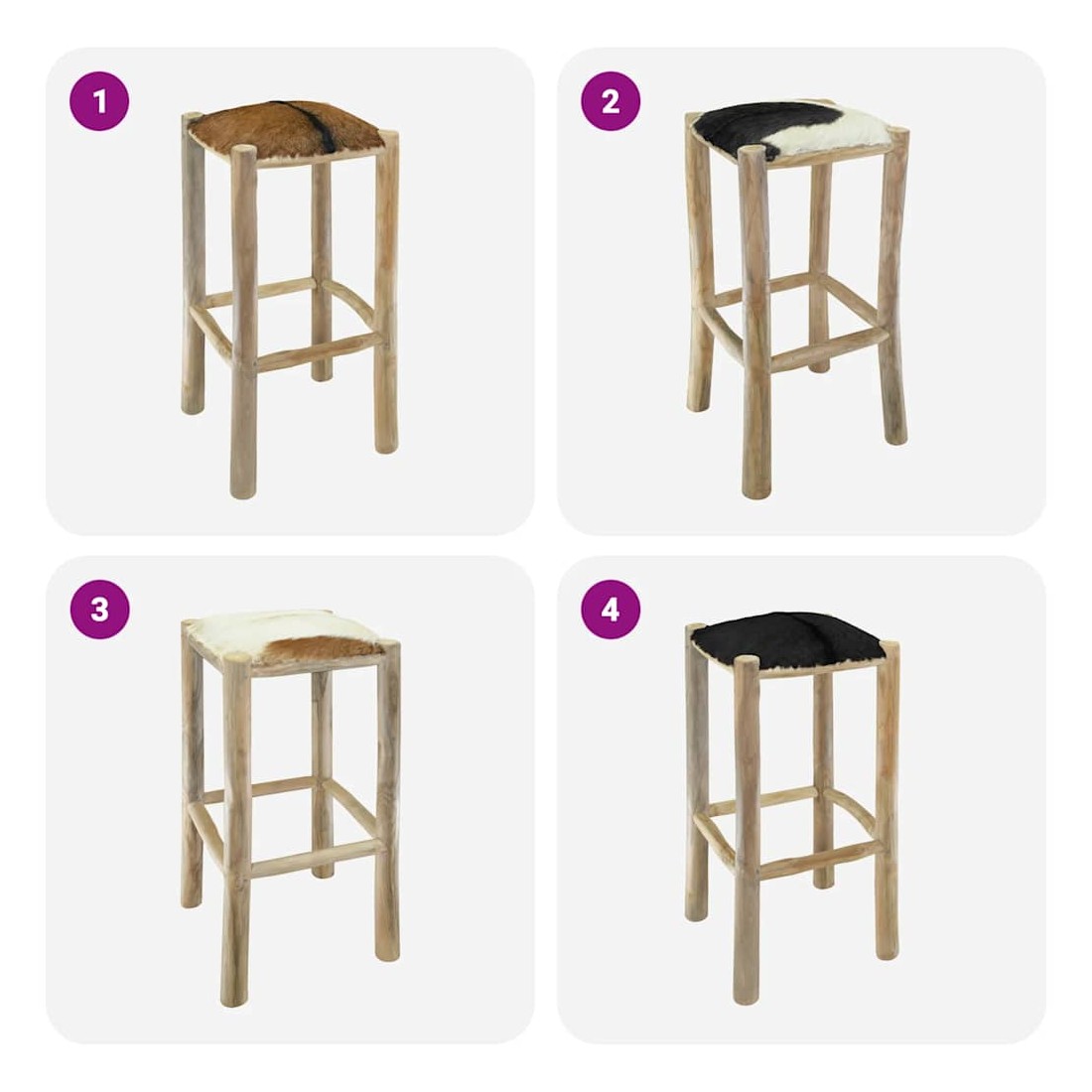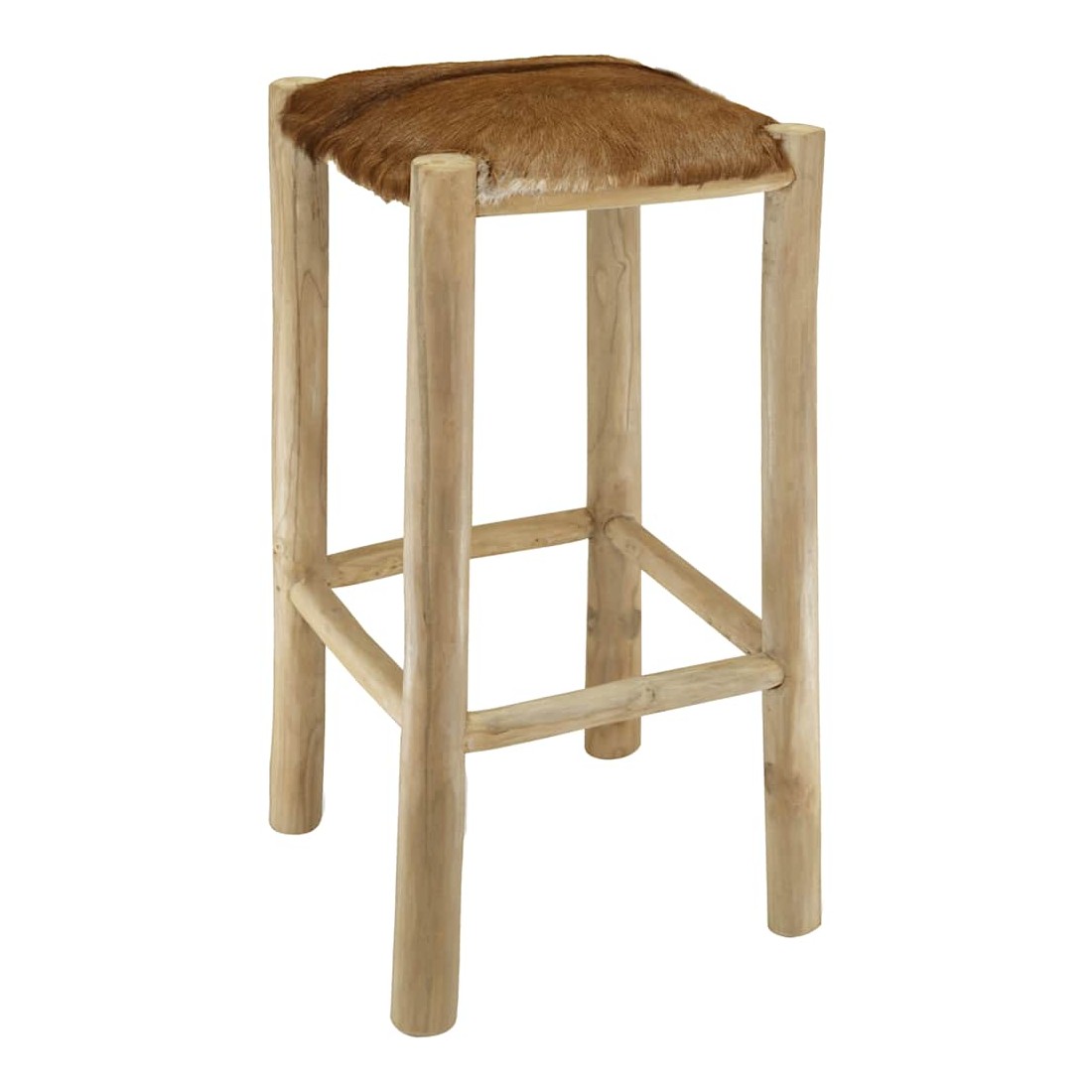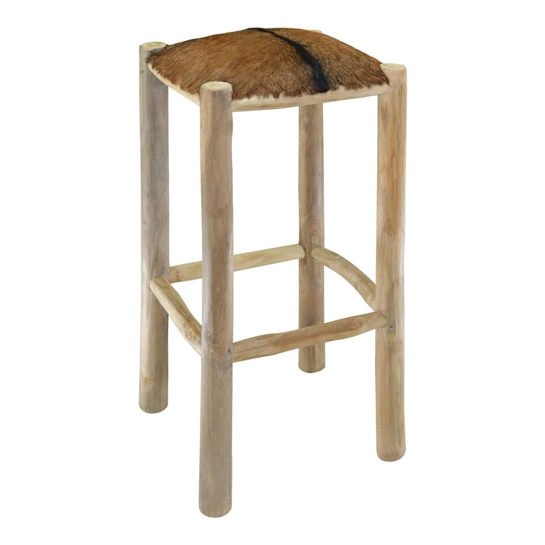 Ce tabouret de bar en cuir de chèvre véritable a un design unique et saisissant et ajoutera une touche de charme rustique aux restaurants ou aux bars, mais aussi à votre salon ou salle à manger à la maison. Le tabouret de bar a un cadre solide en teck, le rendant stable et très durable. Le siège est recouvert de cuir de chèvre 100 % véritable, résistant, durable et flexible, avec le motif de cuir de chèvre. Le cuir de chèvre poilu est doux au toucher et confortable. Le beau motif en cuir naturel rend chacune de nos chaises de bar unique et légèrement différente de la suivante. Grâce au rembourrage doux dans le siège, vous apprécierez le plus grand confort d'assise. Les pieds dans une couleur de bois naturel s'ajoutent à l'aspect rustique du tabouret. Remarque : Les couleurs et les motifs varient d'une pièce à l'autre. La livraison est aléatoire. L'article est déjà assemblé ; aucun assemblage n'est requis.