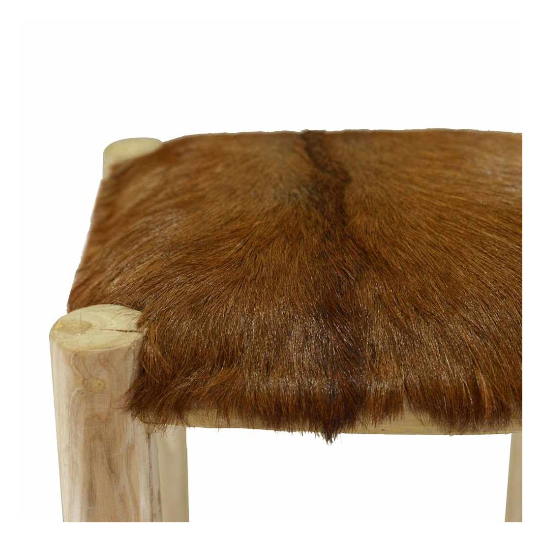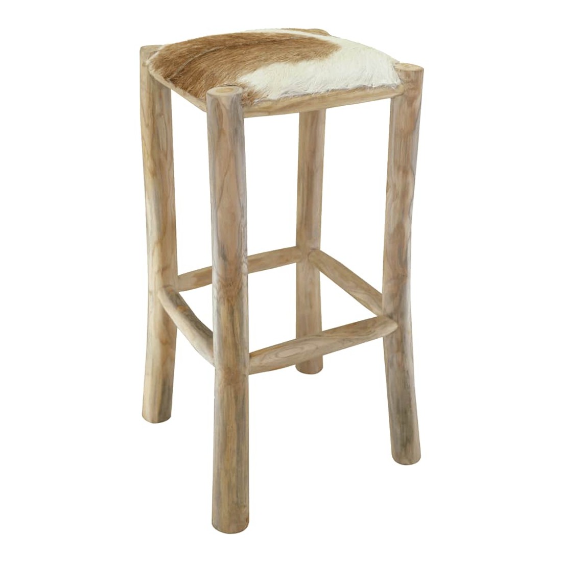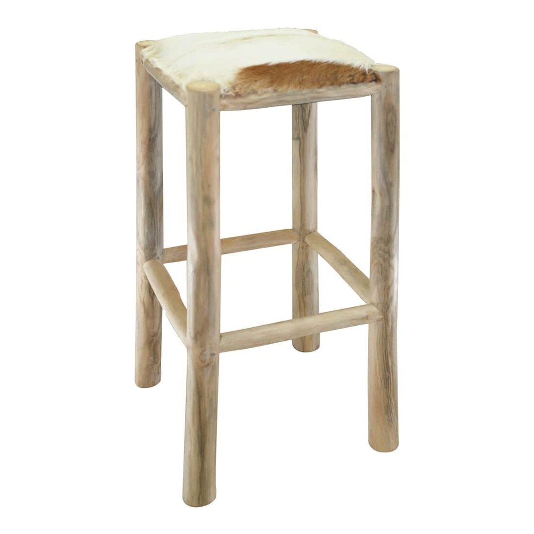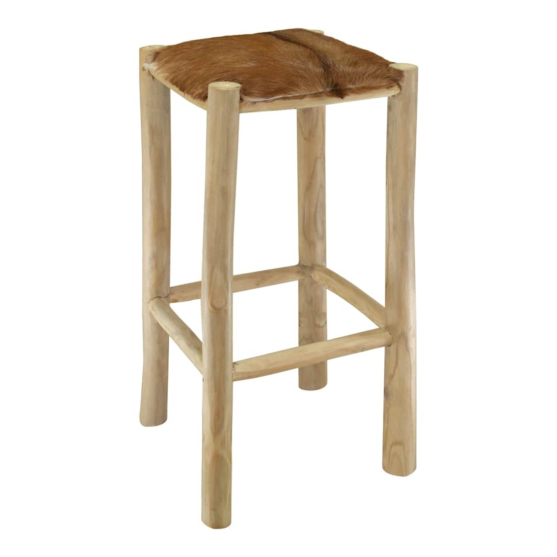 Ce tabouret de bar en cuir de chèvre véritable a un design unique et saisissant et ajoutera une touche de charme rustique aux restaurants ou aux bars, mais aussi à votre salon ou salle à manger à la maison. Le tabouret de bar a un cadre solide en teck, le rendant stable et très durable. Le siège est recouvert de cuir de chèvre 100 % véritable, résistant, durable et flexible, avec le motif de cuir de chèvre. Le cuir de chèvre poilu est doux au toucher et confortable. Le beau motif en cuir naturel rend chacune de nos chaises de bar unique et légèrement différente de la suivante. Grâce au rembourrage doux dans le siège, vous apprécierez le plus grand confort d'assise. Les pieds dans une couleur de bois naturel s'ajoutent à l'aspect rustique du tabouret. Remarque : Les couleurs et les motifs varient d'une pièce à l'autre. La livraison est aléatoire. L'article est déjà assemblé ; aucun assemblage n'est requis.