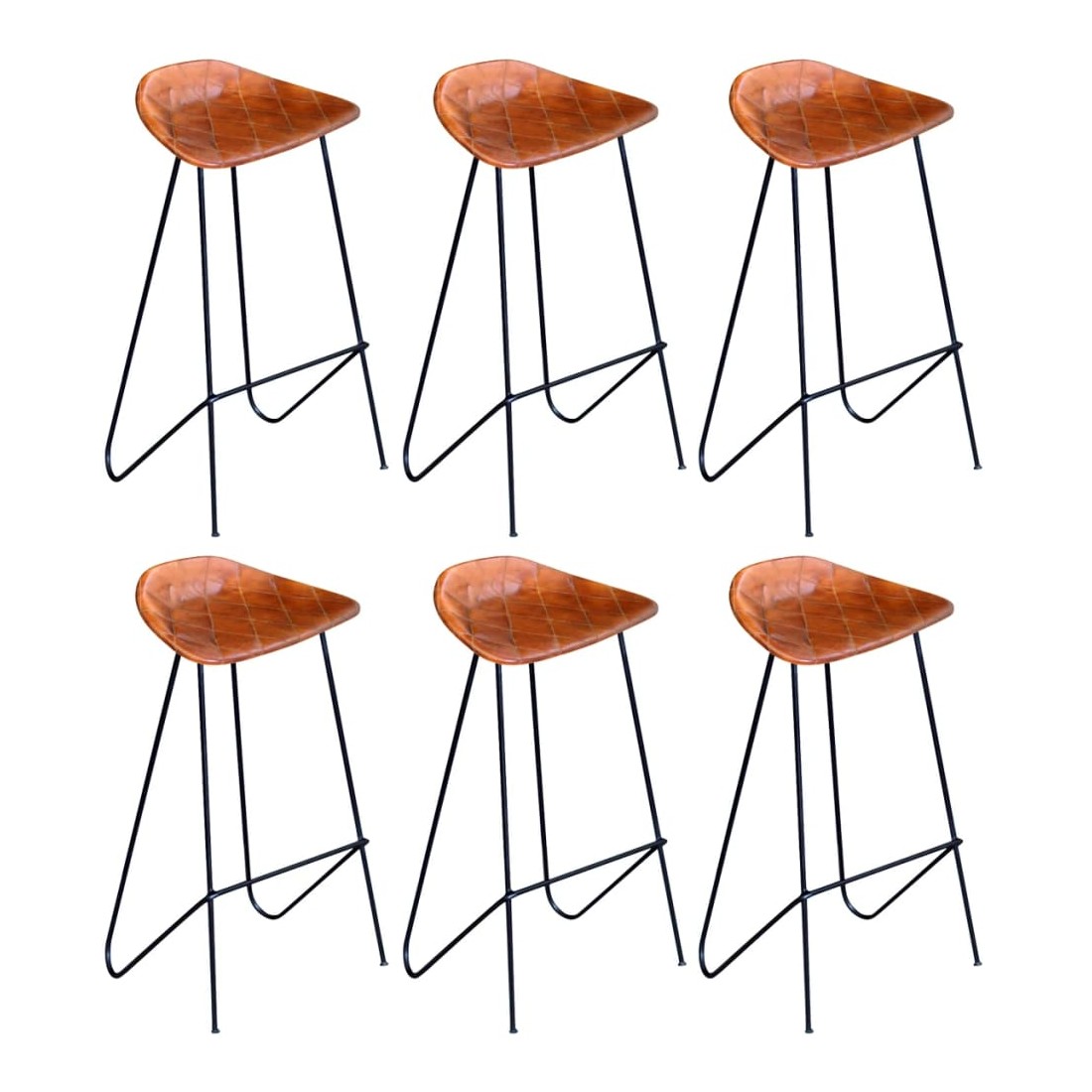 Cette chaise en cuir véritable souple et confortable a un aspect emblématique, en harmonie avec le style industriel qui fait fureur en ce moment. Cet ensemble de chaises sera parfait non seulement dans les restaurants ou les bars, mais aussi dans votre salon ou salle à manger à la maison. Le cuir véritable rembourré est doux au toucher et rend la chaise extrêmement durable. Le siège en cuir de chèvre doux avec de jolies coutures en forme de diamant rend le siège une expérience confortable, tandis que les pieds en fer solides avec repose-pieds font le tabouret stable et durable. La livraison comprend 6 chaises de bar en cuir.