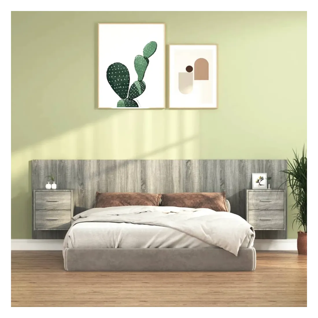 La tête de lit robuste avec armoires, au design classique, donne à votre cadre de lit un aspect complet et convient à toute chambre à coucher. Matériau robuste : le bois d'ingénierie est d'une qualité exceptionnelle avec une surface lisse et présente également résistance, stabilité et résistance à l'humidité.Design mural : les tables de chevet flottantes et la tête de lit peuvent être fixées au mur. De cette façon, vous pouvez maximiser votre espace au sol et garder la zone propre.Espace de rangement : l'unité de chevet dispose d'un espace de rangement spacieux qui vous permet de garder vos affaires organisées. ATTENTION :Les vis et les chevilles pour l'intérieur du mur ne sont pas incluses. Recherchez et utilisez des vis et des chevilles adaptées à vos murs. Si vous n'êtes pas sûr, demandez conseil à un professionnel. Lisez et suivez attentivement chaque étape des instructions.