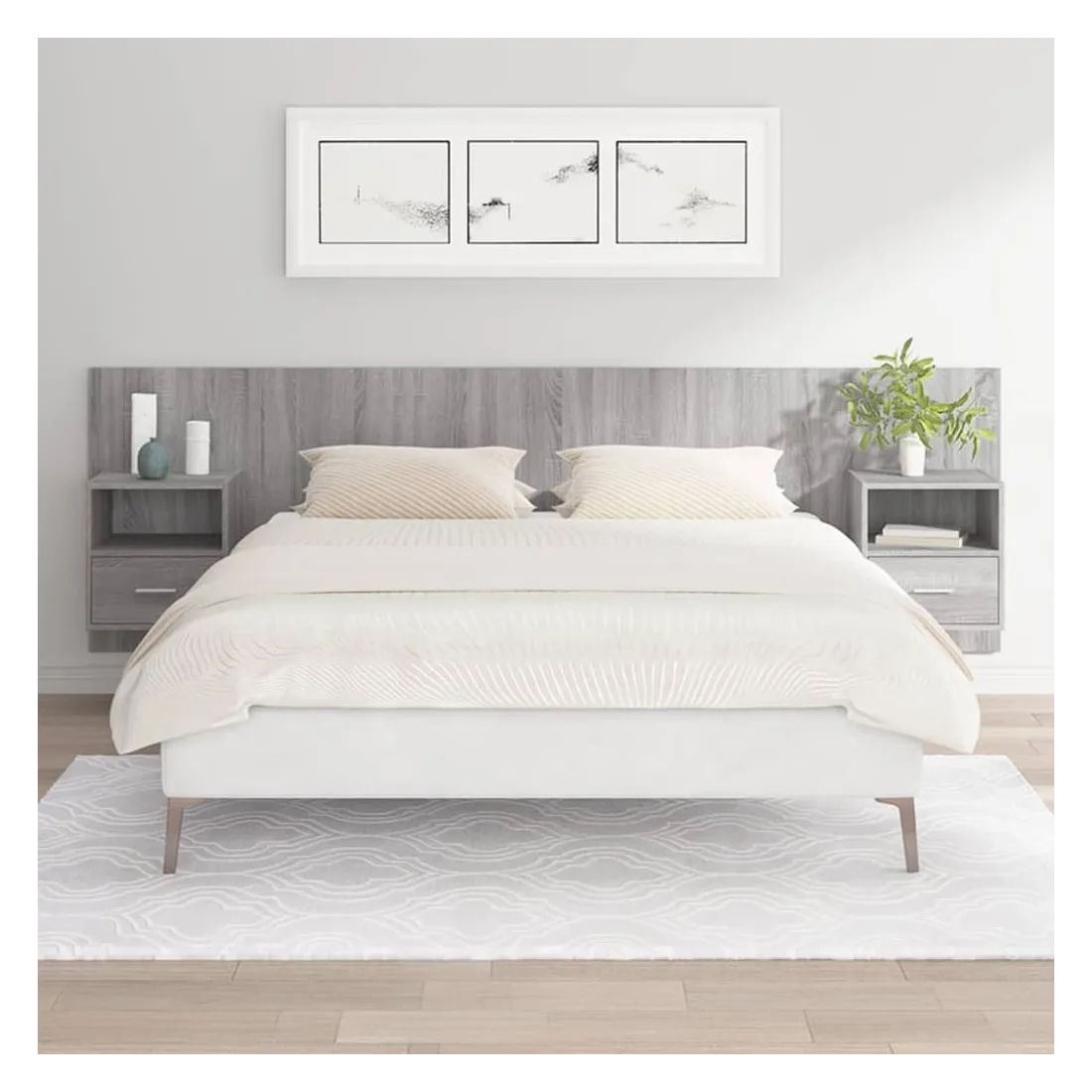 La tête de lit robuste avec armoires, au design classique, donne à votre cadre de lit un aspect complet et convient à toute chambre à coucher. Matériau robuste : le bois d'ingénierie est d'une qualité exceptionnelle avec une surface lisse et présente également résistance, stabilité et résistance à l'humidité.Design mural : les tables de chevet flottantes et la tête de lit peuvent être fixées au mur. De cette façon, vous pouvez maximiser votre espace au sol et garder la zone propre.Espace de rangement : l'unité de chevet dispose d'un espace de rangement spacieux qui vous permet de garder vos affaires organisées. ATTENTION :Les vis et les chevilles pour l'intérieur du mur ne sont pas incluses. Recherchez et utilisez des vis et des chevilles adaptées à vos murs. Si vous n'êtes pas sûr, demandez conseil à un professionnel. Lisez et suivez attentivement chaque étape des instructions.