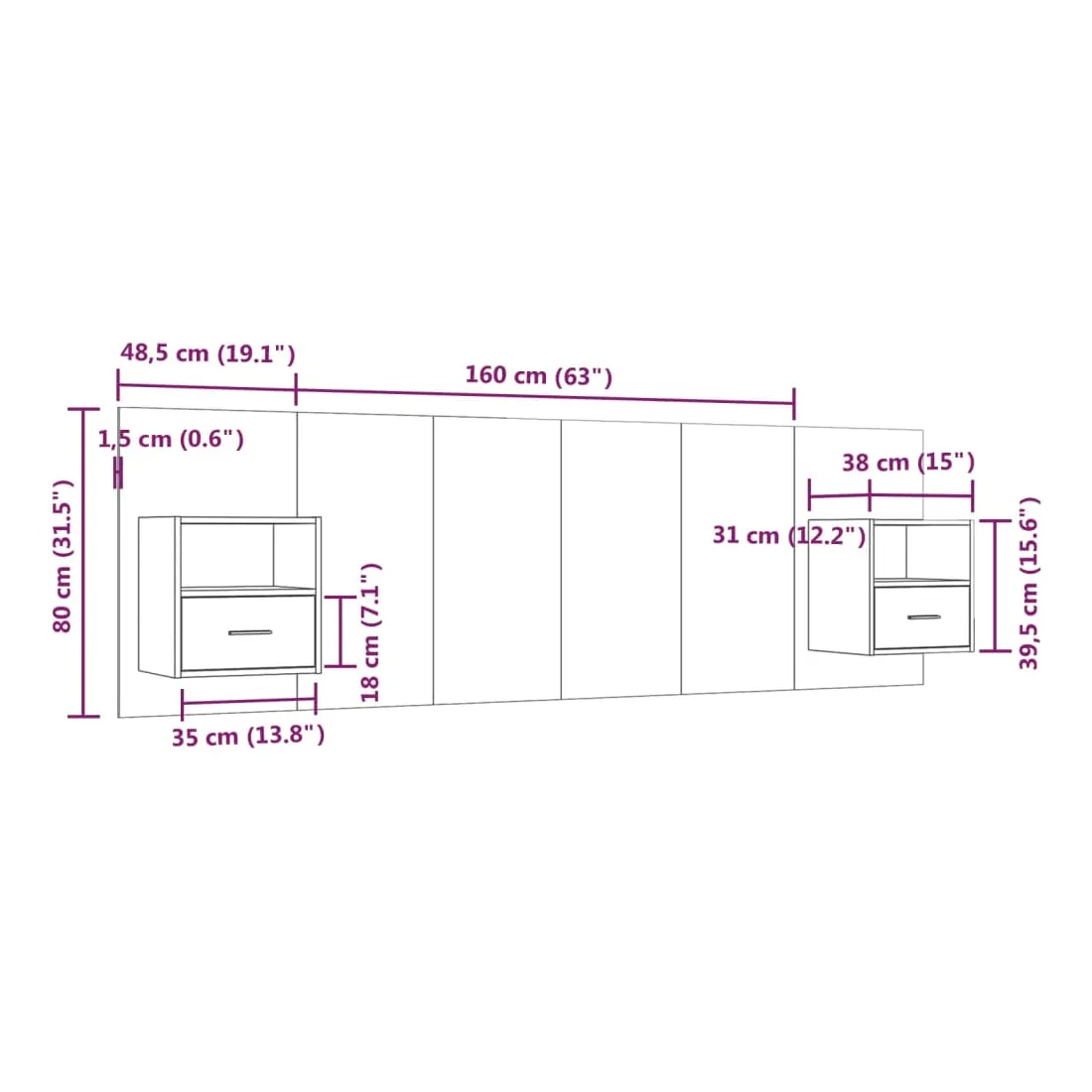 • Dimensions de la tête de lit : 160 x 1,5 x 80 cm (L x l x H)