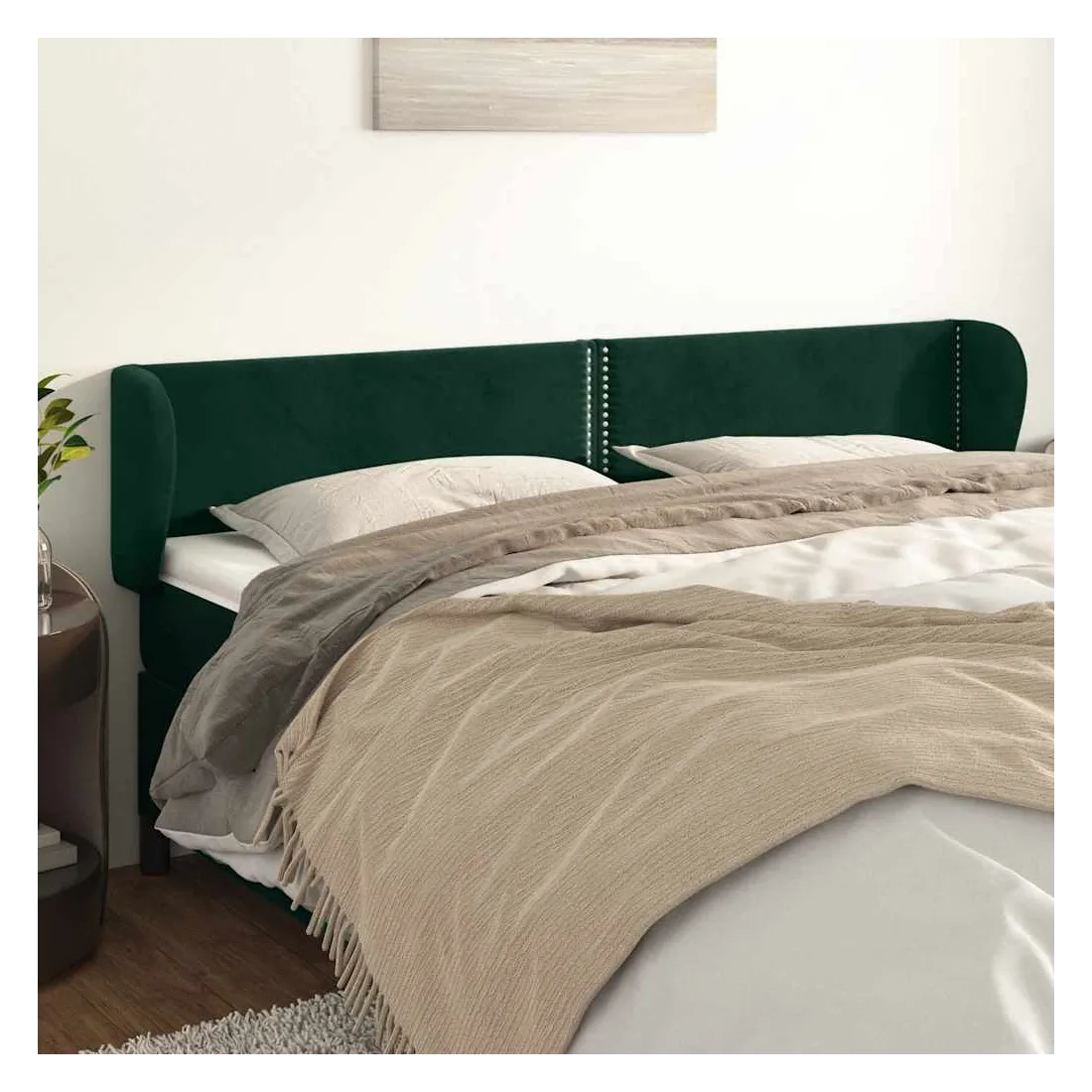 Cette tête de lit avec oreilles classique au design élégant donne à votre cadre de lit un aspect complet et convient à toute chambre à coucher. Velours doux : le velours est un tissu doux et luxueux qui se reconnaît à son tas dense de fibres uniformément coupées qui ont une touche lisse. Le tissu en velours présente un toucher doux distinctif, ce qui le rend confortable au toucher.Pieds robustes et stables : les pieds en bois assurent la robustesse et la stabilité.Hauteur réglable : la tête de lit est réglable en hauteur selon vos préférences.Excellent soutien : la tête de lit vous offre un excellent soutien du dos lorsque vous êtes assis dans votre lit pour lire ou regarder la télévision.Design élégant : les rivets le long des bords augmentent la beauté classique de la tête de lit rembourrée. Remarque :La livraison comprend uniquement la tête de lit. Le cadre de lit et le matelas ne sont pas inclus. Vous pouvez consulter notre boutique pour les cadres et matelas assortis.Chaque produit est livré avec un manuel de montage dans la boîte pour un montage facile.