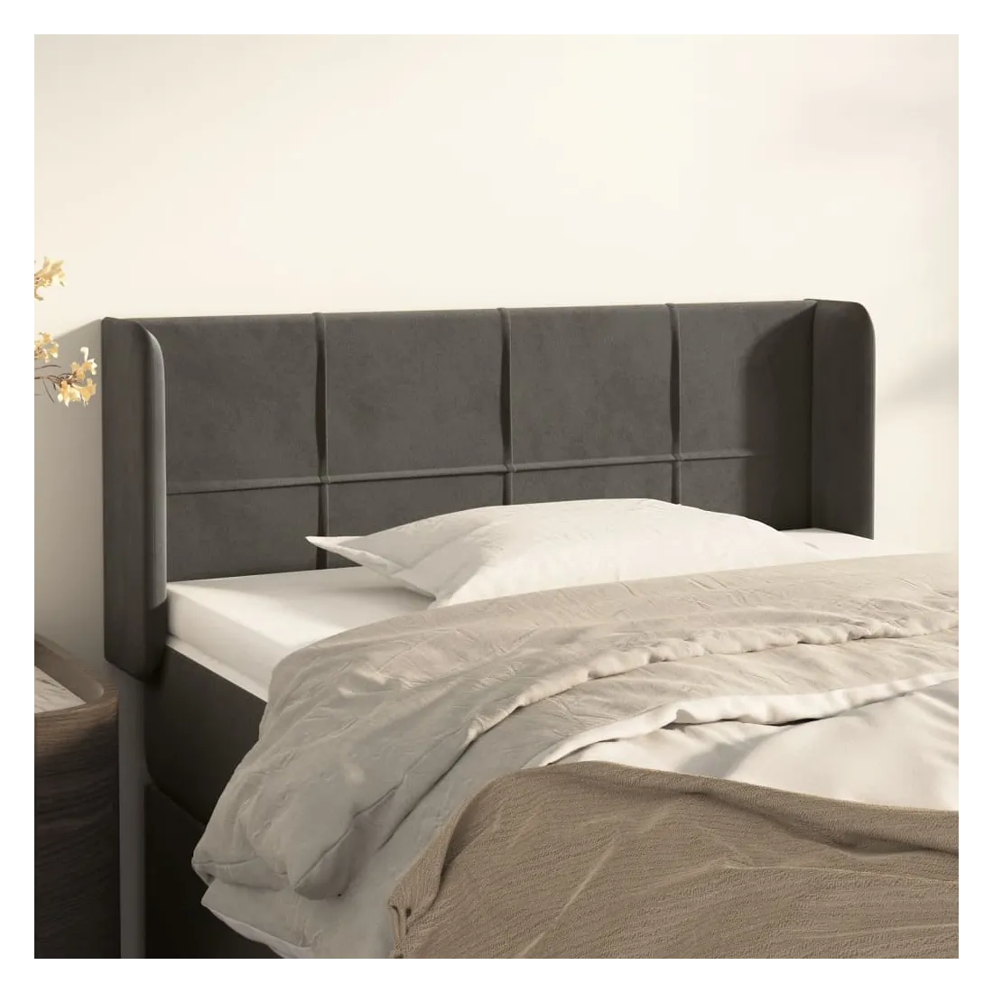 Cette tête de lit avec oreilles classique au design élégant donne à votre cadre de lit un aspect complet et convient à toute chambre à coucher. Velours doux : le velours est un tissu doux et luxueux qui se reconnaît à son tas dense de fibres uniformément coupées qui ont une touche lisse. Le tissu en velours présente un toucher doux distinctif, ce qui le rend confortable au toucher.Pieds robustes et stables : les pieds en bois assurent la robustesse et la stabilité.Hauteur réglable : la tête de lit est réglable en hauteur selon vos préférences.Excellent soutien : la tête de lit vous offre un excellent soutien du dos lorsque vous êtes assis dans votre lit pour lire ou regarder la télévision. Remarque :La livraison comprend uniquement la tête de lit. Le cadre de lit et le matelas ne sont pas inclus. Vous pouvez consulter notre boutique pour les cadres et matelas assortis.Chaque produit est livré avec un manuel de montage dans la boîte pour un montage facile.