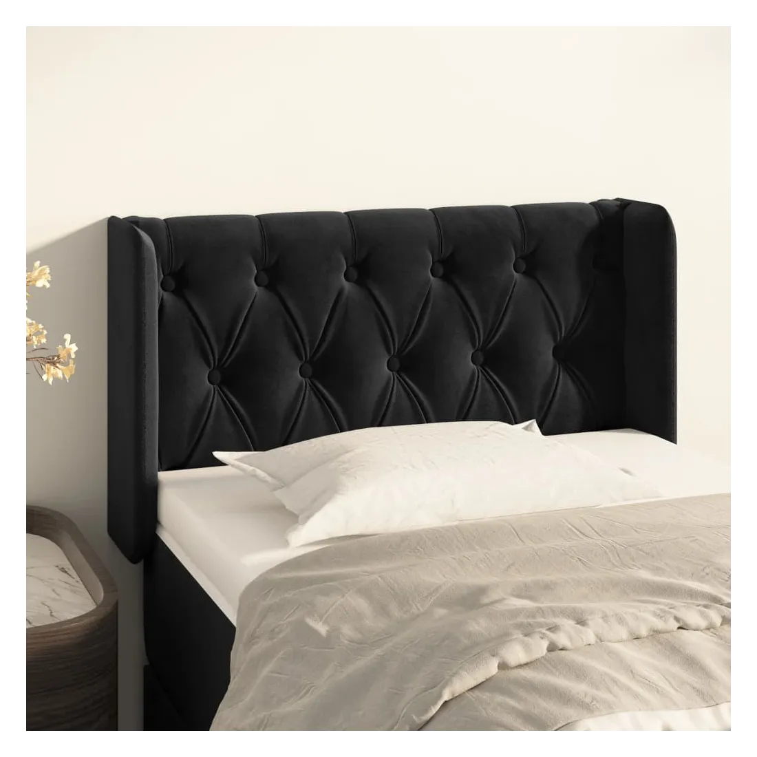 Cette tête de lit avec oreilles classique au design élégant donne à votre cadre de lit un aspect complet et convient à toute chambre à coucher. Velours doux : le velours est un tissu doux et luxueux qui se reconnaît à son tas dense de fibres uniformément coupées qui ont une touche lisse. Le tissu en velours présente un toucher doux distinctif, ce qui le rend confortable au toucher.Pieds robustes et stables : les pieds en bois assurent la robustesse et la stabilité.Hauteur réglable : la tête de lit est réglable en hauteur selon vos préférences.Excellent soutien : la tête de lit vous offre un excellent soutien du dos lorsque vous êtes assis dans votre lit pour lire ou regarder la télévision. Remarque :La livraison comprend uniquement la tête de lit. Le cadre de lit et le matelas ne sont pas inclus. Vous pouvez consulter notre boutique pour les cadres et matelas assortis.Chaque produit est livré avec un manuel de montage dans la boîte pour un montage facile.