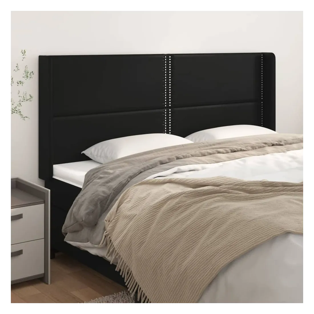 Cette tête de lit avec oreilles classique au design élégant donne à votre cadre de lit un aspect complet et convient à toute chambre à coucher. Similicuir durable : le similicuir de qualité supérieure est un matériau très durable. Il est résistant aux taches, ce qui le rend facile à nettoyer avec un chiffon humide. La surface lisse donne également un aspect luxueux et la beauté du cuir véritable.Pieds robustes et stables : les pieds en bois assurent la robustesse et la stabilité.Hauteur réglable : la tête de lit est réglable en hauteur selon vos préférences.Excellent soutien : la tête de lit vous offre un excellent soutien du dos lorsque vous êtes assis dans votre lit pour lire ou regarder la télévision. Remarque :La livraison comprend uniquement la tête de lit. Le cadre de lit et le matelas ne sont pas inclus. Vous pouvez consulter notre boutique pour les cadres et matelas assortis.Chaque produit est livré avec un manuel de montage dans la boîte pour un montage facile.