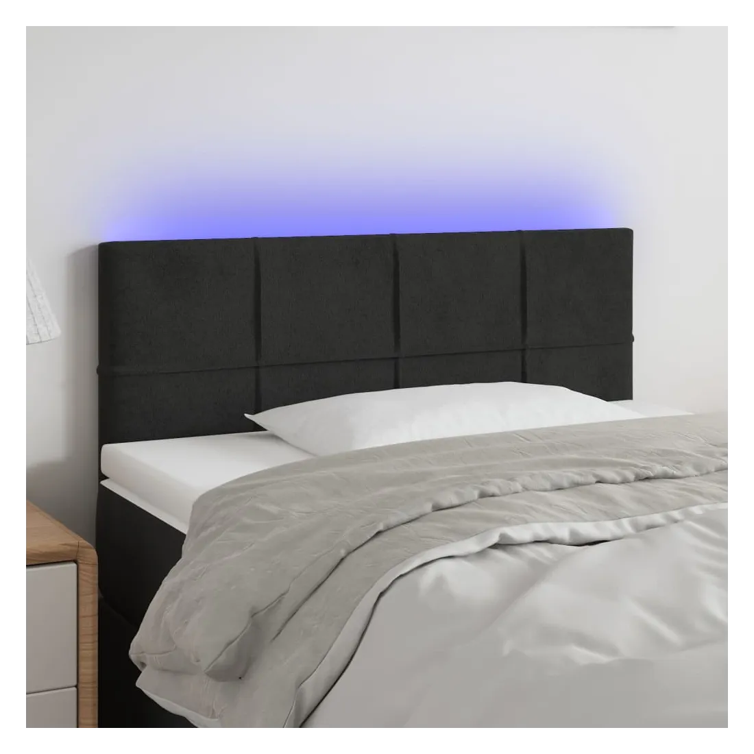 Cette tête de lit à LED classique, au design élégant, donne à votre cadre de lit une touche de modernité étonnante et convient parfaitement à toute chambre à coucher. Velours doux : le velours est un tissu doux et luxueux qui se reconnaît à son tas dense de fibres uniformément coupées qui ont une touche lisse. Le tissu en velours présente un toucher doux distinctif, ce qui le rend confortable au toucher.LED colorée : apportez de l'éclairage dans l'obscurité avec des lumières LED colorées !Hauteur réglable : la tête de lit est réglable en hauteur selon vos préférences.Excellent soutien : la tête de lit vous offre un excellent soutien du dos lorsque vous êtes assis dans votre lit pour lire ou regarder la télévision.Bande à LED découpable : cette bande à LED flexible peut être ajustée en longueur. Le symbole des ciseaux indique où la bande peut être coupée en toute sécurité sans l'endommager. Remarque :Seule la partie avec un symbole de ciseaux peut être coupée et seule la partie avec l'USB continuera à fonctionner comme avant.Chaque produit est livré avec un manuel de montage dans la boîte pour un montage facile.Ce produit est doté d'un connecteur USB, mais la source d'alimentation certifiée de USB 5V n'est pas incluse.