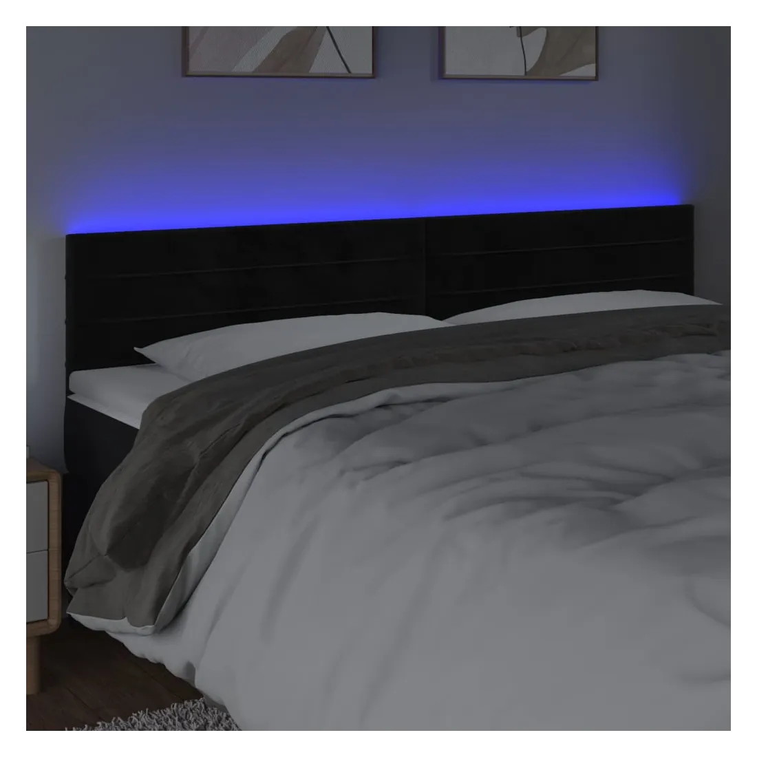 Cette tête de lit à LED classique, au design élégant, donne à votre cadre de lit une touche de modernité étonnante et convient parfaitement à toute chambre à coucher. Velours doux : le velours est un tissu doux et luxueux qui se reconnaît à son tas dense de fibres uniformément coupées qui ont une touche lisse. Le tissu en velours présente un toucher doux distinctif, ce qui le rend confortable au toucher.LED colorée : apportez de l'éclairage dans l'obscurité avec des lumières LED colorées !Hauteur réglable : la tête de lit est réglable en hauteur selon vos préférences.Excellent soutien : la tête de lit vous offre un excellent soutien du dos lorsque vous êtes assis dans votre lit pour lire ou regarder la télévision.Bande à LED découpable : cette bande à LED flexible peut être ajustée en longueur. Le symbole des ciseaux indique où la bande peut être coupée en toute sécurité sans l'endommager. Remarque :Seule la partie avec un symbole de ciseaux peut être coupée et seule la partie avec l'USB continuera à fonctionner comme avant.Chaque produit est livré avec un manuel de montage dans la boîte pour un montage facile.Ce produit est doté d'un connecteur USB, mais la source d'alimentation certifiée de USB 5V n'est pas incluse.