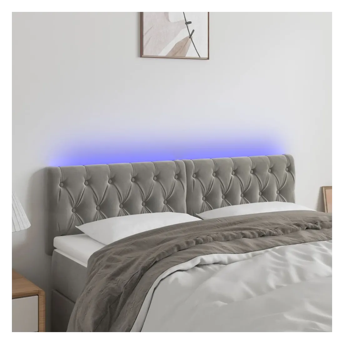 Cette tête de lit à LED classique, au design élégant, donne à votre cadre de lit une touche de modernité étonnante et convient parfaitement à toute chambre à coucher. Velours doux : le velours est un tissu doux et luxueux qui se reconnaît à son tas dense de fibres uniformément coupées qui ont une touche lisse. Le tissu en velours présente un toucher doux distinctif, ce qui le rend confortable au toucher.LED colorée : apportez de l'éclairage dans l'obscurité avec des lumières LED colorées !Hauteur réglable : la tête de lit est réglable en hauteur selon vos préférences.Excellent soutien : la tête de lit vous offre un excellent soutien du dos lorsque vous êtes assis dans votre lit pour lire ou regarder la télévision.Bande à LED découpable : cette bande à LED flexible peut être ajustée en longueur. Le symbole des ciseaux indique où la bande peut être coupée en toute sécurité sans l'endommager. Remarque :Seule la partie avec un symbole de ciseaux peut être coupée et seule la partie avec l'USB continuera à fonctionner comme avant.Chaque produit est livré avec un manuel de montage dans la boîte pour un montage facile.Ce produit est doté d'un connecteur USB, mais la source d'alimentation certifiée de USB 5V n'est pas incluse.