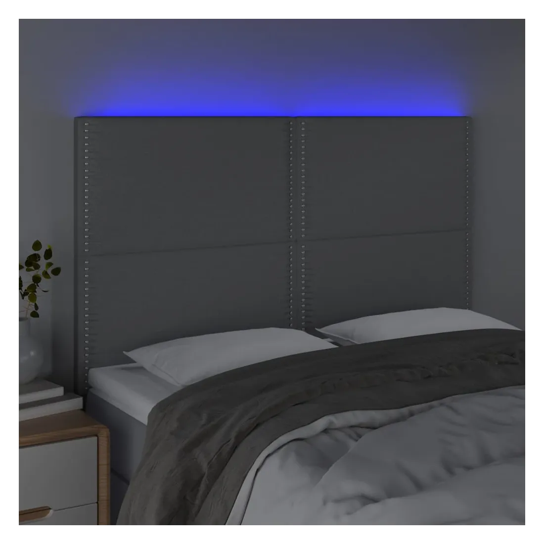 Cette tête de lit à LED classique, au design élégant, donne à votre cadre de lit une touche de modernité étonnante et convient parfaitement à toute chambre à coucher. Tissu durable : le tissu présente un aspect simple et épuré, et il est respirant et durable. LED colorée : apportez de l'éclairage dans l'obscurité avec des lumières LED colorées ! Hauteur réglable : la tête de lit est réglable en hauteur selon vos préférences. Excellent soutien : la tête de lit vous offre un excellent soutien du dos lorsque vous êtes assis dans votre lit pour lire ou regarder la télévision. Bande à LED découpable : cette bande à LED flexible peut être ajustée en longueur. Le symbole des ciseaux indique où la bande peut être coupée en toute sécurité sans l'endommager. Remarque : Seule la partie avec un sy