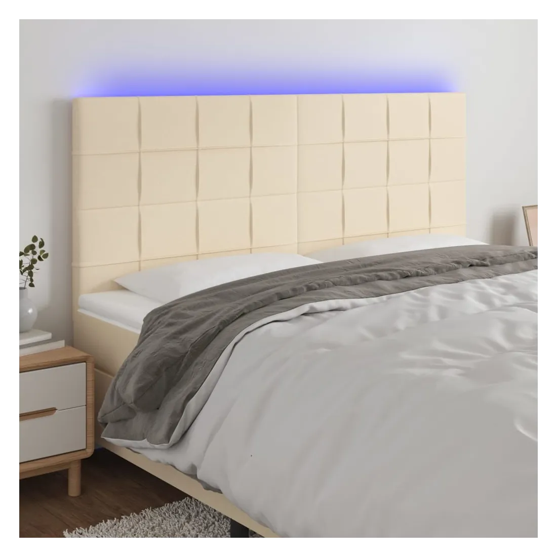 Cette tête de lit à LED classique, au design élégant, donne à votre cadre de lit une touche de modernité étonnante et convient parfaitement à toute chambre à coucher. Tissu durable : le tissu présente un aspect simple et épuré, et il est respirant et durable.LED colorée : apportez de l'éclairage dans l'obscurité avec des lumières LED colorées !Hauteur réglable : la tête de lit est réglable en hauteur selon vos préférences.Excellent soutien : la tête de lit vous offre un excellent soutien du dos lorsque vous êtes assis dans votre lit pour lire ou regarder la télévision.Bande à LED découpable : cette bande à LED flexible peut être ajustée en longueur. Le symbole des ciseaux indique où la bande peut être coupée en toute sécurité sans l'endommager. Remarque :Seule la partie avec un symbole de ciseaux peut être coupée et seule la partie avec l'USB continuera à fonctionner comme avant.Chaque produit est livré avec un manuel de montage dans la boîte pour un montage facile.Ce produit est doté d'un connecteur USB, mais la source d'alimentation certifiée de USB 5V n'est pas incluse.