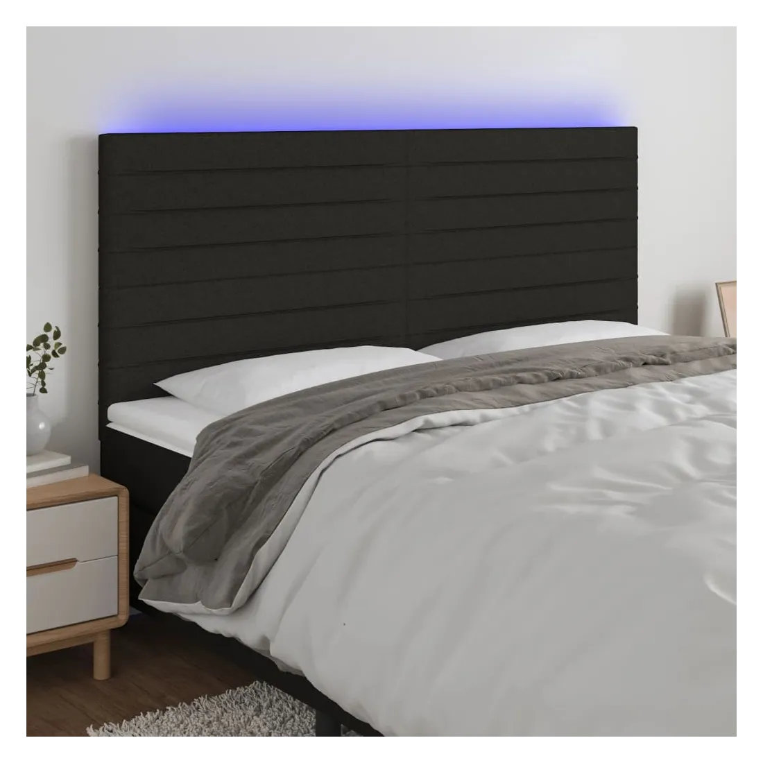 Cette tête de lit à LED classique, au design élégant, donne à votre cadre de lit une touche de modernité étonnante et convient parfaitement à toute chambre à coucher. Tissu durable : le tissu présente un aspect simple et épuré, et il est respirant et durable.LED colorée : apportez de l'éclairage dans l'obscurité avec des lumières LED colorées !Hauteur réglable : la tête de lit est réglable en hauteur selon vos préférences.Excellent soutien : la tête de lit vous offre un excellent soutien du dos lorsque vous êtes assis dans votre lit pour lire ou regarder la télévision.Bande à LED découpable : cette bande à LED flexible peut être ajustée en longueur. Le symbole des ciseaux indique où la bande peut être coupée en toute sécurité sans l'endommager. Remarque :Seule la partie avec un symbole de ciseaux peut être coupée et seule la partie avec l'USB continuera à fonctionner comme avant.Chaque produit est livré avec un manuel de montage dans la boîte pour un montage facile.Ce produit est doté d'un connecteur USB, mais la source d'alimentation certifiée de USB 5V n'est pas incluse.