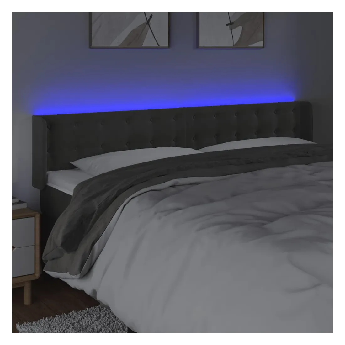 Cette tête de lit à LED classique, au design élégant, donne à votre cadre de lit une touche de modernité étonnante et convient parfaitement à toute chambre à coucher. Velours doux : le velours est un tissu doux et luxueux qui se reconnaît à son tas dense de fibres uniformément coupées qui ont une touche lisse. Le tissu en velours présente un toucher doux distinctif, ce qui le rend confortable au toucher.LED colorée : apportez de l'éclairage dans l'obscurité avec des lumières LED colorées !Hauteur réglable : la tête de lit est réglable en hauteur selon vos préférences.Excellent soutien : la tête de lit vous offre un excellent soutien du dos lorsque vous êtes assis dans votre lit pour lire ou regarder la télévision.Bande à LED découpable : cette bande à LED flexible peut être ajustée en longueur. Le symbole des ciseaux indique où la bande peut être coupée en toute sécurité sans l'endommager. Remarque :Seule la partie avec un symbole de ciseaux peut être coupée et seule la partie avec l'USB continuera à fonctionner comme avant.Chaque produit est livré avec un manuel de montage dans la boîte pour un montage facile.Ce produit est doté d'un connecteur USB, mais la source d'alimentation certifiée de USB 5V n'est pas incluse.
