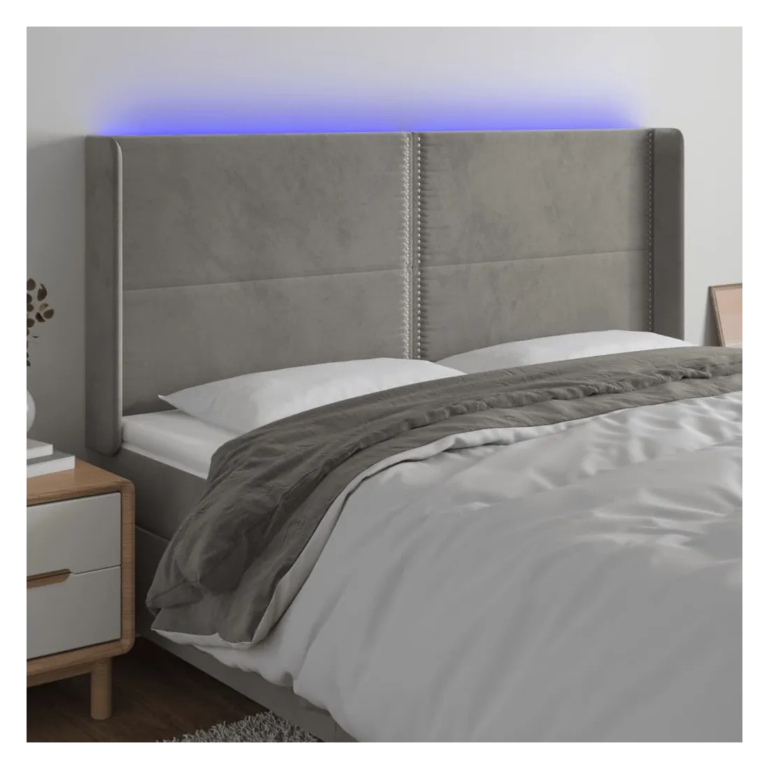 Cette tête de lit à LED classique, au design élégant, donne à votre cadre de lit une touche de modernité étonnante et convient parfaitement à toute chambre à coucher. Velours doux : le velours est un tissu doux et luxueux qui se reconnaît à son tas dense de fibres uniformément coupées qui ont une touche lisse. Le tissu en velours présente un toucher doux distinctif, ce qui le rend confortable au toucher.LED colorée : apportez de l'éclairage dans l'obscurité avec des lumières LED colorées !Hauteur réglable : la tête de lit est réglable en hauteur selon vos préférences.Excellent soutien : la tête de lit vous offre un excellent soutien du dos lorsque vous êtes assis dans votre lit pour lire ou regarder la télévision.Bande à LED découpable : cette bande à LED flexible peut être ajustée en longueur. Le symbole des ciseaux indique où la bande peut être coupée en toute sécurité sans l'endommager. Remarque :Seule la partie avec un symbole de ciseaux peut être coupée et seule la partie avec l'USB continuera à fonctionner comme avant.Chaque produit est livré avec un manuel de montage dans la boîte pour un montage facile.Ce produit est doté d'un connecteur USB, mais la source d'alimentation certifiée de USB 5V n'est pas incluse.