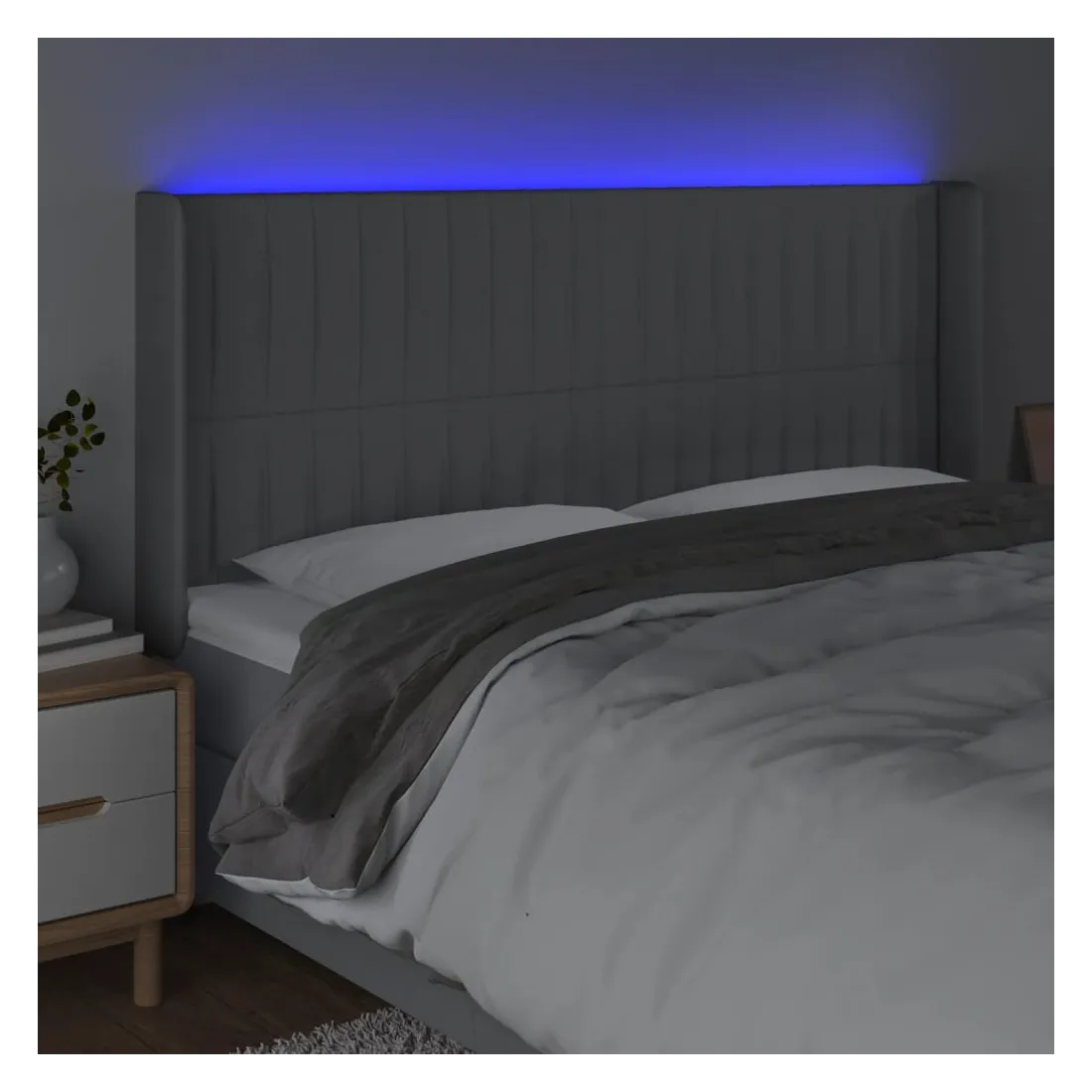 Cette tête de lit à LED classique, au design élégant, donne à votre cadre de lit une touche de modernité étonnante et convient parfaitement à toute chambre à coucher. Tissu durable : le tissu présente un aspect simple et épuré, et il est respirant et durable.LED colorée : apportez de l'éclairage dans l'obscurité avec des lumières LED colorées !Hauteur réglable : la tête de lit est réglable en hauteur selon vos préférences.Excellent soutien : la tête de lit vous offre un excellent soutien du dos lorsque vous êtes assis dans votre lit pour lire ou regarder la télévision.Bande à LED découpable : cette bande à LED flexible peut être ajustée en longueur. Le symbole des ciseaux indique où la bande peut être coupée en toute sécurité sans l'endommager. Remarque :Seule la partie avec un symbole de ciseaux peut être coupée et seule la partie avec l'USB continuera à fonctionner comme avant.Chaque produit est livré avec un manuel de montage dans la boîte pour un montage facile.Ce produit est doté d'un connecteur USB, mais la source d'alimentation certifiée de USB 5V n'est pas incluse.