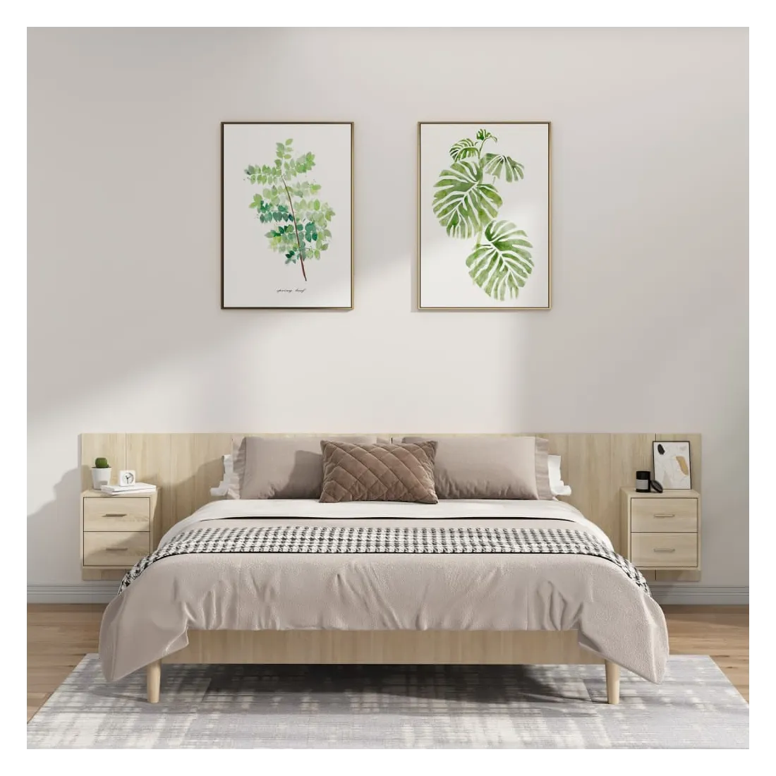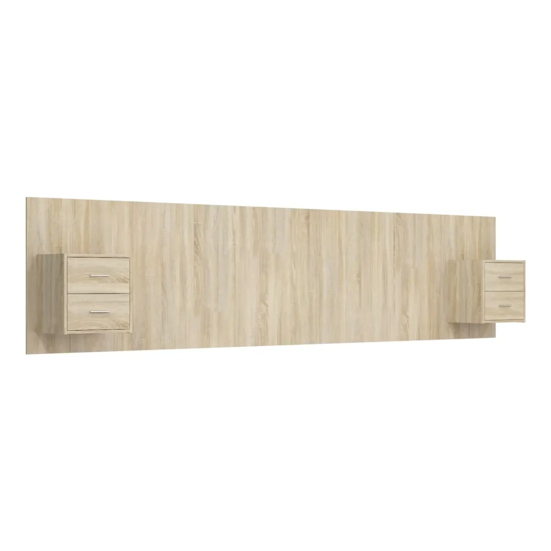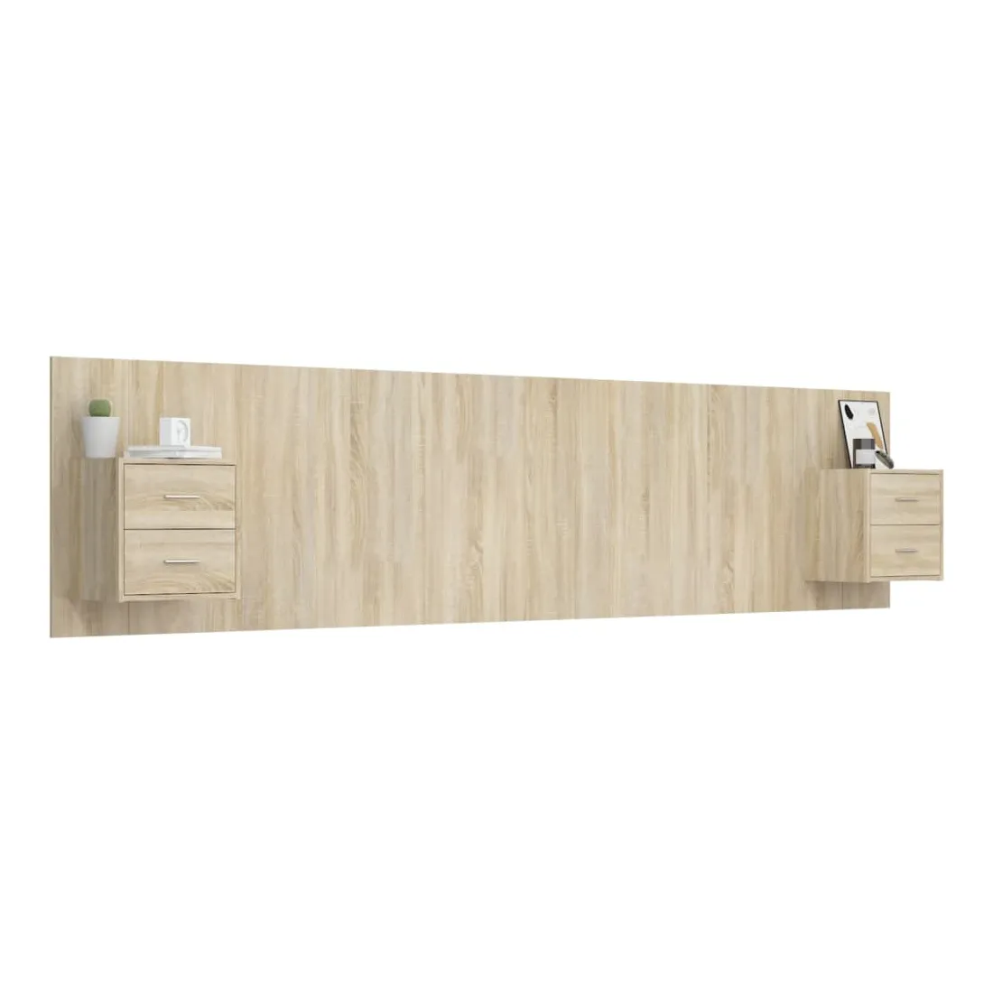 La tête de lit robuste avec armoires, au design classique, donne à votre cadre de lit un aspect complet et convient à toute chambre à coucher. Matériau robuste : le bois d'ingénierie est d'une qualité exceptionnelle avec une surface lisse et présente également résistance, stabilité et résistance à l'humidité.Design mural : les tables de chevet flottantes et la tête de lit peuvent être fixées au mur. De cette façon, vous pouvez maximiser votre espace au sol et garder la zone propre.Espace de rangement : l'unité de chevet dispose d'un espace de rangement spacieux qui vous permet de garder vos affaires organisées. ATTENTION :Les vis et les chevilles pour l'intérieur du mur ne sont pas incluses. Recherchez et utilisez des vis et des chevilles adaptées à vos murs. Si vous n'êtes pas sûr, demandez conseil à un professionnel. Lisez et suivez attentivement chaque étape des instructions.