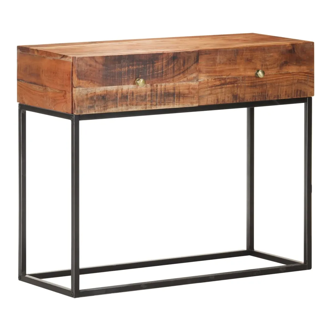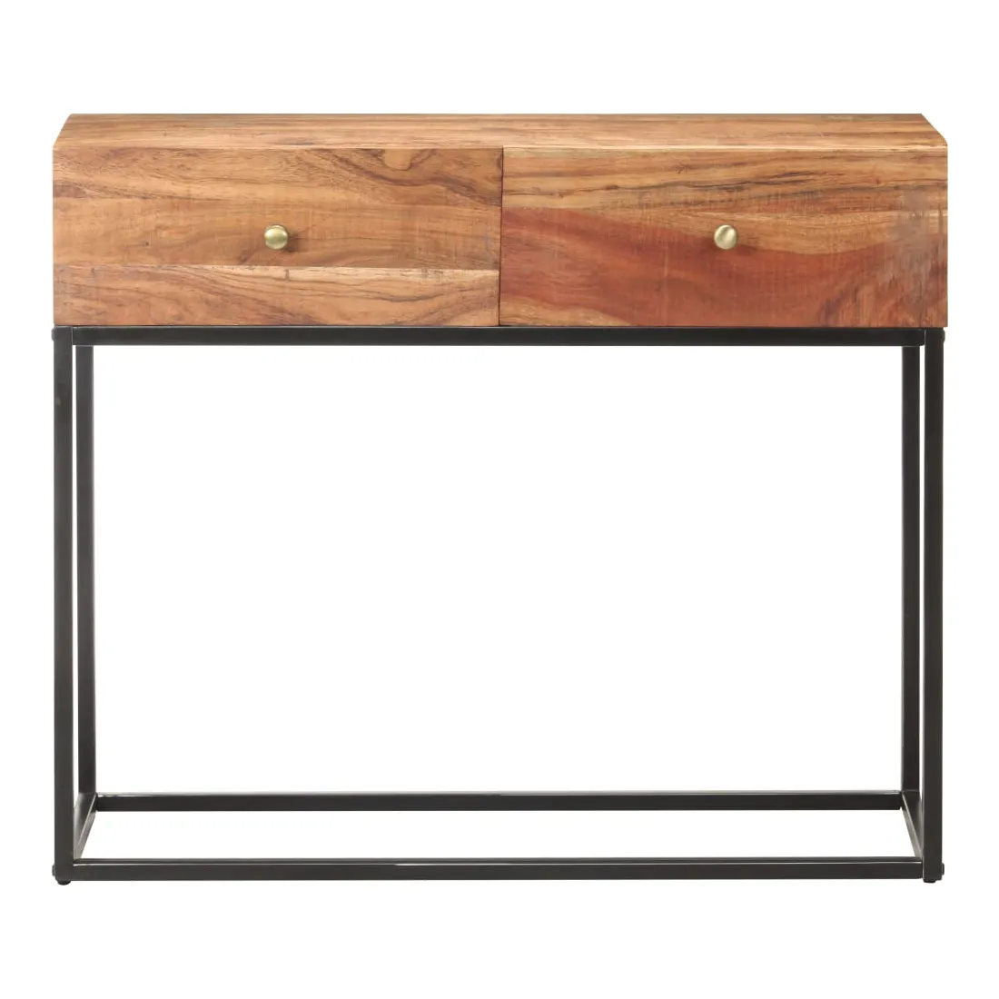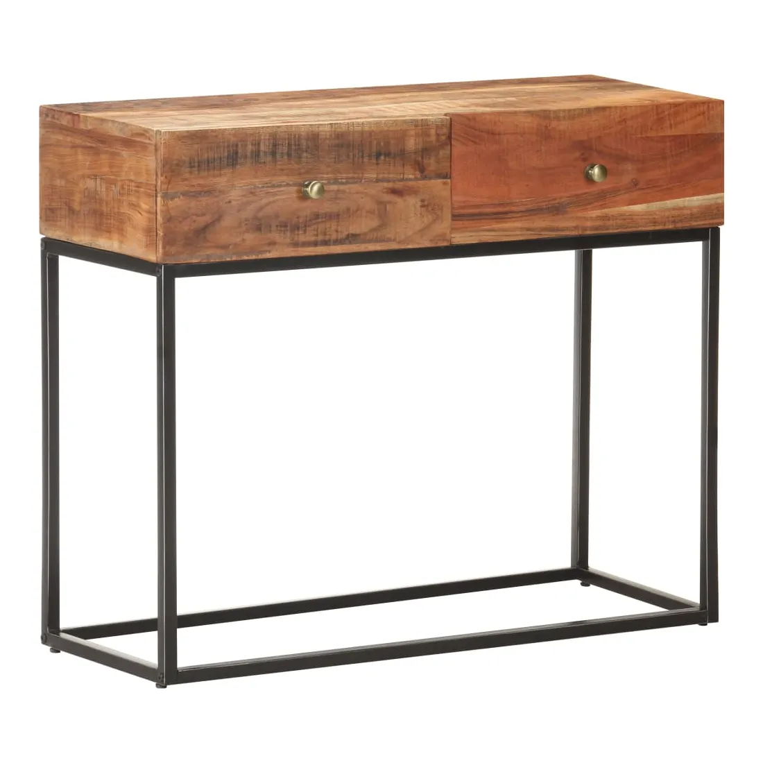 Introduisez un air de charme industriel dans votre décoration intérieure avec cette élégante table console en bois ! Cette armoire de couloir est fabriquée en bois d'acacia brut massif, ce qui la rend robuste et stable. Le savoir-faire artisanal et les belles veines du bois rendent chaque meuble unique et légèrement différent l'un de l'autre. La table console est équipée de 2 tiroirs, offrant amplement d’espace pour garder tous les articles que vous souhaitez bien organisés. De plus, la base en fer ajoute à sa robustesse. Remarque importante : les veines et les couleurs du bois varient d’une pièce à l’autre, ce qui rend chaque meuble sous miroir unique.