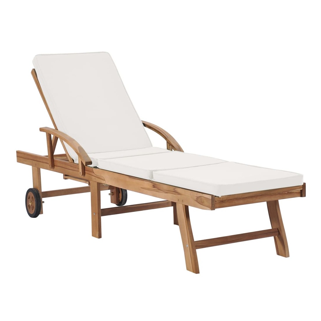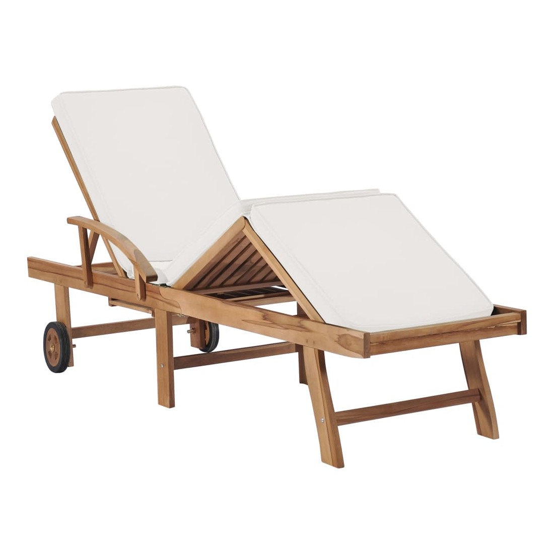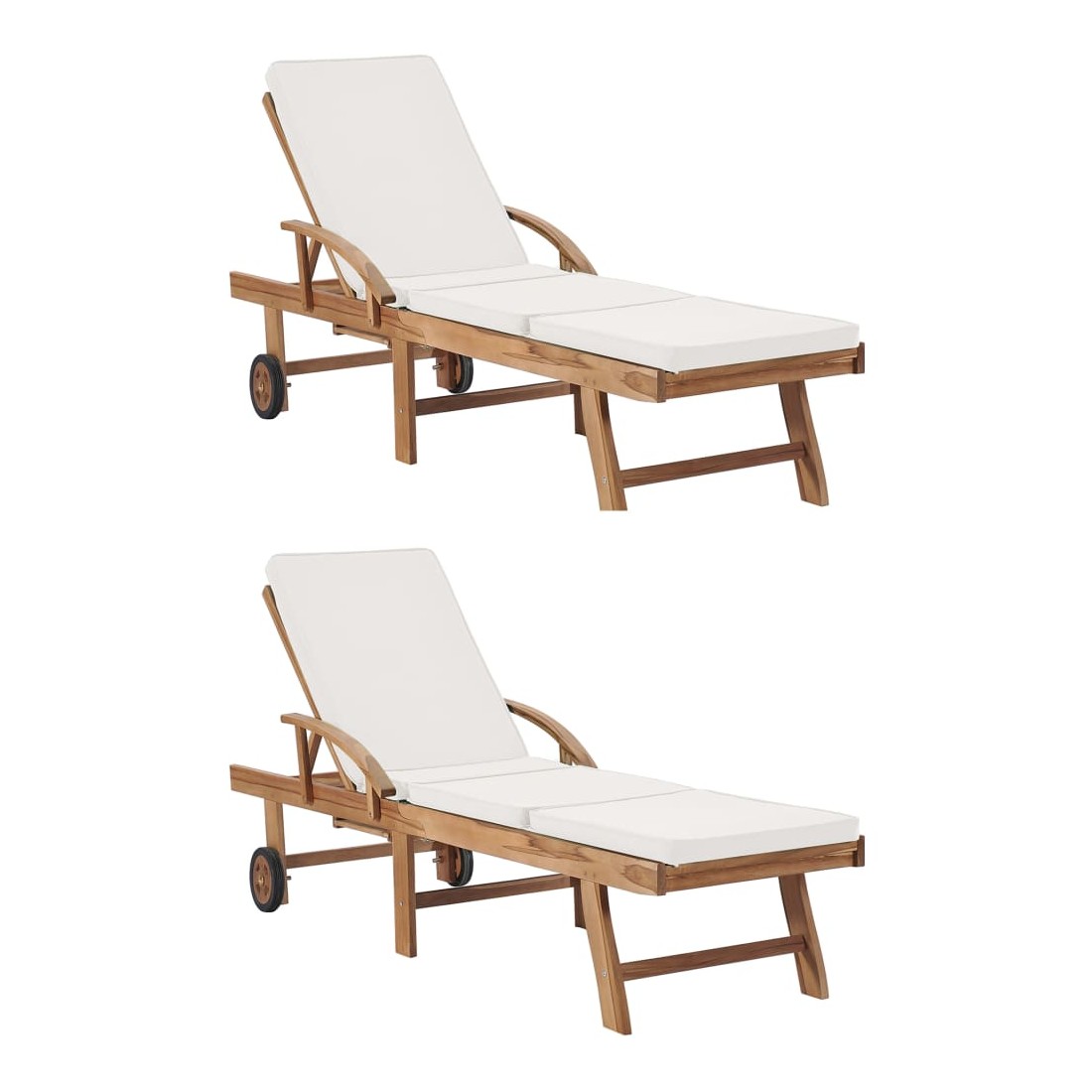 Ces 2 chaises longues en bois de teck ont une conception attrayante et ajouteront une touche de charme rustique à votre jardin, terrasse ou autre espace extérieur. Fabriquée en bois dur de teck extrêmement durable, cette pièce de meuble en teck a été chevronnée, séchée au four puis finement poncée pour lui donner un aspect très lisse. Le bois de teck est connu pour sa résistance exceptionnelle aux intempéries, ce qui le rend bien plus adapté aux meubles de jardin que tout autre type de bois. Le bois de teck est le choix idéal si vous souhaitez acheter une pièce de meubles de jardin durable. Les produits sont appliqués avec une belle finition pour donner au bois une couleur chaude. Les chaises longues sont équipées de 2 roulettes pour pouvoir les déplacer facilement. Les coussins inclus rendent les transats encore plus confortables. Ils disposent des tables coulissantes pratiques sur lesquelles vous pouvez garder votre téléphone, vos lunettes de soleil, vos boissons et autres petits objets à portée de main. Leurs dossiers peuvent être ajustés dans 3 positions, de la verticale à l'horizontale. Les repose-pieds sont également réglables. Détendez-vous et profitez du soleil sur ces chaises longues confortables !