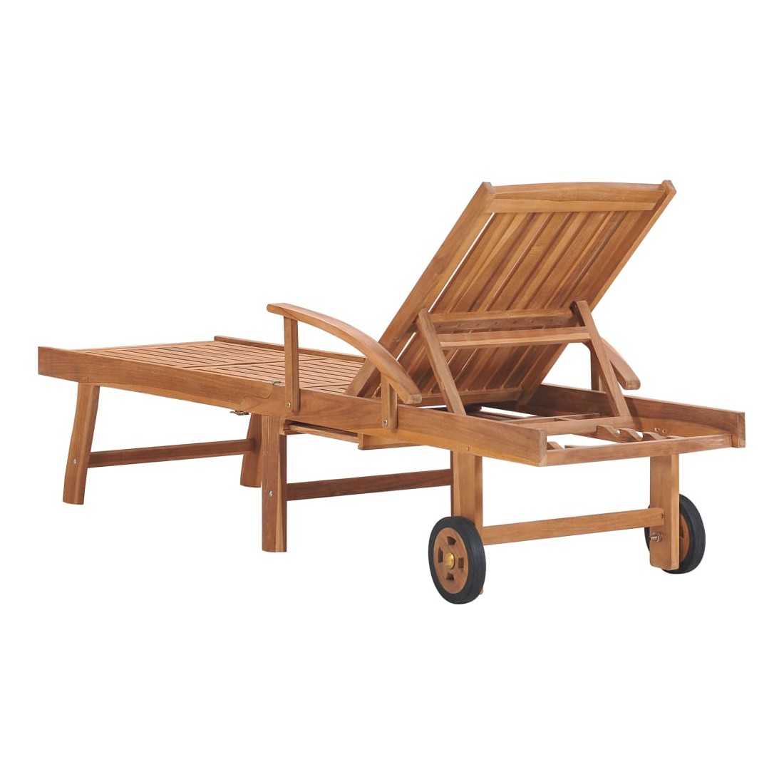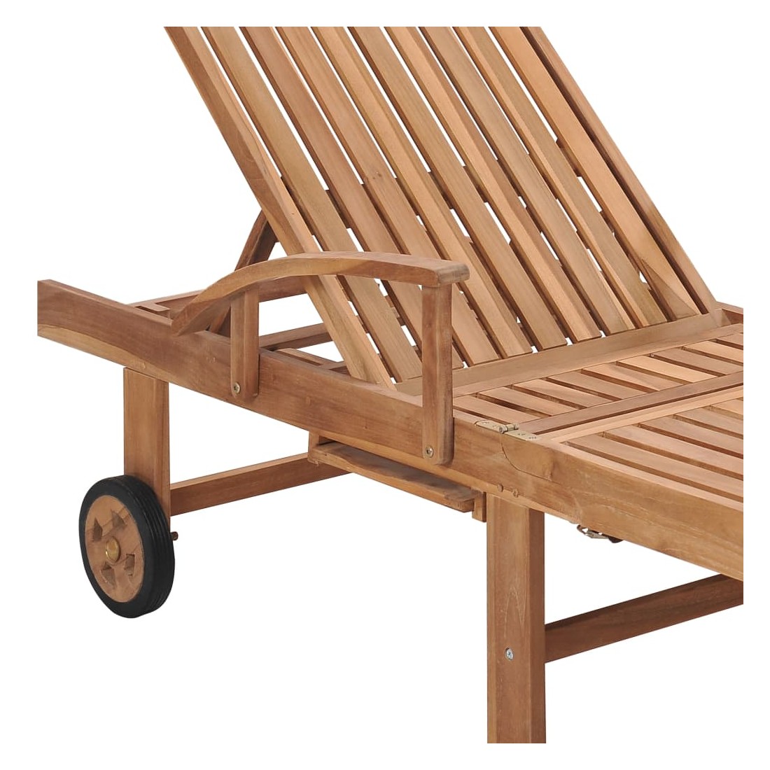 Cette chaise longue classique en bois avec un design à lattes attrayant, ajoute une touche de charme rustique à votre jardin, patio, terrasse de la piscine ou tout espace extérieur. Fabriquée en bois dur de teck extrêmement durable, cette pièce de meuble en teck a été chevronnée, séchée au four puis finement poncée pour lui donner un aspect très lisse. Le bois de teck est connu pour sa résistance exceptionnelle aux intempéries, ce qui le rend bien plus adapté aux meubles de jardin que tout autre type de bois. Le bois de teck est le choix idéal si vous souhaitez acheter une pièce de meubles de jardin durable. Le lit de repos est équipé de 2 roues, pour le déplacer facilement. Le dossier peut être ajusté dans 4 positions, de la position assise entièrement droite à la position complètement à plat. Les lattes du siège et du dossier offrent également un excellent soutien et un grand confort et deux accoudoirs offrent un endroit pour reposer vos bras. De plus, le coussin inclus est plus qu'un supplément pratique ; il a également une fonction décorative. Remarque : afin de prolonger la durée de vie des meubles d'extérieur, nous vous recommandons de les protéger avec une housse imperméable.