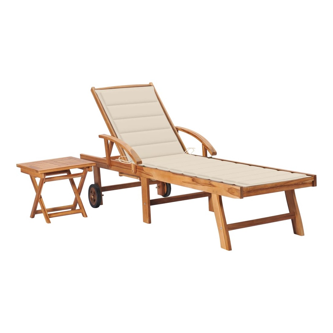 Avec cette chaise longue en bois, vous aurez toujours un endroit confortable pour vous détendre sur votre terrasse ou dans votre jardin. La structure en bois unique dégage un charme naturel. Fabriquée en bois dur de teck extrêmement durable, cette pièce de meuble en teck a été chevronnée, séchée au four puis finement poncée pour lui donner un aspect très lisse. Le bois de teck est connu pour sa résistance exceptionnelle aux intempéries, ce qui le rend bien plus adapté aux meubles de jardin que tout autre type de bois. Le bois de teck est le choix idéal si vous souhaitez acheter une pièce de meubles de jardin durable. Équipée de 2 roues, la chaise longue d'extérieur peut être déplacée facilement. Le dossier peut être réglable en 3 positions, de la position assise entièrement droite à la position complètement à plat. Le marchepied est également réglable pour plus de confort. Les lattes du siège et du dossier offrent également un excellent soutien et un grand confort, et deux accoudoirs offrent un endroit pour reposer vos bras. De plus, la table d'appoint vous permet de placer vos téléphones, lunettes de soleil, boissons, ainsi que d'autres petits objets à portée de main. Le coussin inclus est plus qu'un supplément pratique ; il a également une fonction décorative. Remarque : afin de prolonger la durée de vie des meubles d'extérieur, nous vous recommandons de les protéger avec une housse imperméable.